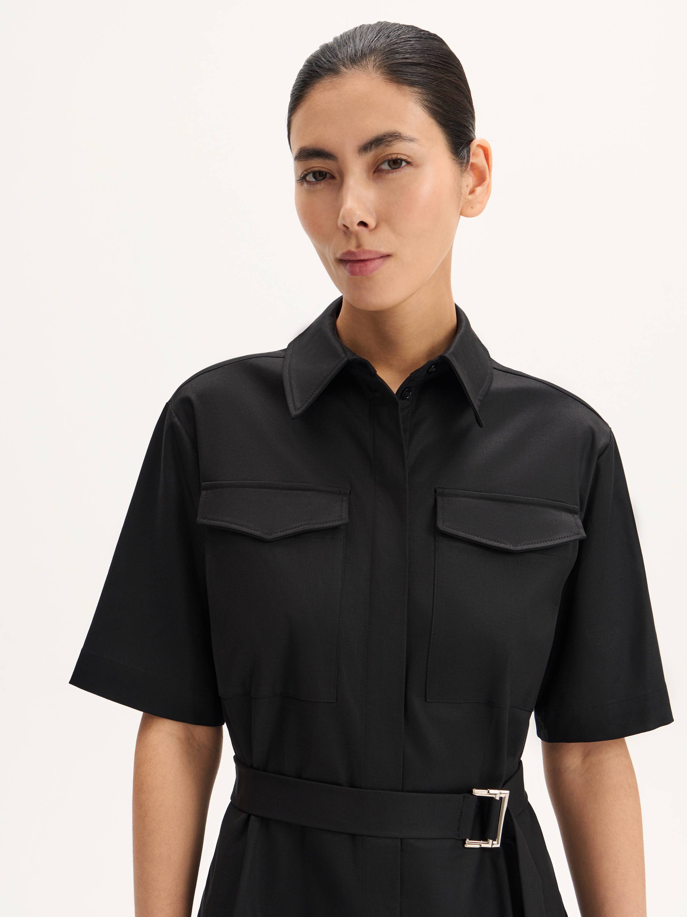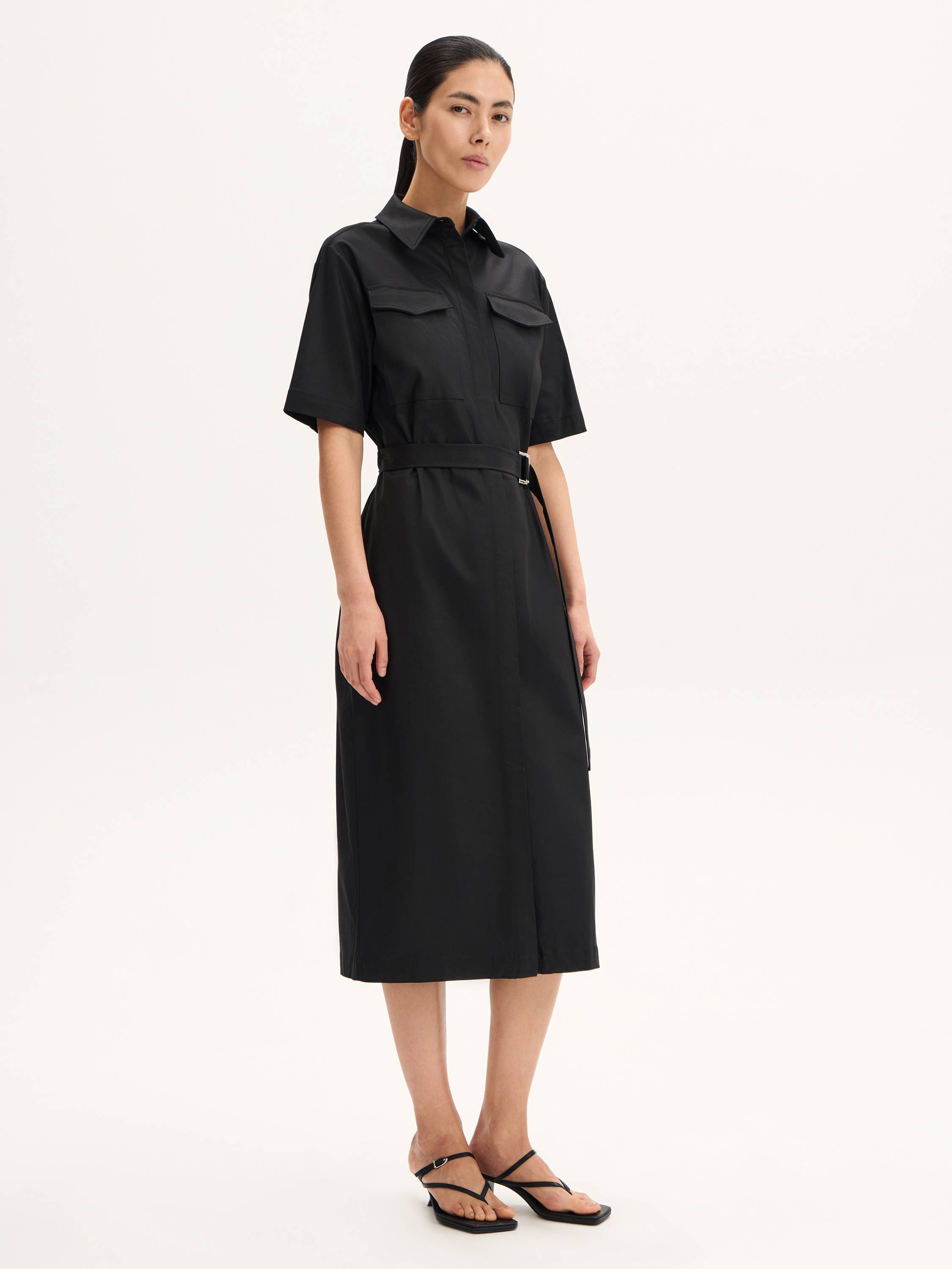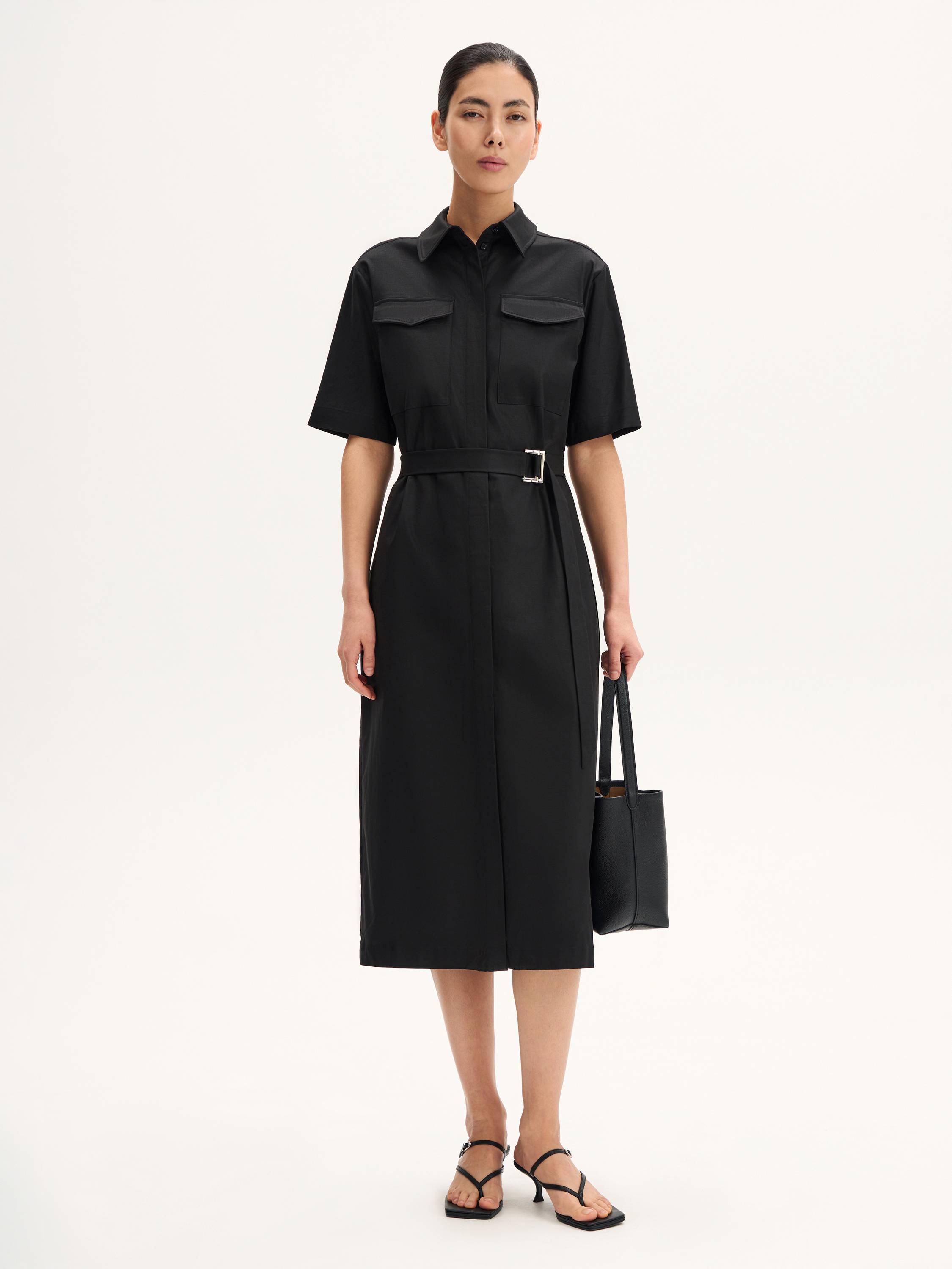 Платье-рубашка с мягкой отсылкой к стилю сафари. Прямой крой, потайная застежка и накладные нагрудные карманы придают образу четкость и структуру. Пояс с пряжкой фиксирует силуэт по талии, а сборка сзади создает комфортную посадку и легкий объем. Модель выполнена из материала с высоким содержанием тенсела — волокна, полученного из древесины эвкалипта. Ткань приятно охлаждает кожу, отлично пропускает воздух и практически не мнется, сохраняя аккуратный вид в течение дня. Благодаря матовой текстуре и выразительным деталям это платье одинаково уместно и в городе, и в отпуске.