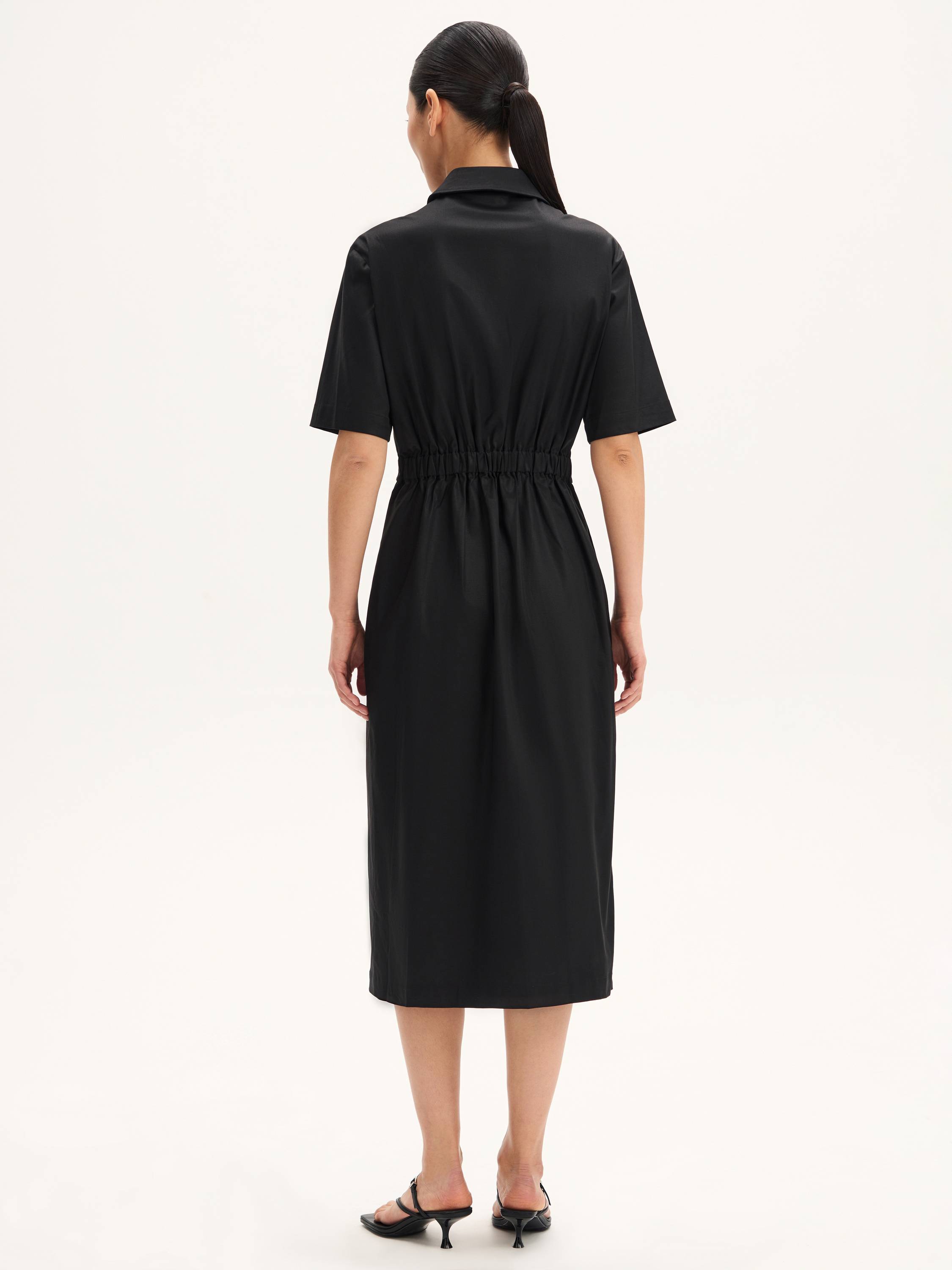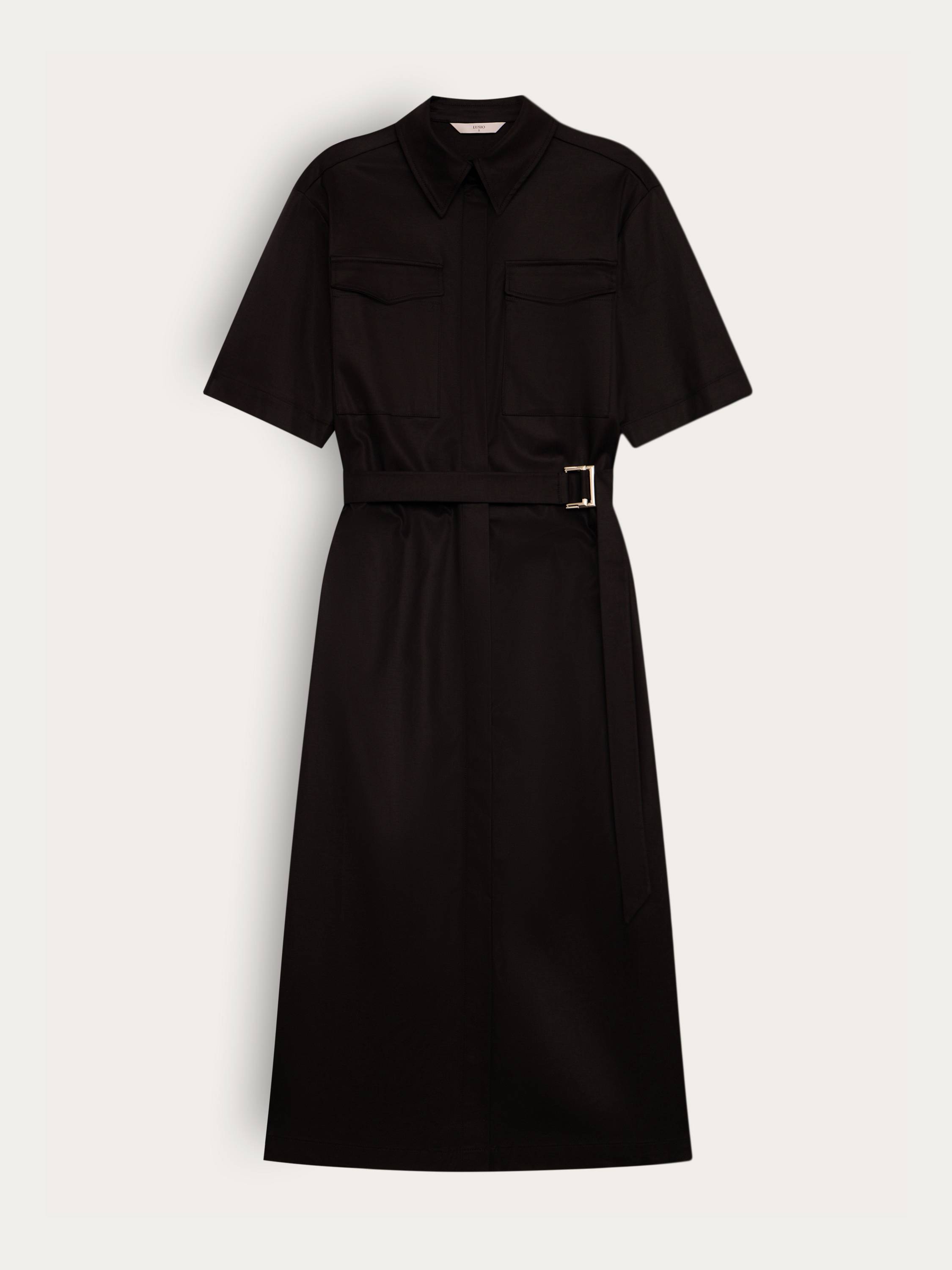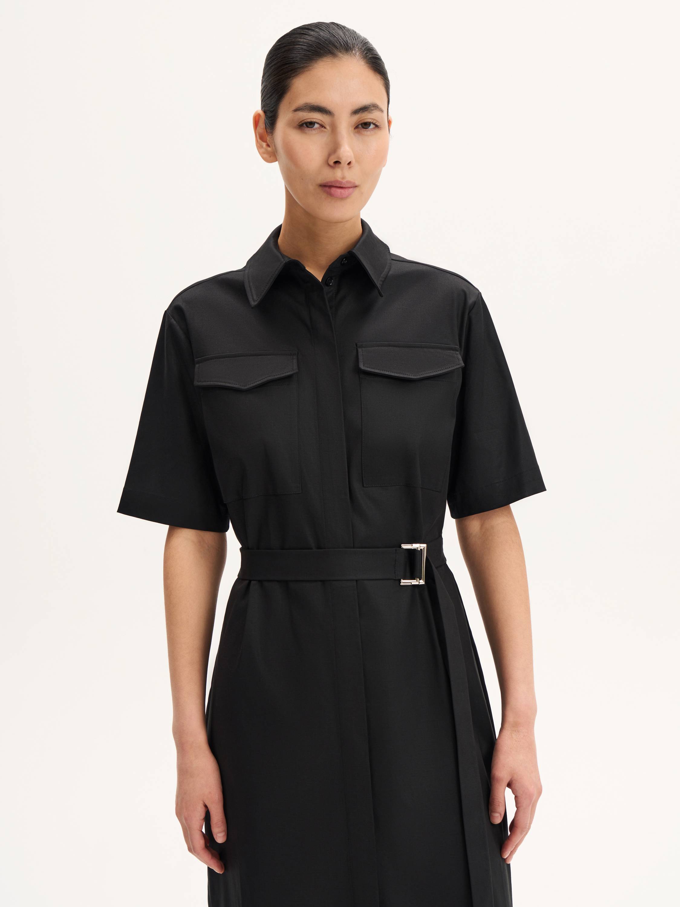 Платье-рубашка с мягкой отсылкой к стилю сафари. Прямой крой, потайная застежка и накладные нагрудные карманы придают образу четкость и структуру. Пояс с пряжкой фиксирует силуэт по талии, а сборка сзади создает комфортную посадку и легкий объем. Модель выполнена из материала с высоким содержанием тенсела — волокна, полученного из древесины эвкалипта. Ткань приятно охлаждает кожу, отлично пропускает воздух и практически не мнется, сохраняя аккуратный вид в течение дня. Благодаря матовой текстуре и выразительным деталям это платье одинаково уместно и в городе, и в отпуске.