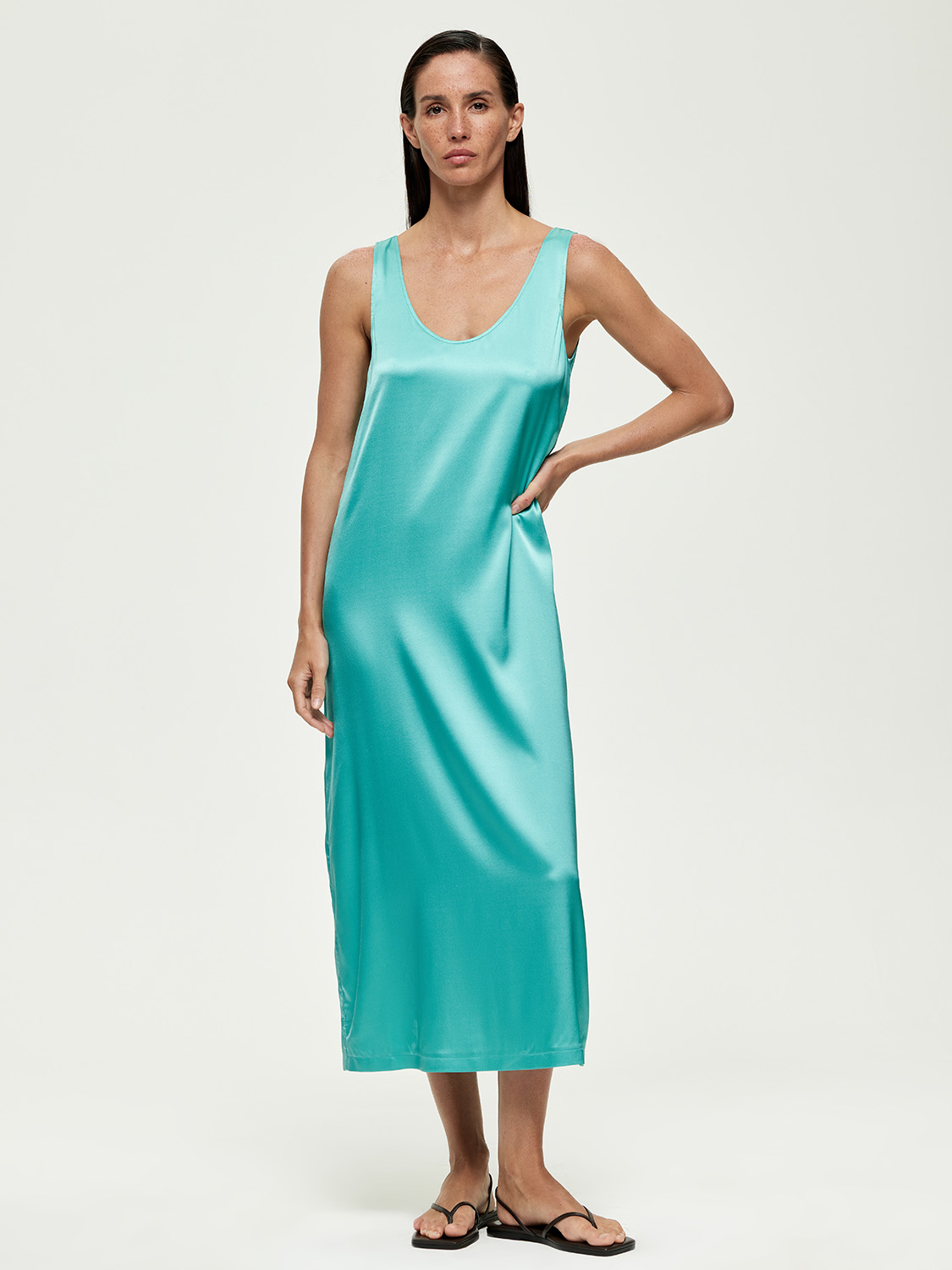 Лаконичное и роскошное шелковое платье-комбинация – эталон элегантного и непринужденного лоска. Простота и отсутствие деталей не отвлекают внимание от изящного женственного силуэта. Комфортная ширина бретелей и свободный крой добавляют удобства. Вырез визуально вытягивает шею и деликатно подчеркивает ключицы. Выполнено из натурального шелка, который шикарно драпируется и благородно переливается. Дополняйте босоножками и сандалиями, лоферами и кедами. Для работы сочетайте со структурными жакетами, а для отдыха с льняными рубашками. На модели размер S. Параметры модели: рост 177, 83-61-89.