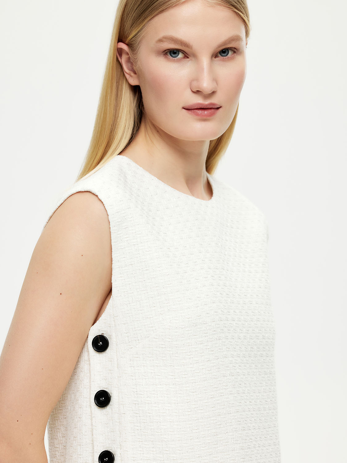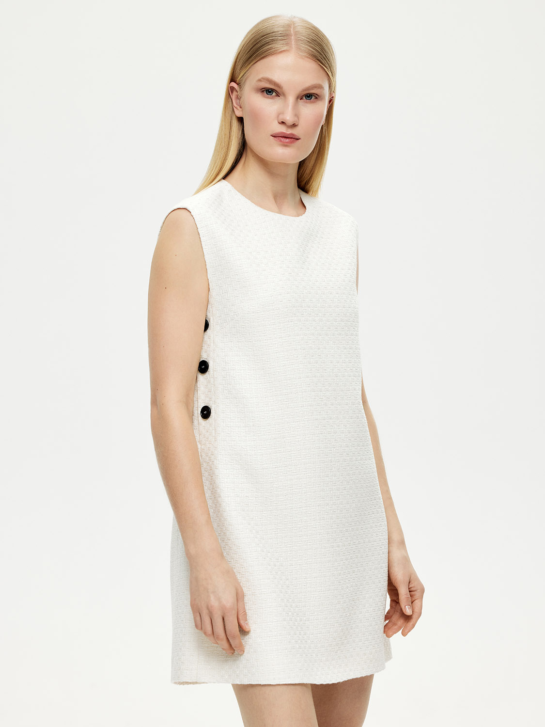 Короткое платье без рукавов в стиле 60-х. Выполнено из смесового фактурного полотна с деликатным переливом. А-силуэт подходит для разных типов фигуры. А за счет свободного кроя комфортно и для девушек в положении. За яркие акценты отвечают контрастные пуговицы по бокам. Можно носить платье на голое тело или надевать поверх водолазок и джемперов, создавая многослойные варианты. В качестве обуви выбирайте туфли и босоножки для вечерних выходов или лоферы и высокие сапоги на каждый день. На модели размер S.