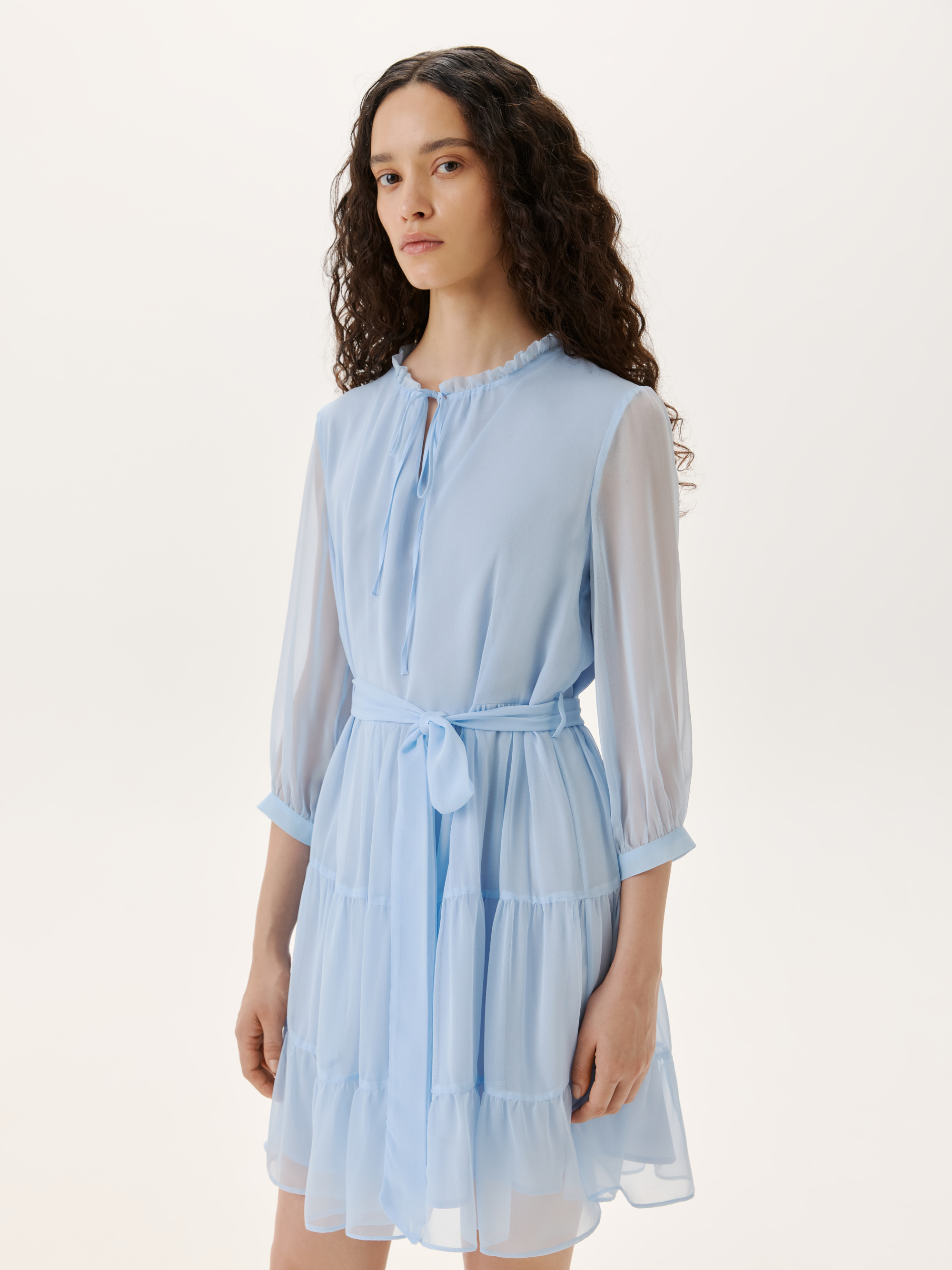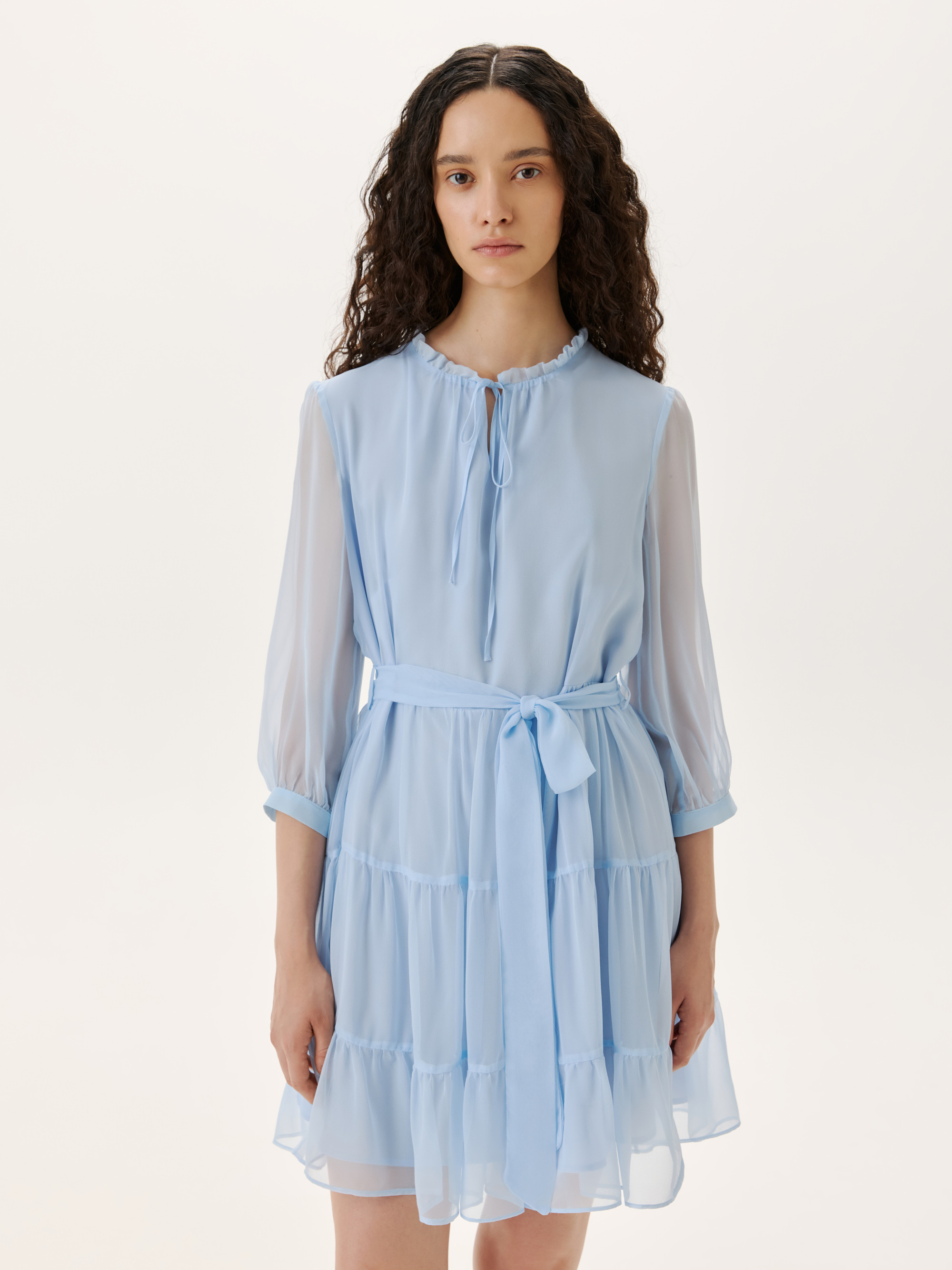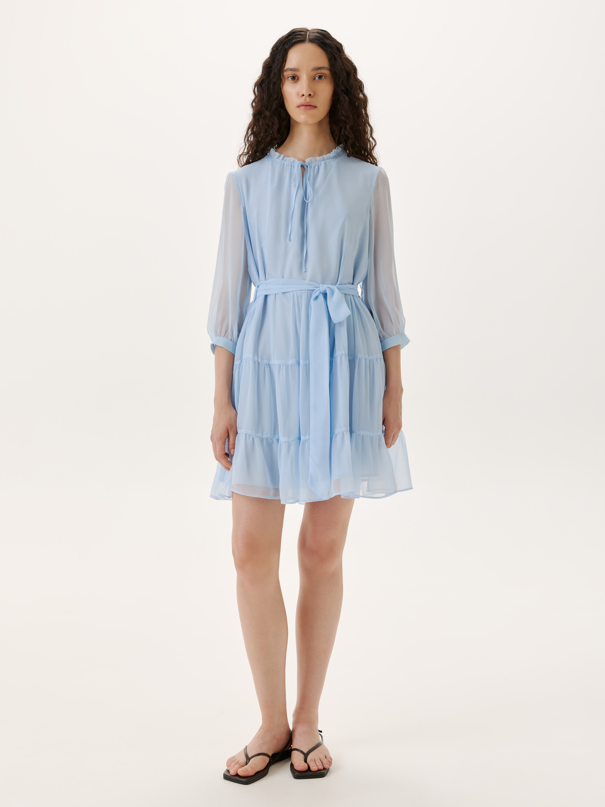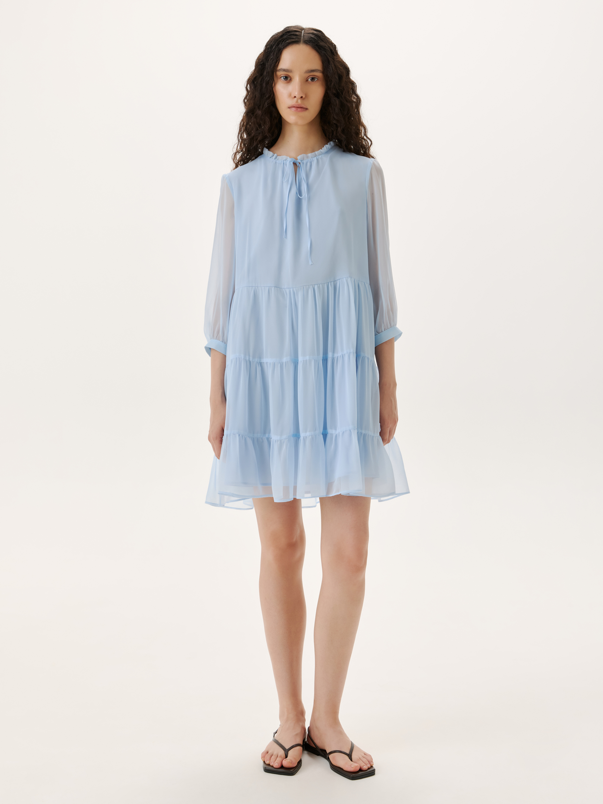 Элегантное мини платье из нежного шелка станет фаворитом летнего гардероба. Материал отличается легкостью и воздухопроницаемостью, что обеспечивает комфорт в жаркие дни. Свободный крой и многослойные оборки придают изделию романтичный и утонченный вид, а полупрозрачные рукава и акцентные завязки на вырезе добавляют изящества. Сочетайте платье с легкими сандалиями для повседневного образа или элегантными босоножками для вечерних выходов. На модели размер S. Параметры модели: рост 177, 75-61-90.