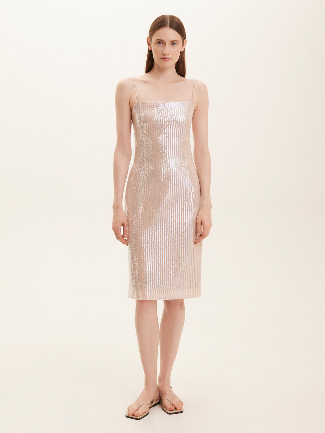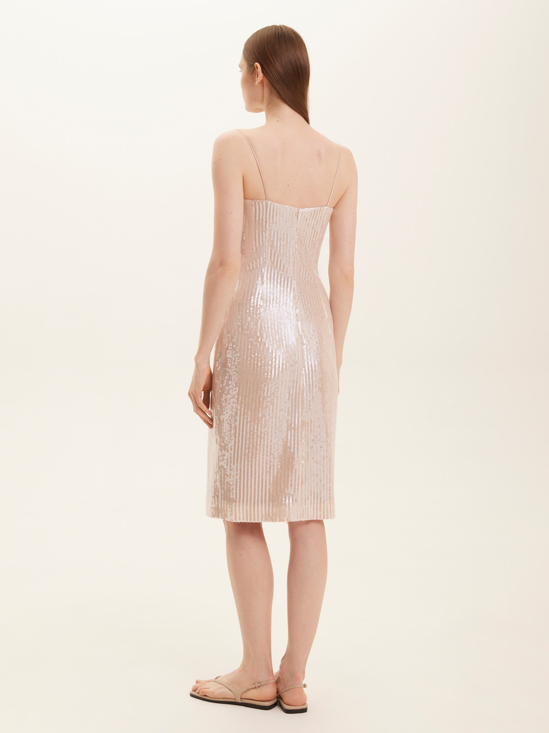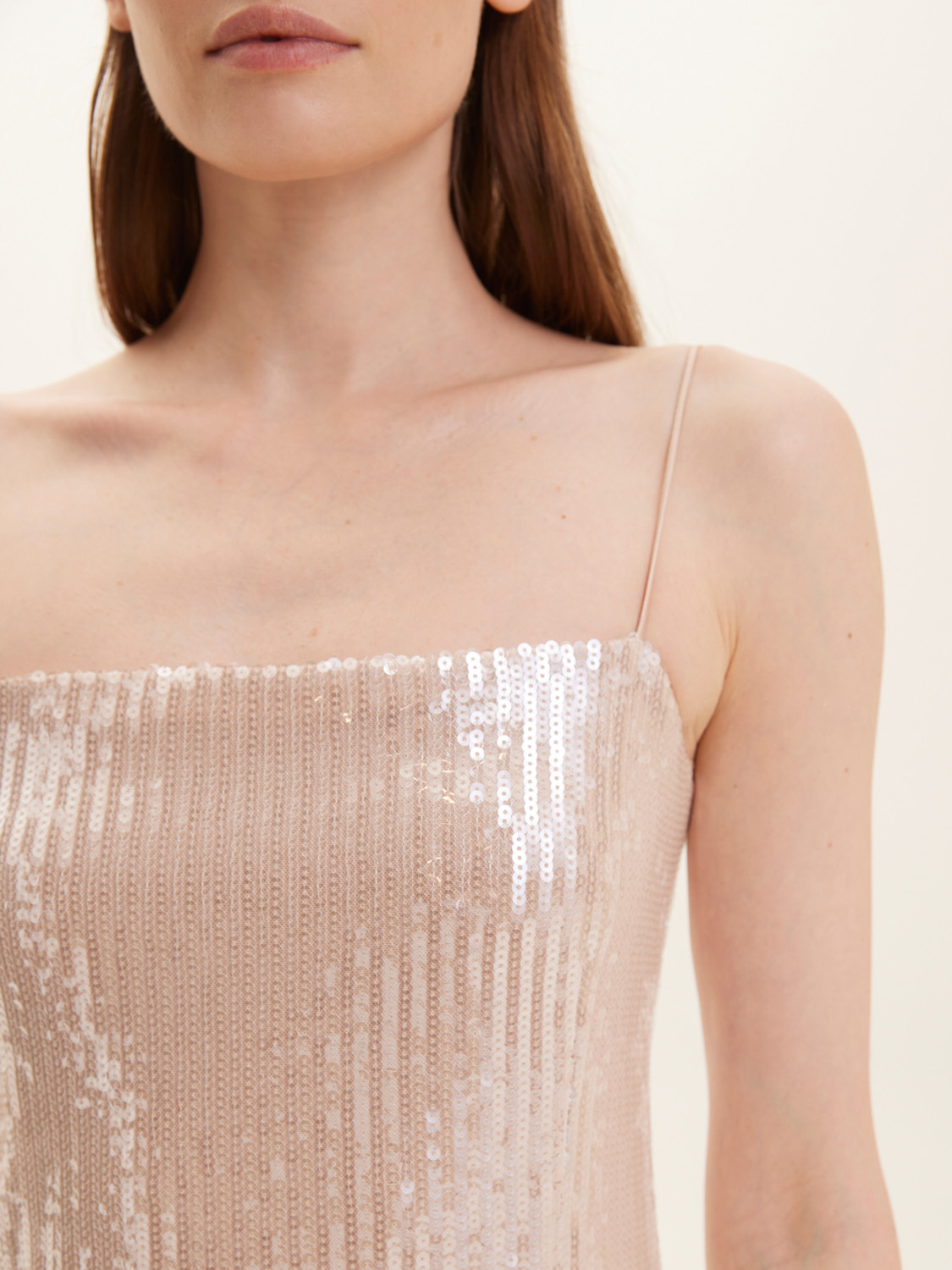 Эффектное мини-платье, расшитое пайетками. Облегает фигуру, создавая элегантный и соблазнительный силуэт. Тонкие бретели и квадратный вырез добавляют образу изысканности и современности. Платье, сверкающее пайетками, идеально подходит для вечерних мероприятий и торжественных случаев, привлекая внимание и создавая незабываемый эффект. Сочетайте его с элегантными босоножками и стилизуйте аксессуарами для завершения образа. На модели размер S. Параметры модели: рост 177, 82-62-88.