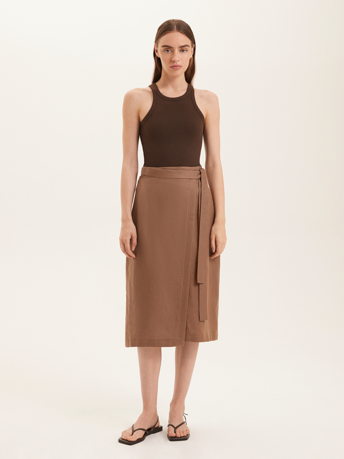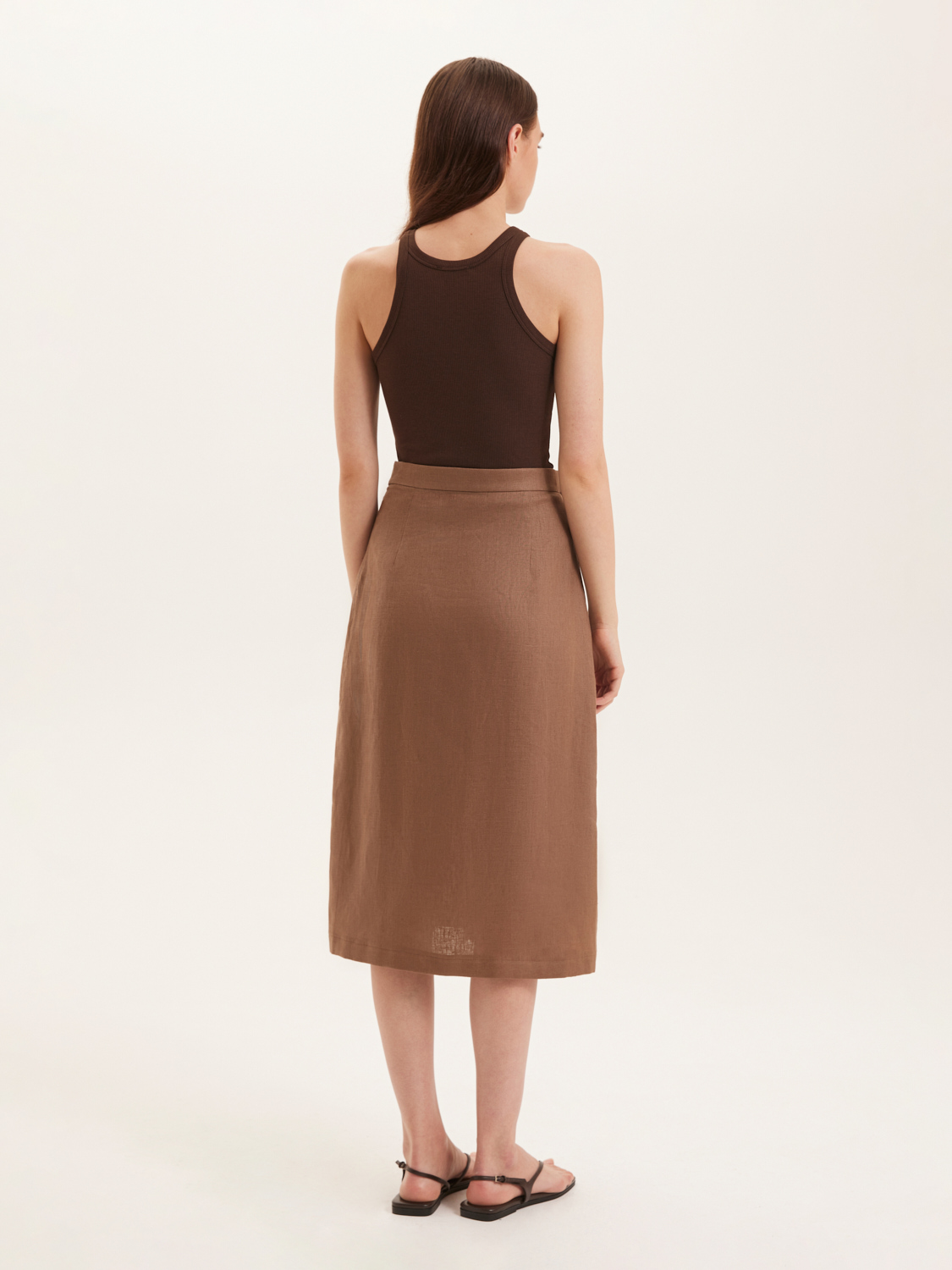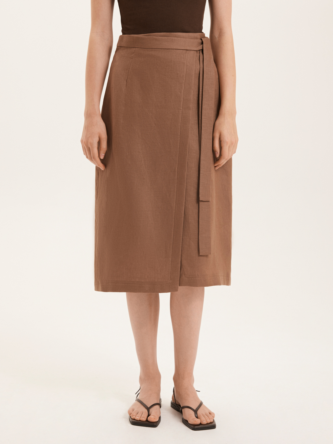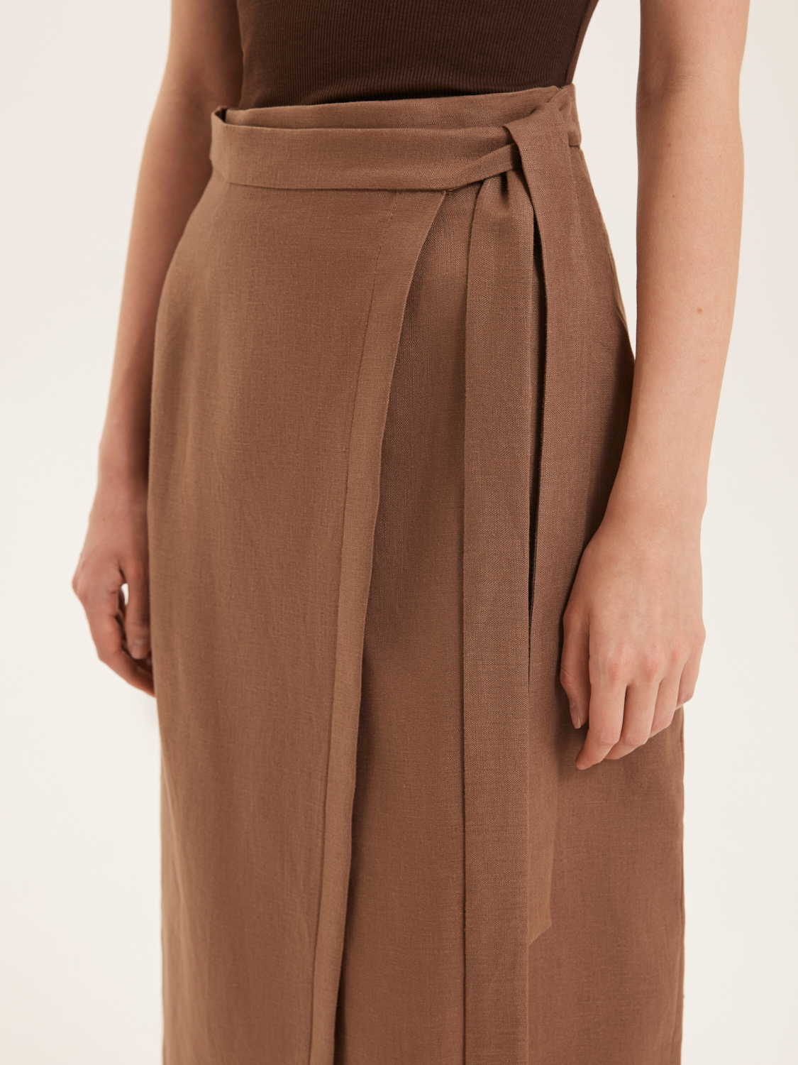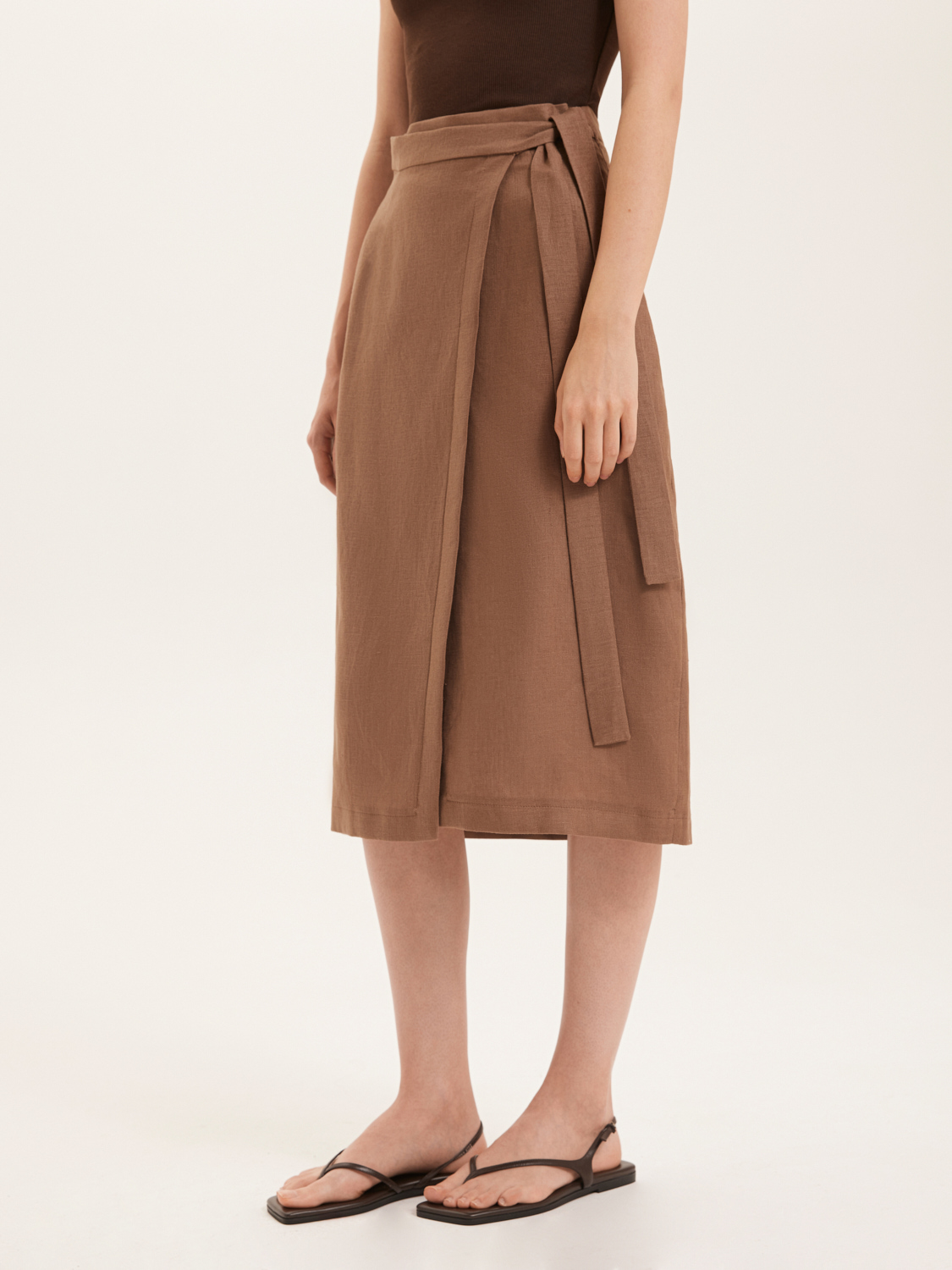 Юбка миди прямого кроя изо льна. Натуральный лен обеспечивает отличную воздухопроницаемость и легкость, делая юбку идеальной для теплых дней. Модель с запахом и завязками на талии подчеркивает фигуру и добавляет элегантности образу. Длина миди придает юбке утонченность и делает её универсальной для различных мероприятий – от повседневных прогулок до деловых встреч. Сочетайте юбку с легкими топами, блузками или футболками, дополняя образ сандалиями или босоножками. На модели размер S. Параметры модели: рост 174 см, 86-63-90.