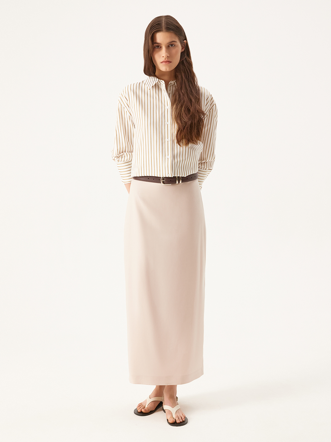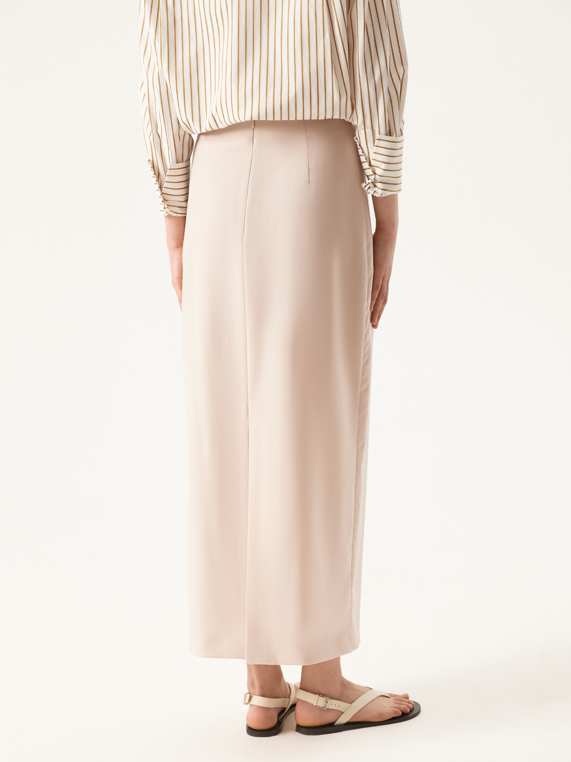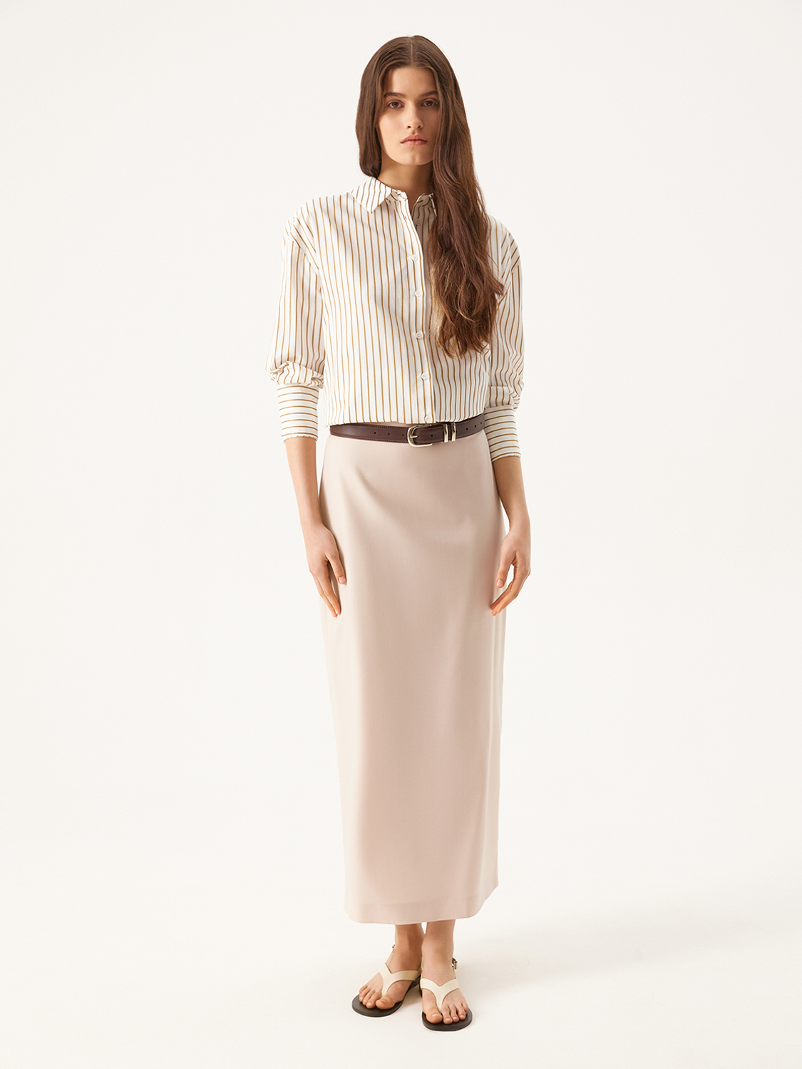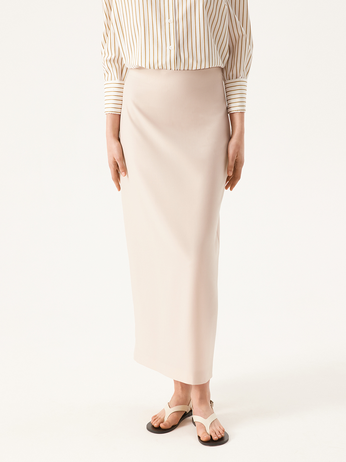 Юбка миди из шерсти – прекрасный выбор для создания элегантного и комфортного образа. Натуральная шерсть обеспечивает тепло и уют, делая юбку подходящей для прохладных дней. Прямой крой выгодно подчеркивает фигуру, создавая изящный силуэт. Юбка обладает минималистичным дизайном, который позволяет легко сочетать ее с различными блузками, свитерами и рубашками, создавая множество стильных комбинаций. Длина юбки доходит до щиколоток, что придает образу строгость и утонченность. Скрытая молния на спине обеспечивает удобство при надевании и сохраняет чистоту линий. Сочетайте юбку с туфлями или ботильонами для создания элегантного образа, либо с сандалиями для более расслабленного стиля. На модели размер S. Параметры модели: рост 172, 84-62-91.