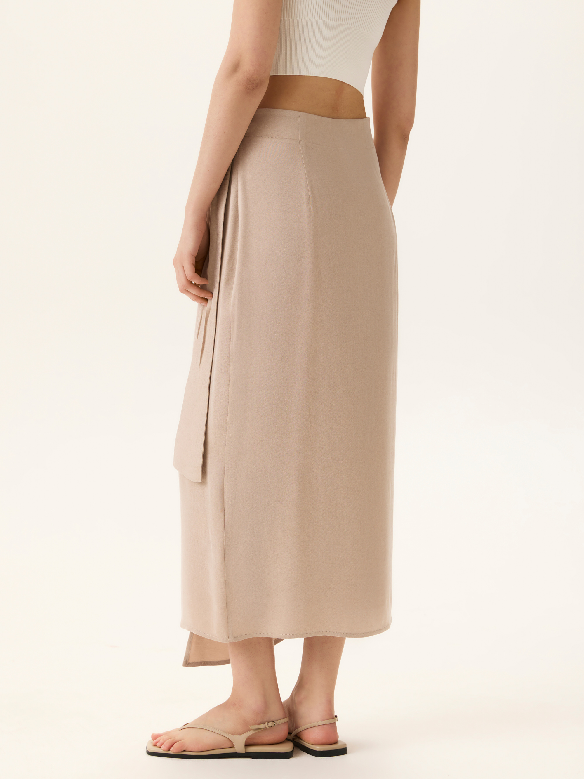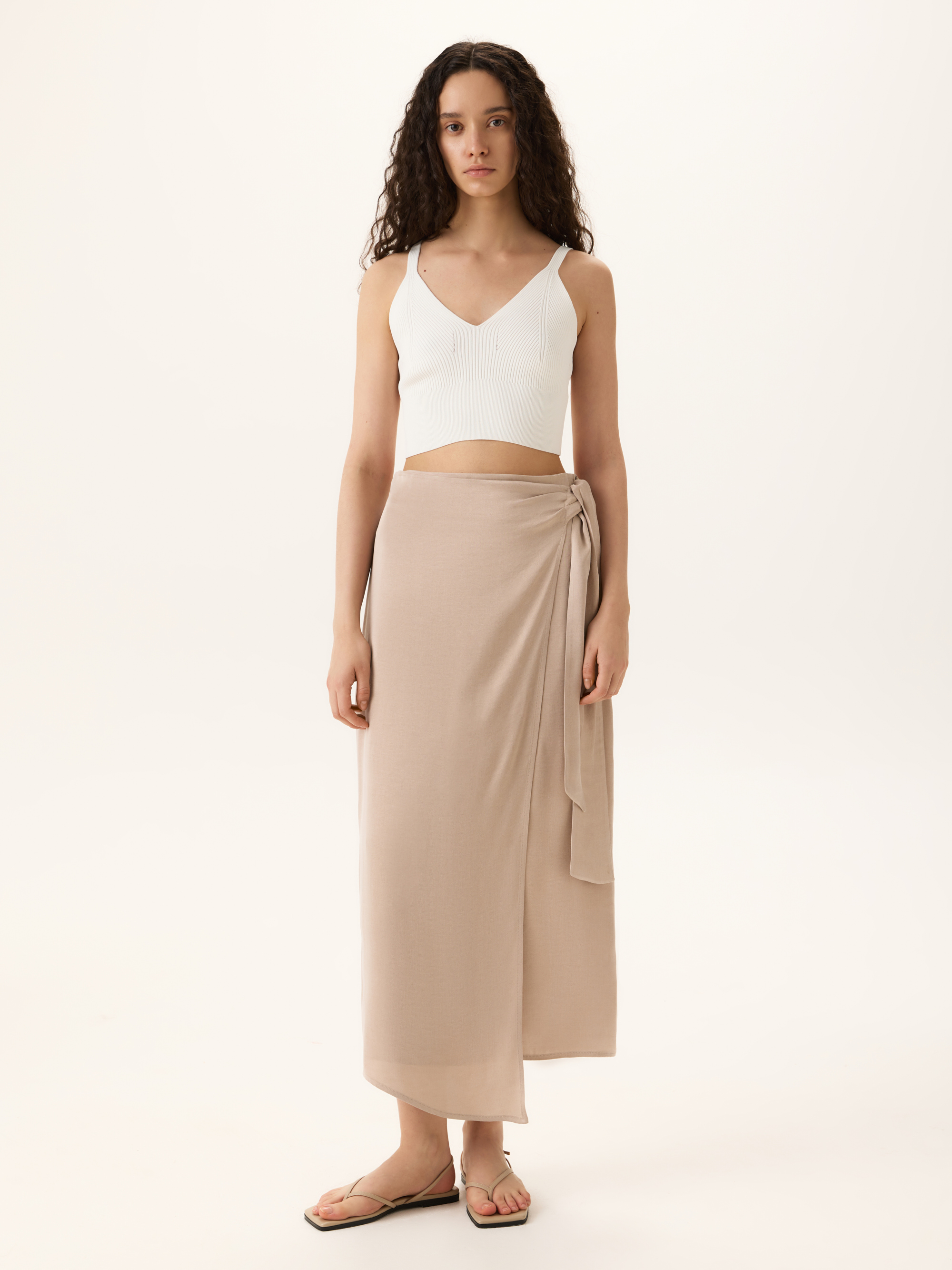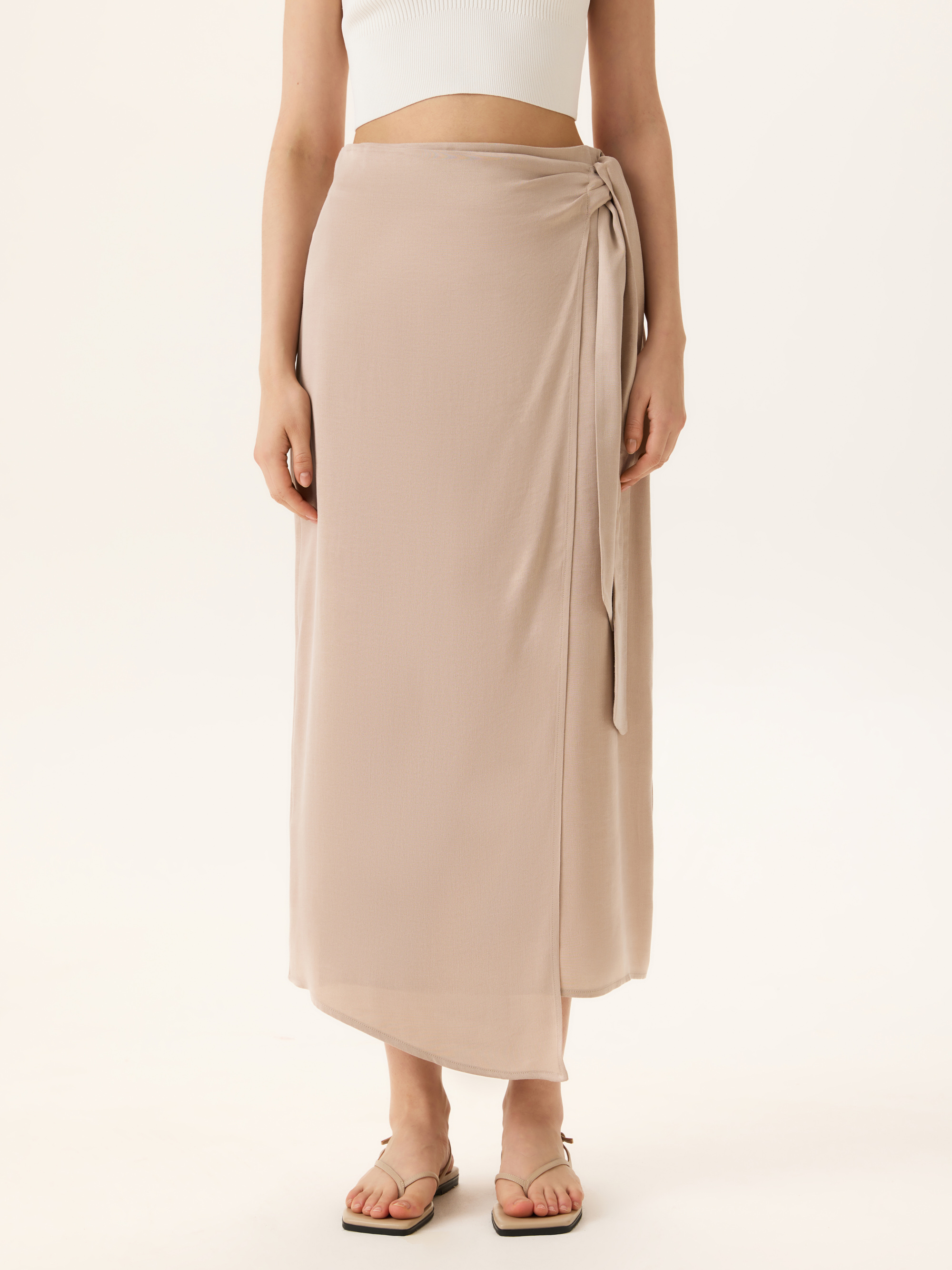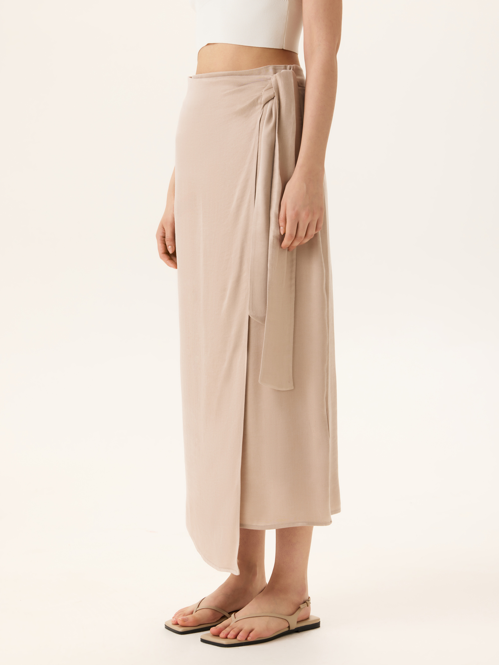 Элегантная юбка на запах с эффектным узлом – идеальный вариант для создания повседневных романтичных образов. Лаконичный крой и универсальная актуальная длина мидакси. Выполнена из гладкого и упругого тенсела с вискозой, которые хорошо держат складки. Материал мягкий, с приятной прохладой. Комбинируйте с кроп-топами, футболками и рубашками. Дополняйте босоножками, сандалиями и кедами.