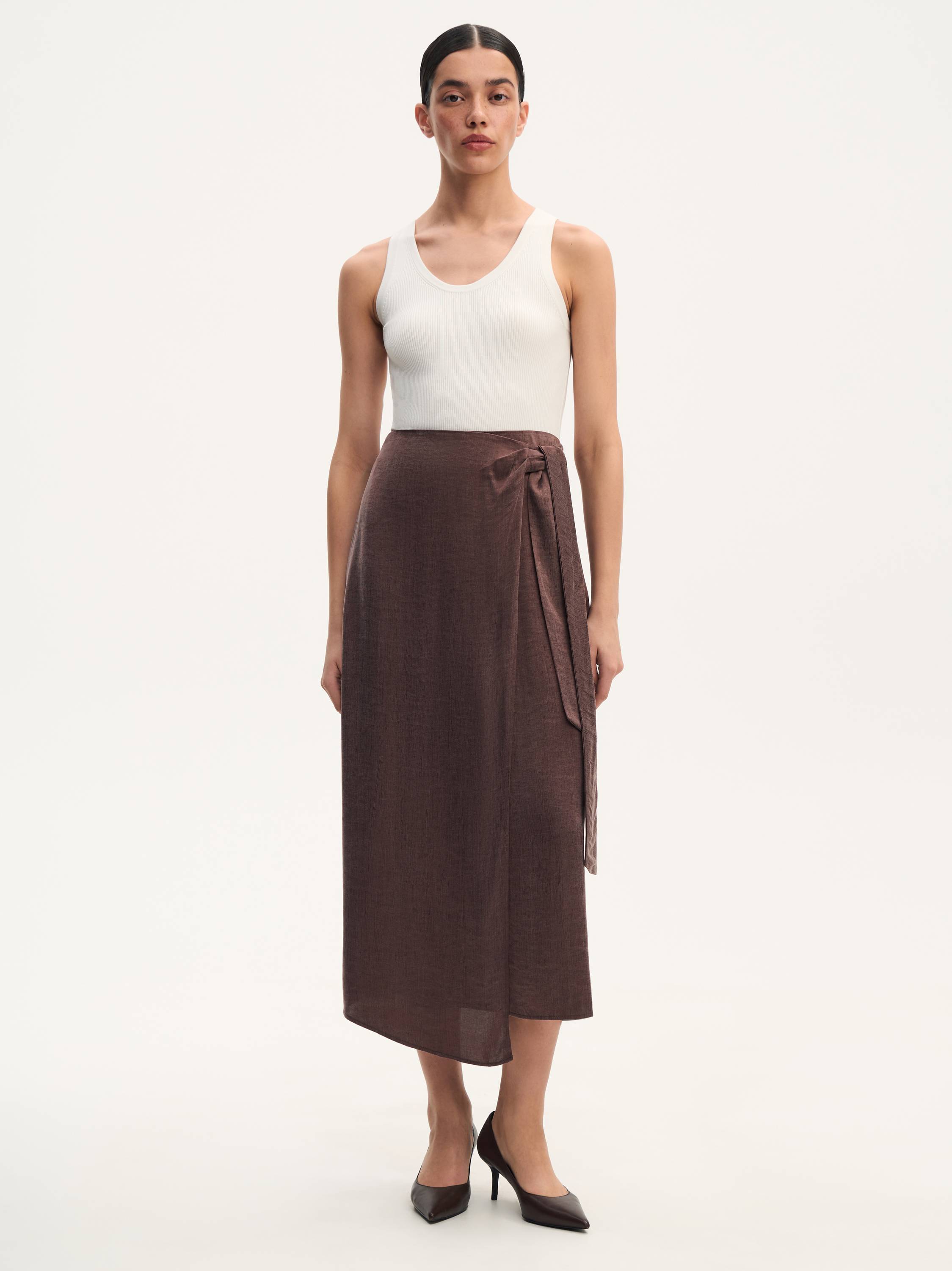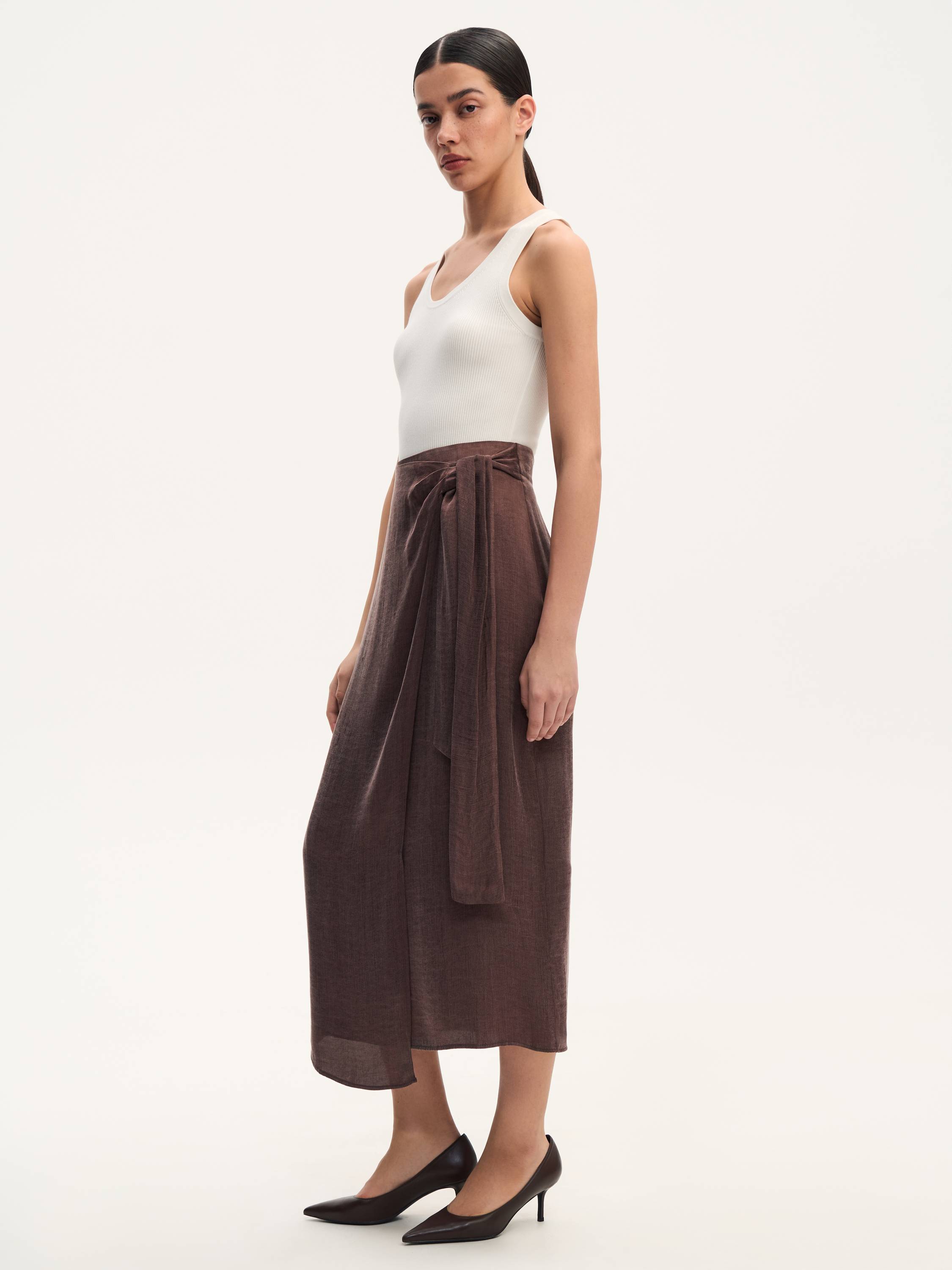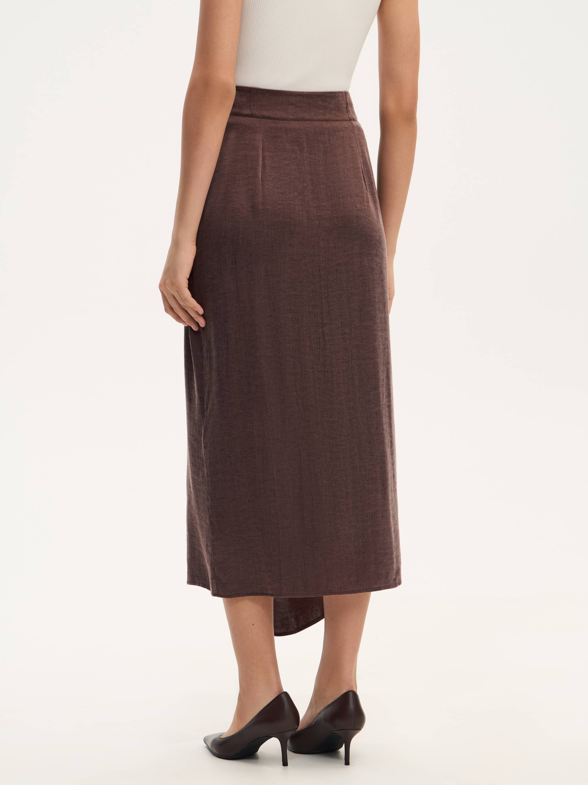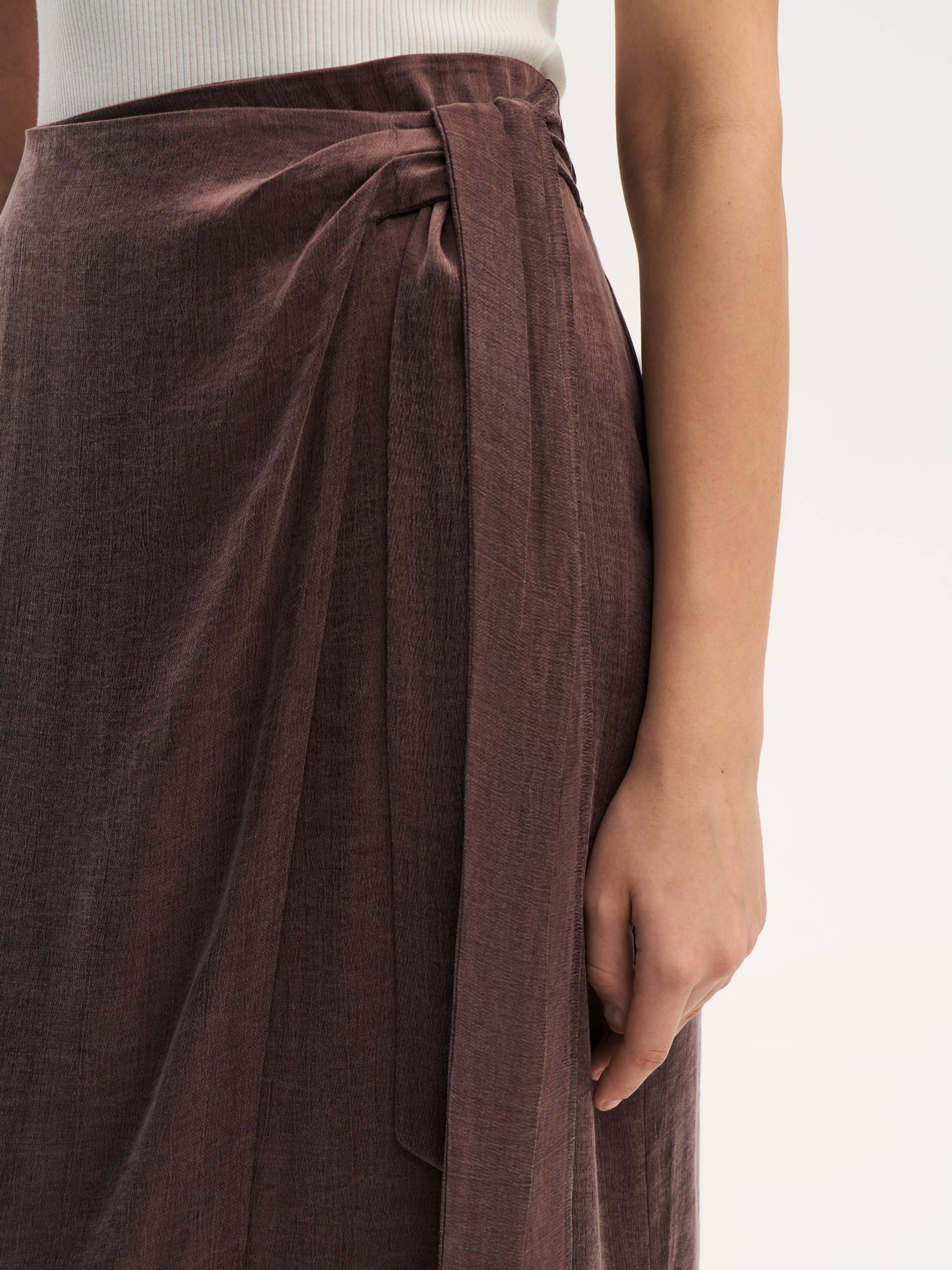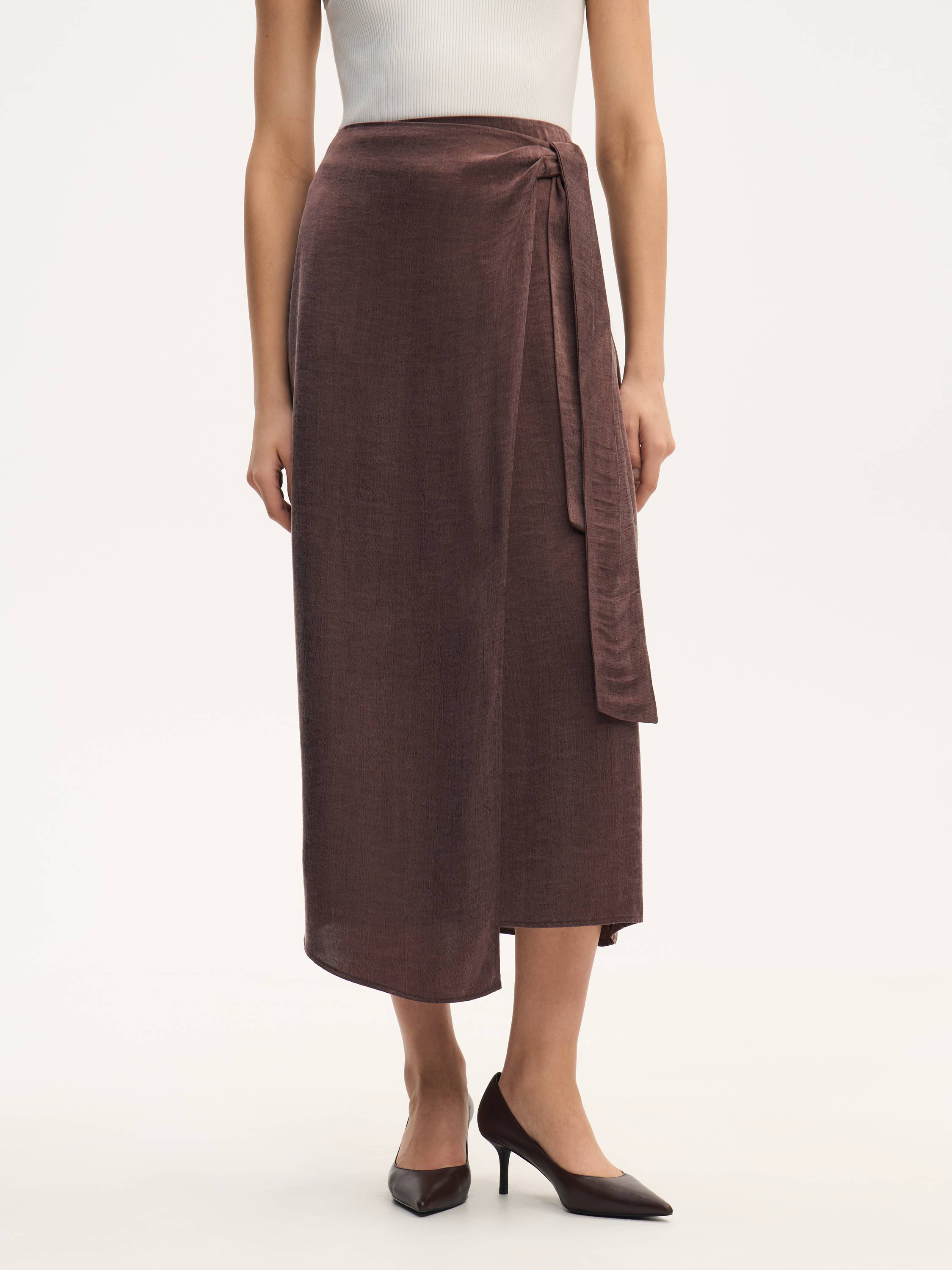 Элегантная юбка на запах с эффектным узлом – идеальный вариант для создания повседневных романтичных образов. Лаконичный крой и универсальная актуальная длина мидакси. Выполнена из гладкого и упругого тенсела с вискозой, которые хорошо держат складки. Материал мягкий, с приятной прохладой. Комбинируйте с кроп-топами, футболками и рубашками. Дополняйте босоножками, сандалиями и кедами.