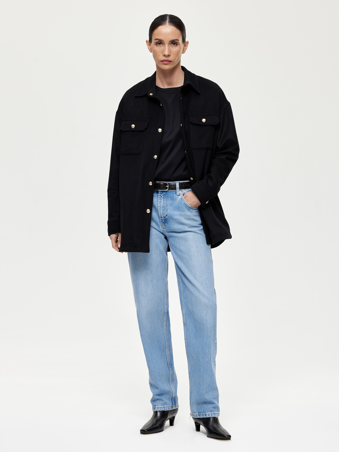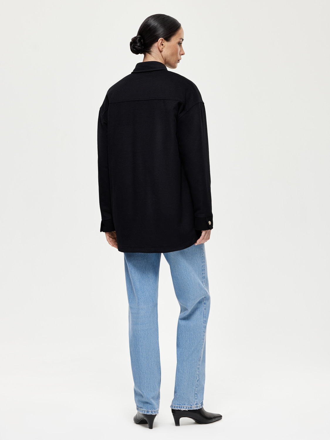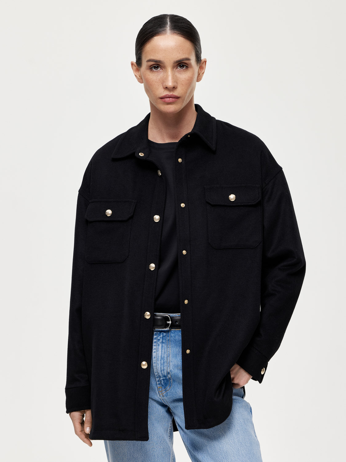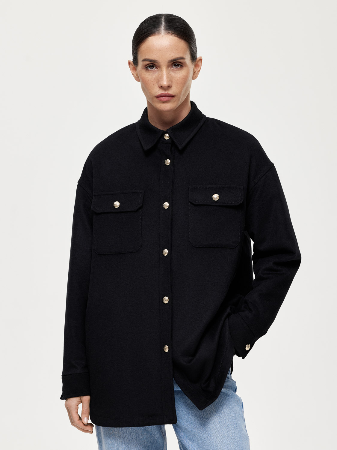 Оверсайз пальто рубашечного кроя из шерсти станет стильным и универсальным элементом гардероба. Плотная ткань из шерсти обеспечивает надежную защиту от холода, делая пальто идеальным выбором для межсезонья. Дизайн включает классический рубашечный воротник, крупные накладные карманы на груди и пуговицы спереди, что придает модели современный и практичный вид. Это пальто отлично сочетается с джинсами и свитером для повседневного образа. Для создания более элегантного стиля можно комбинировать его с брюками и рубашкой. На модели размер S. Параметры модели: рост 177, 83-61-89.