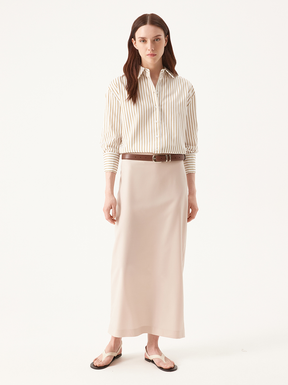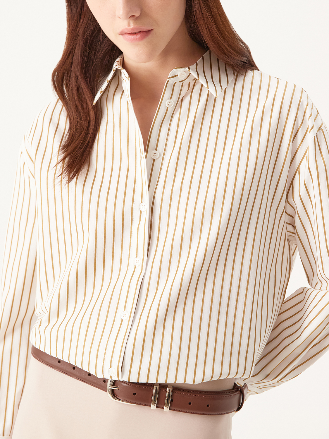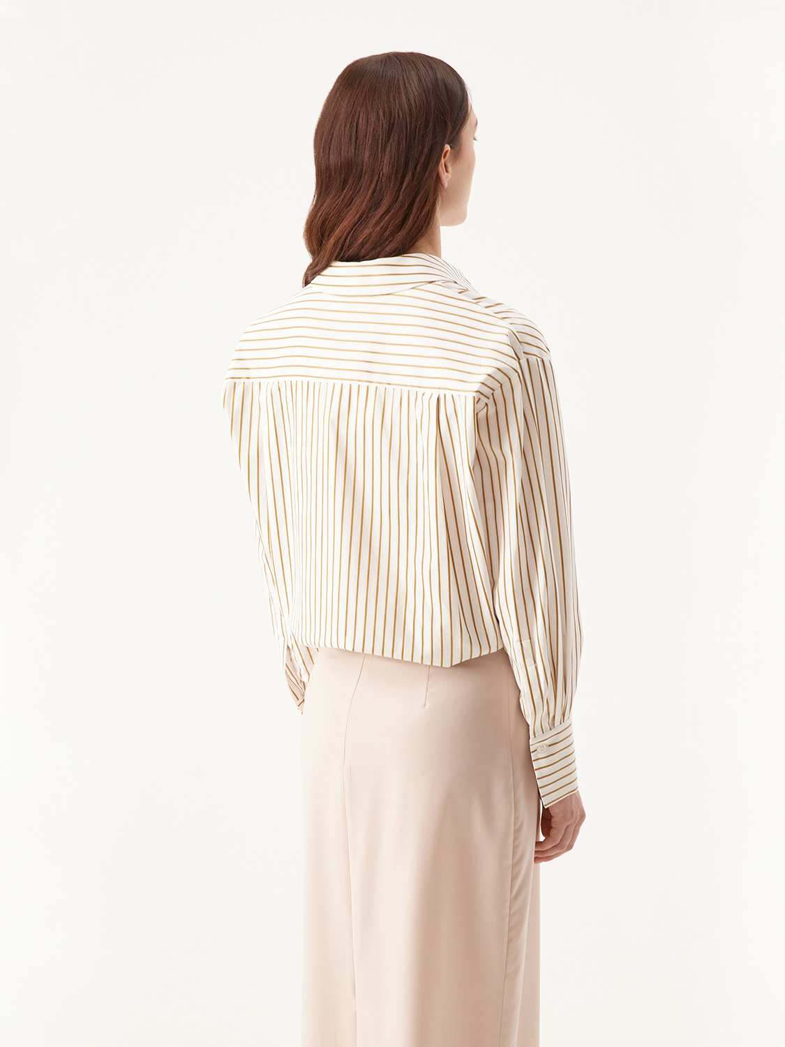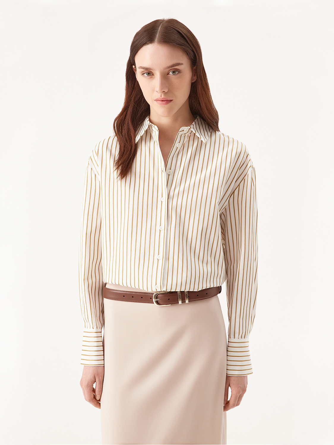 Лаконичная рубашка в полоску прямого кроя со слегка опущенным плечом и широкими манжетами. Отложной ворот, застежка на пуговицы и кокетка на спине. Выполнена из тенсела, который производится из натурального сырья – древесины эвкалипта. Такая ткань легкая и прочная, приятно охлаждающая в жаркую погоду. Универсальная модель, которая впишется в каждый гардероб и создаст непринужденно-расслабленный образ. Сочетайте с брюками, юбками и денимом. На модели размер S. Параметры модели: рост 176, 81-63-89.