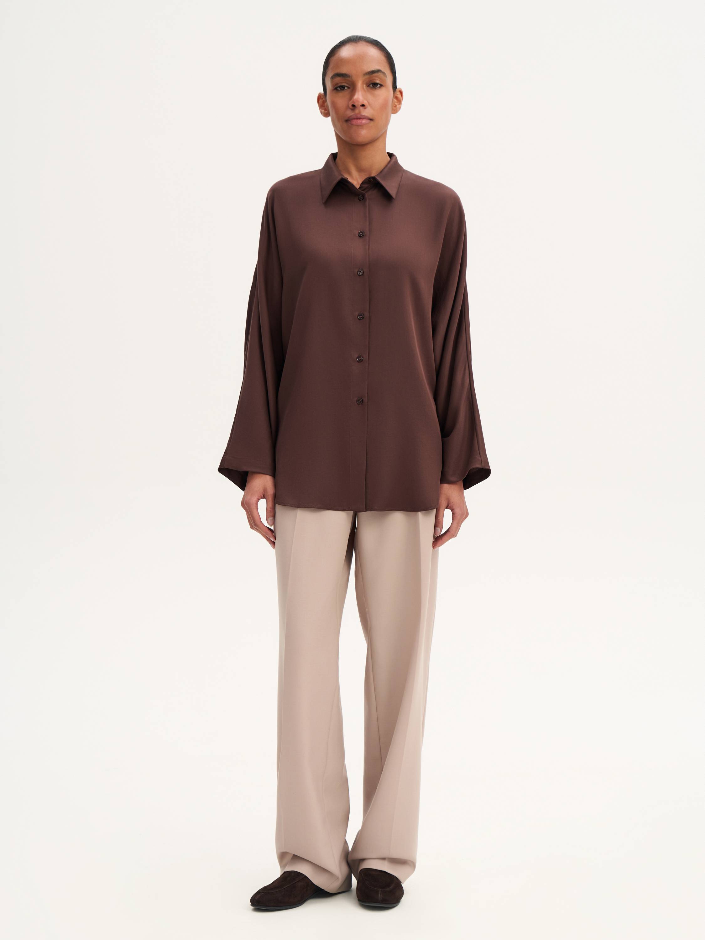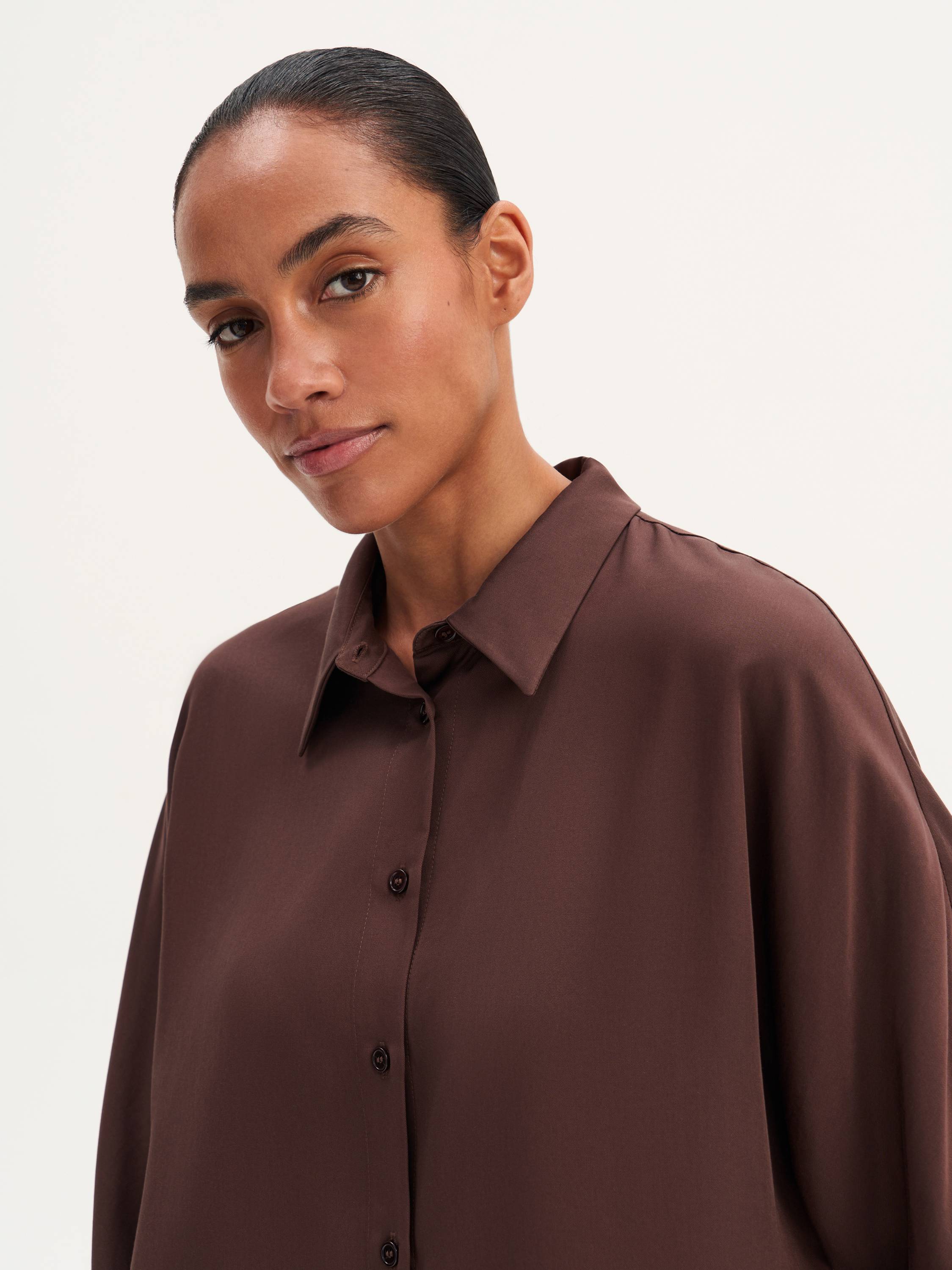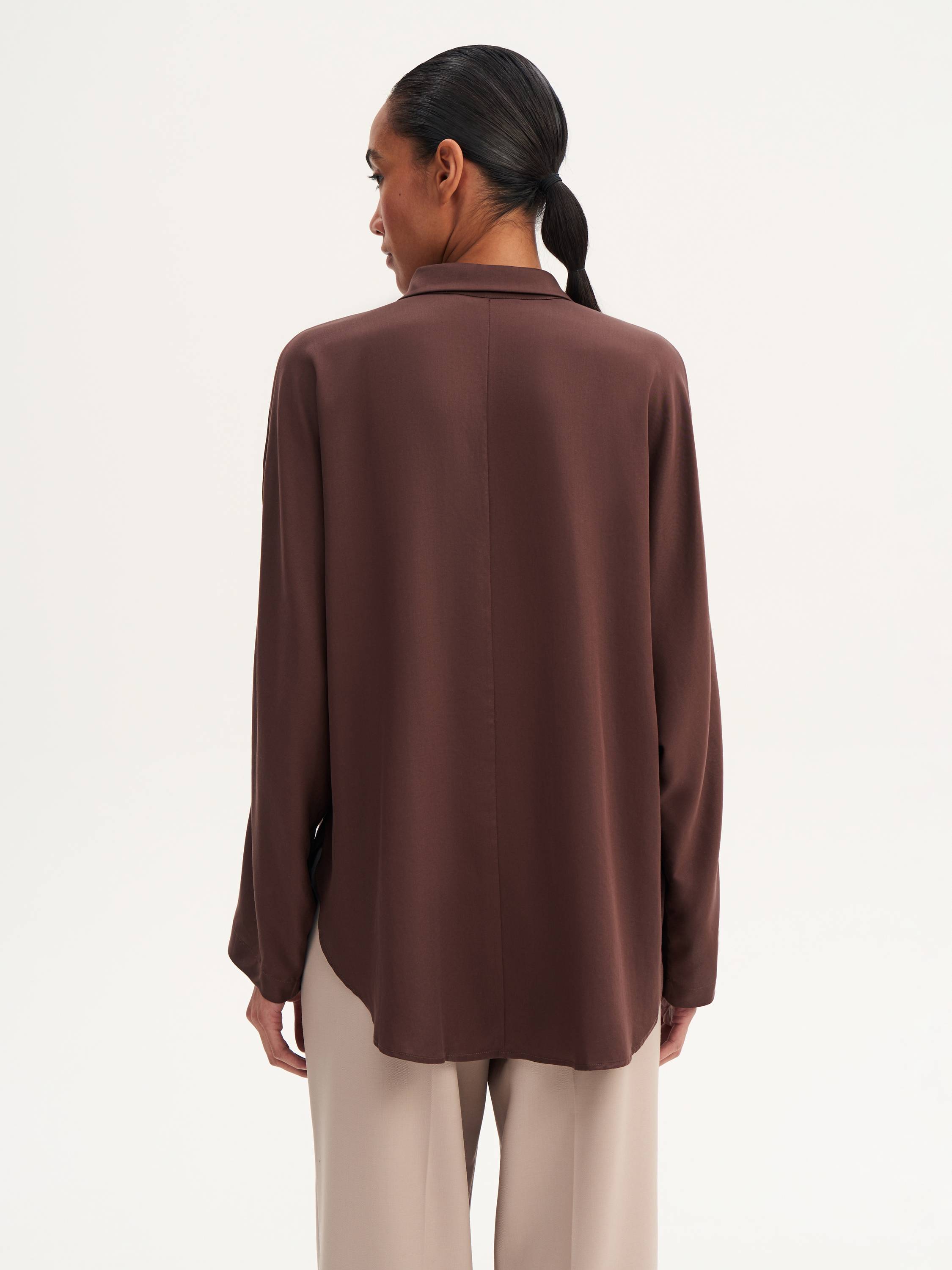 Рубашка прямого кроя — легкость и натуральность в современном прочтении. Ткань из 100% тенсела отличается мягкостью, гладкостью и шелковистым блеском, красиво драпируется и приятно прилегает к коже. Материал дышащий, гипоаллергенный, с высокой гигроскопичностью, что делает рубашку комфортной в носке в любое время года. Свободный крой создает расслабленный силуэт, а лаконичный дизайн делает модель универсальной — она гармонично впишется как в деловой образ с брюками, так и в повседневный комплект с джинсами или юбкой.