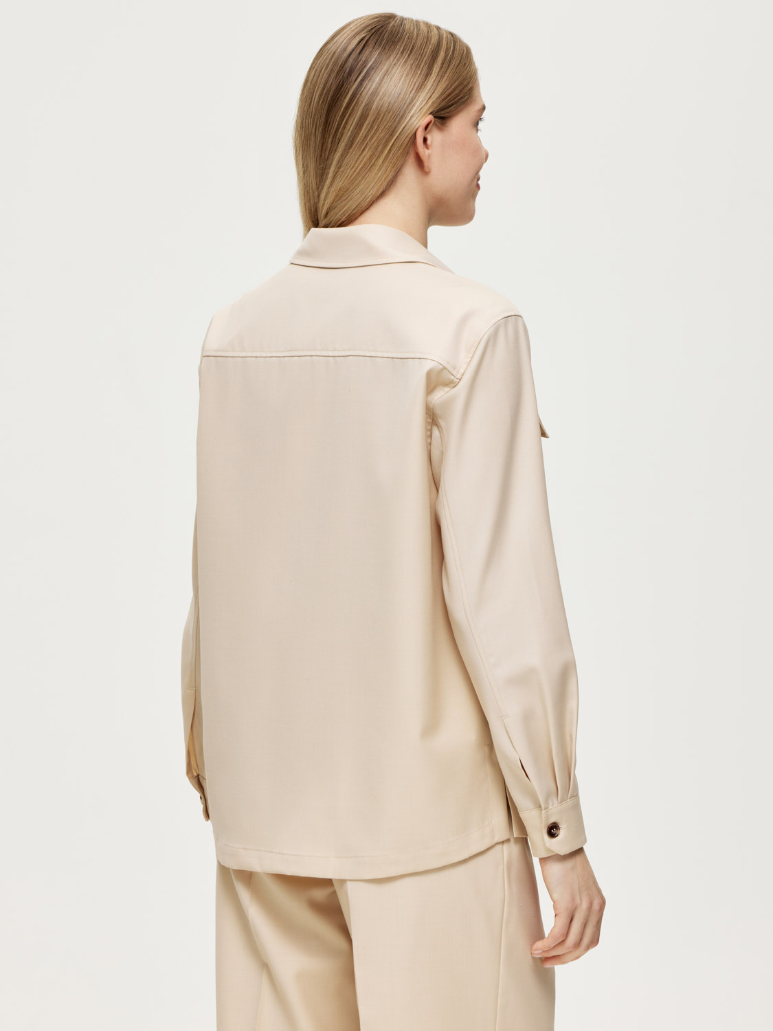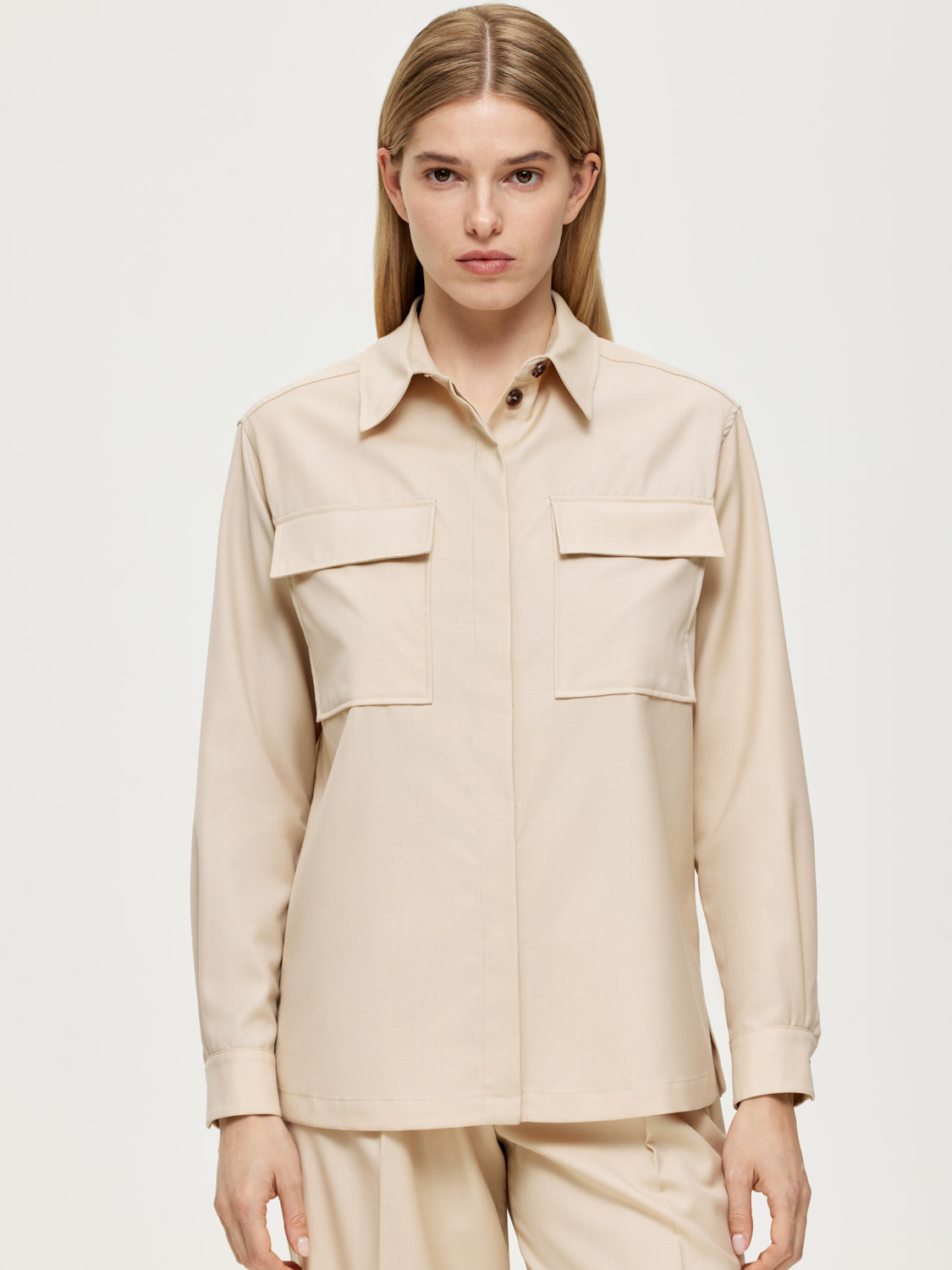 Рубашка с накладными карманами из смесовой шерсти сочетает в себе стиль и практичность. Лаконичный дизайн и классический крой делают её универсальным элементом гардероба. Два больших накладных кармана добавляют модели функциональности и современный вид. Длинные рукава с манжетами на пуговицах, классический воротник и застежка на пуговицы спереди подчеркивают элегантность модели. Прямой силуэт обеспечивает комфорт и свободу движений. Эту рубашку можно сочетать с брюками из смесовой шерсти, джинсами, лоферами или классическими кедами. На модели размер S. Параметры модели: рост 174 см, 86-63-90.