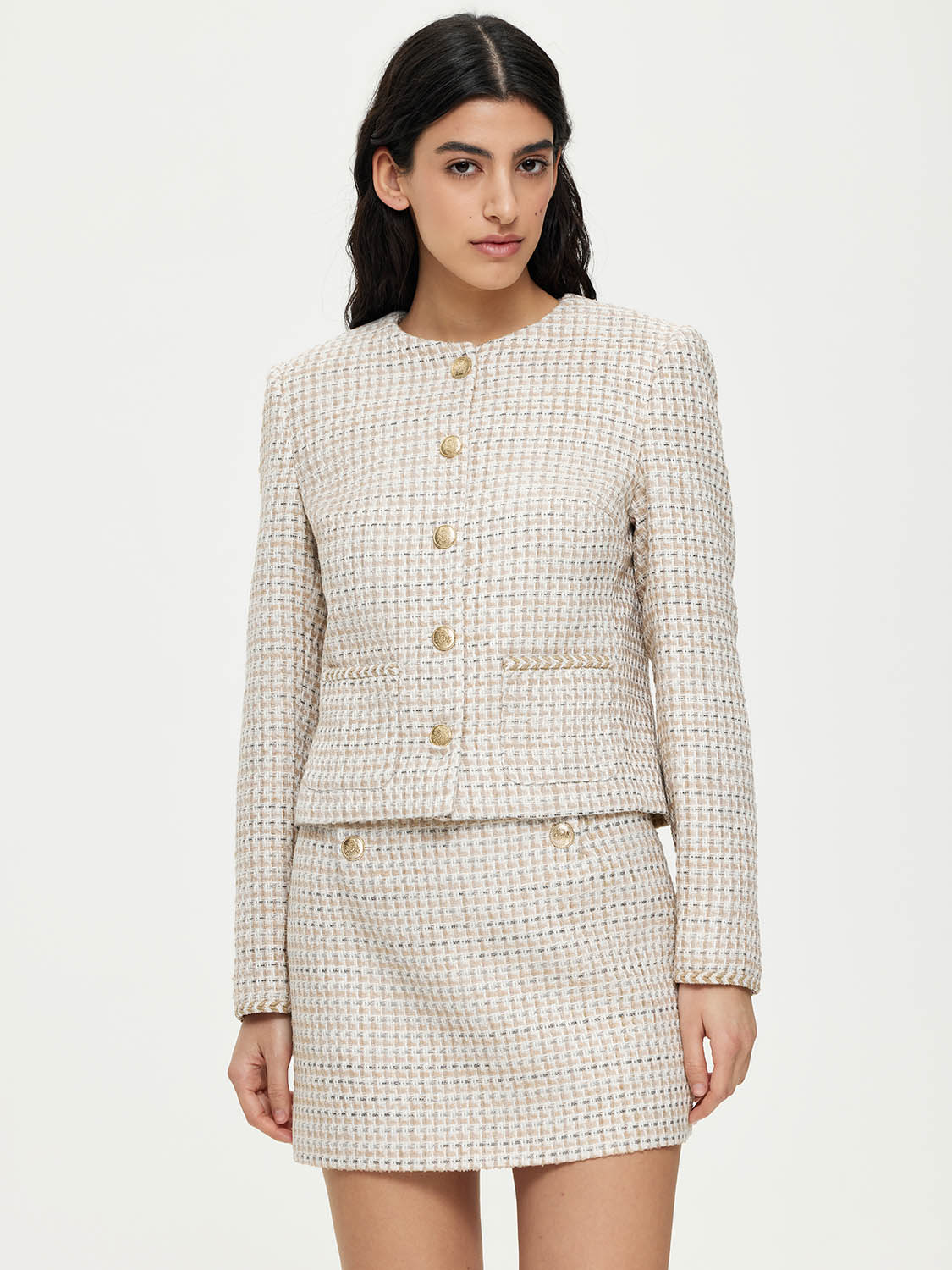Трендовый укороченный жакет прямого силуэта. Аккуратный и изящный в стиле «тихой роскоши». Втачной рукав, круглая горловина и маленькие накладные карманы в тон. Благородная твидовая фактура в нейтральной цветовой гамме, которая легко сочетается с другими оттенками коллекции. Золотистые металлические пуговицы добавляют деликатного блеска. Комбинируйте с парной юбкой или носите с джинсами, брюками и шортами. Лаконичная кожаная сумочка завершит образ. На модели размер S. Параметры модели: рост 177, 81-61-92.
