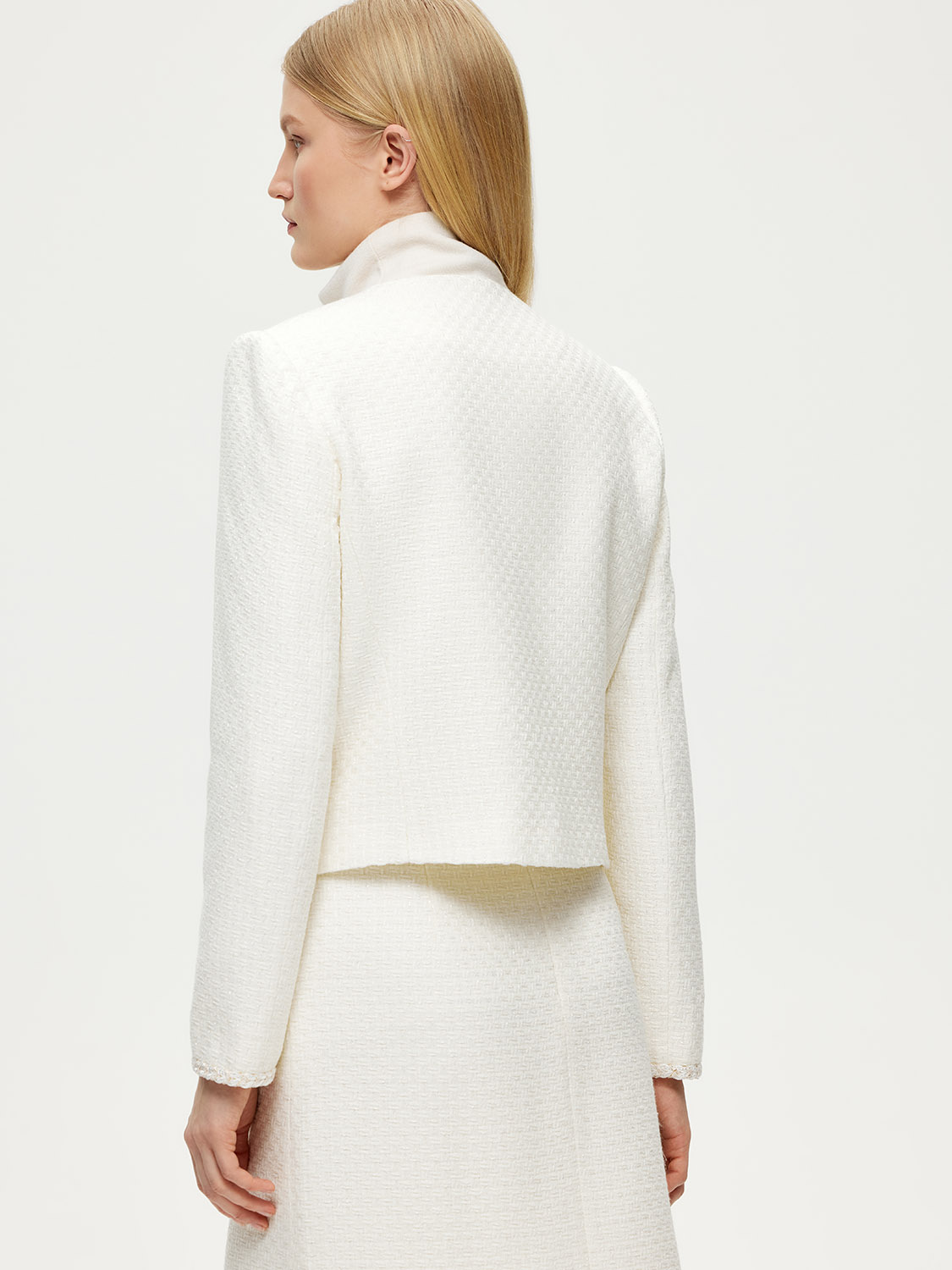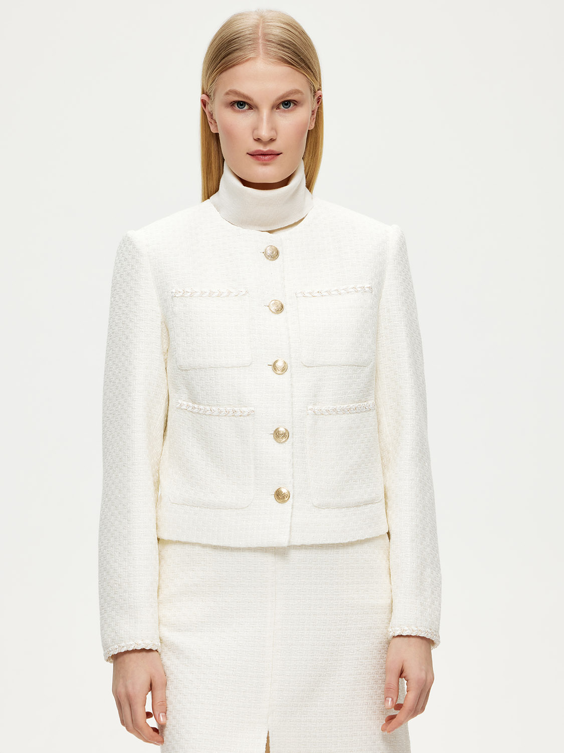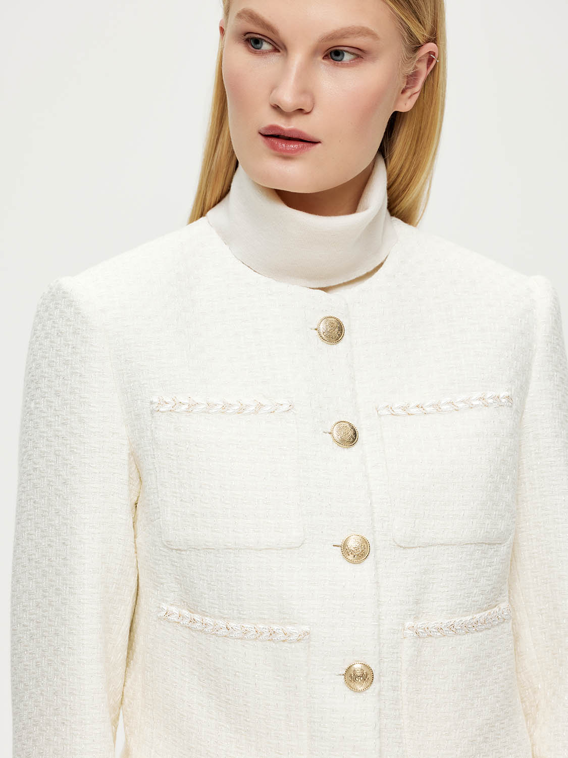 Укороченный жакет в стиле Шанель. Прямой крой, втачной рукав. Декор в виде накладных карманов и золотистых металлических пуговиц. Ткань фактурная, с деликатным переливом, хорошо держит форму и комфортна в носке. Дополнительный шик и сияние добавляет обработка карманов и края рукавов. Жакет с подкладкой. Универсальная модель для работы и отдыха. Комбинируйте с юбкой, шортами и жилетом из нашей коллекции или дополняйте денимом. На модели размер S. Параметры модели: рост 175, 80-63-89.