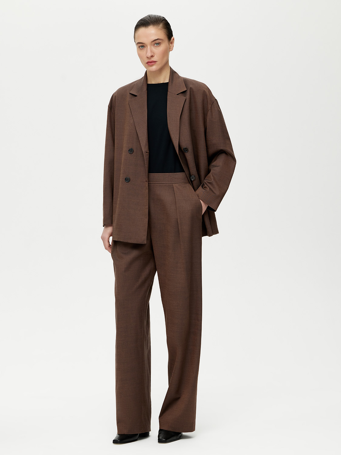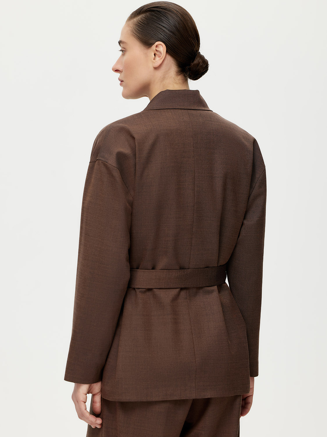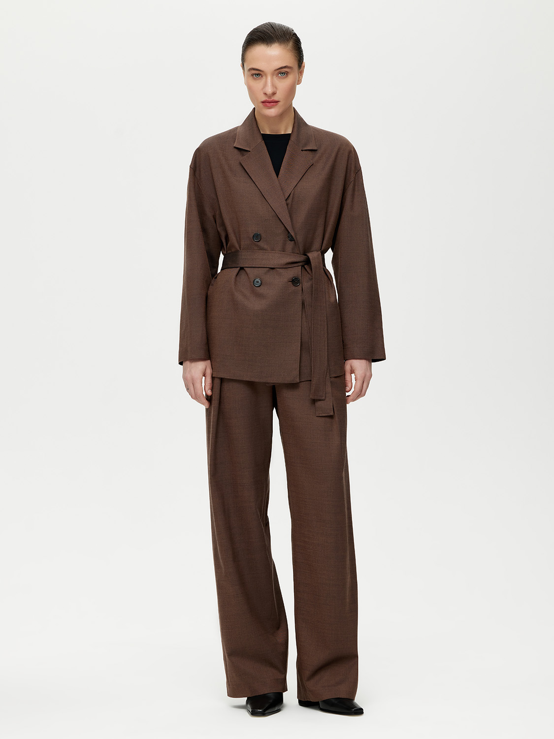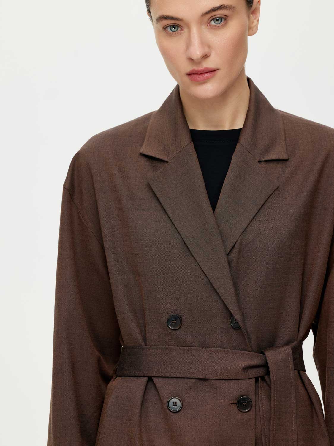 Расслабленный двубортный жакет с поясом. Свободный прямой силуэт, мягкая линия плеча, классические лацканы, нейтральный цвет – универсальная модель для создания повседневных комплектов. Для пошива использовали костюмную ткань на основе мягкой шерсти с добавлением прочного полиэстера. Такой материал практичный и не мнется, поэтому в течение дня сохраняет презентабельный внешний вид. Жакет на подкладке. Комбинируйте с парными брюками или джинсами. На модели размер S. Параметры модели: рост 177, 80-59-89.