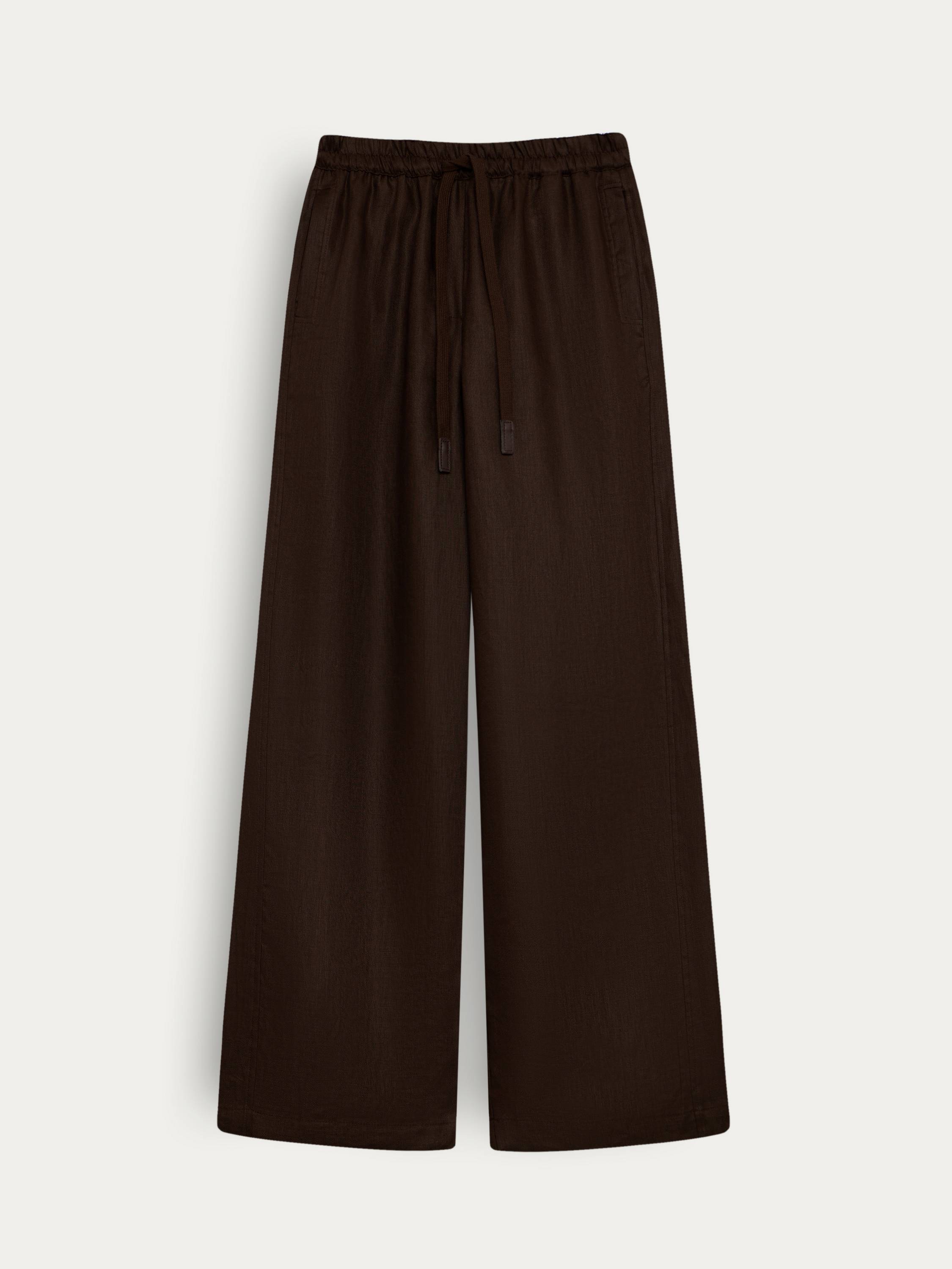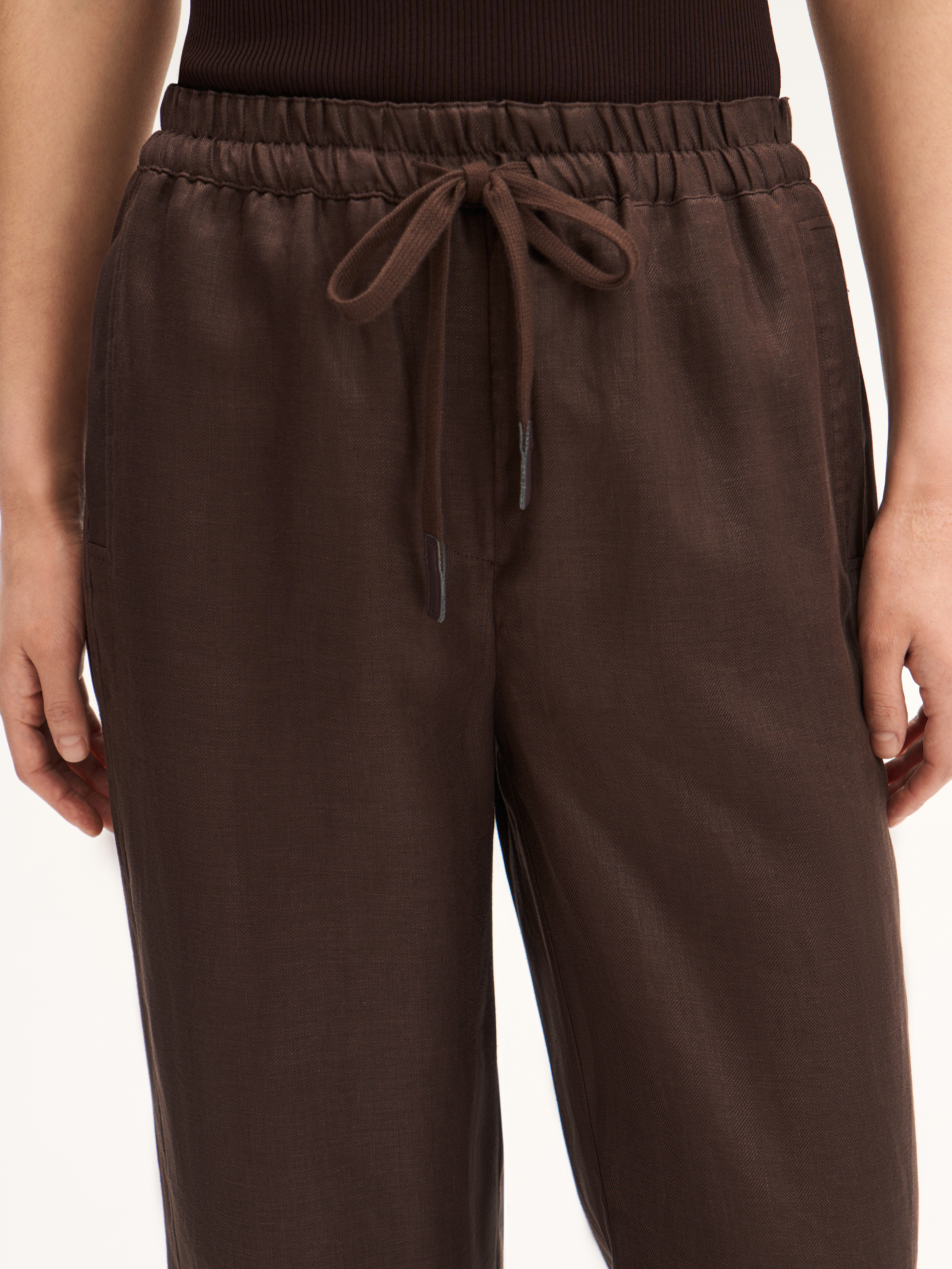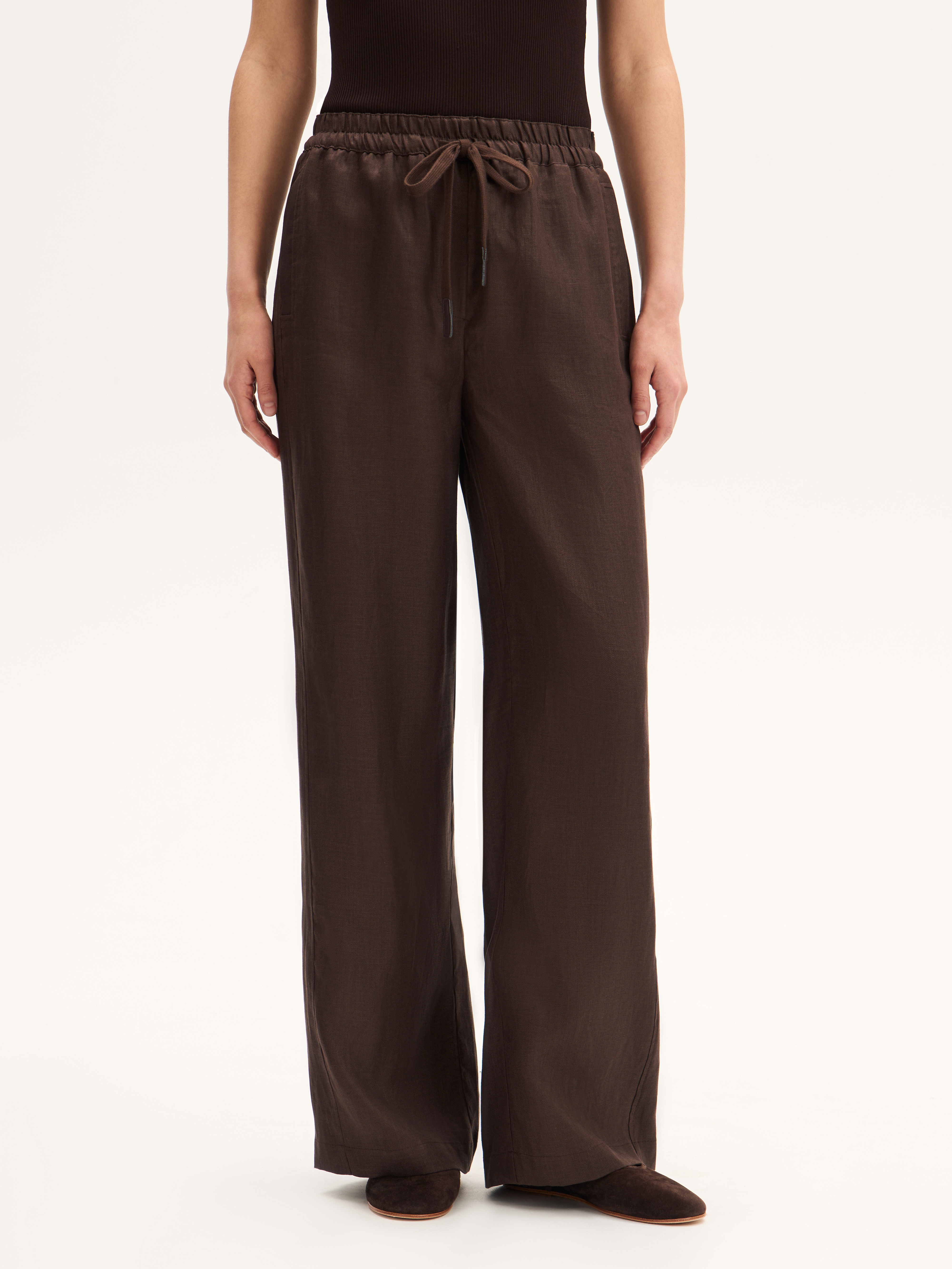 Свободный силуэт, струящаяся фактура и максимальный комфорт — эти брюки идеально вписываются в повседневный летний гардероб. Эластичный пояс с кулиской мягко фиксирует посадку, не сковывая движений, а прямые штанины визуально вытягивают силуэт. Натуральный лен в составе обеспечивает воздухопроницаемость и легкость, а глубокий оттенок подчеркивает минималистичную эстетику модели. Носите брюки с простыми топами или рубашками из той же ткани — для расслабленных, но собранных образов.