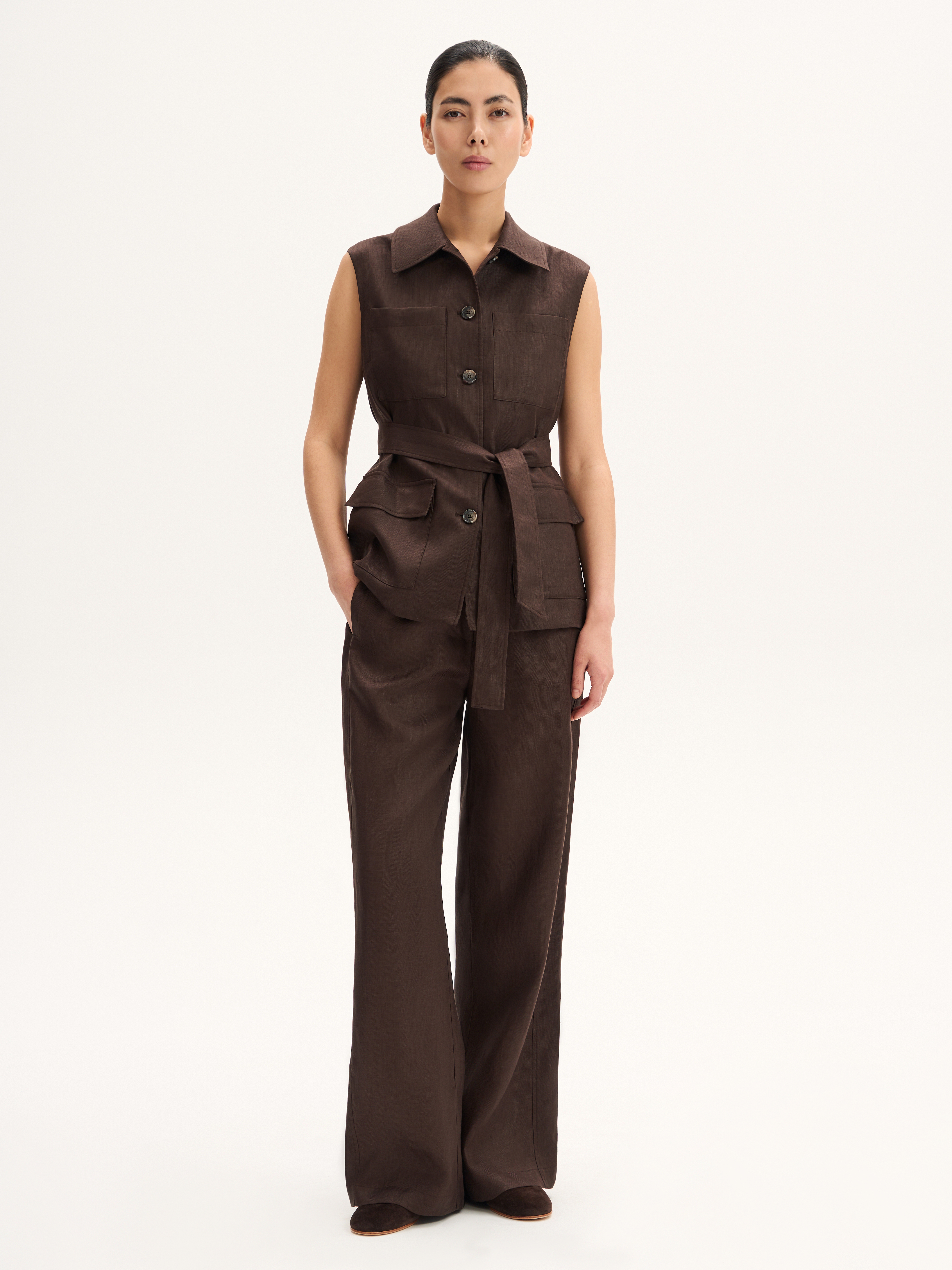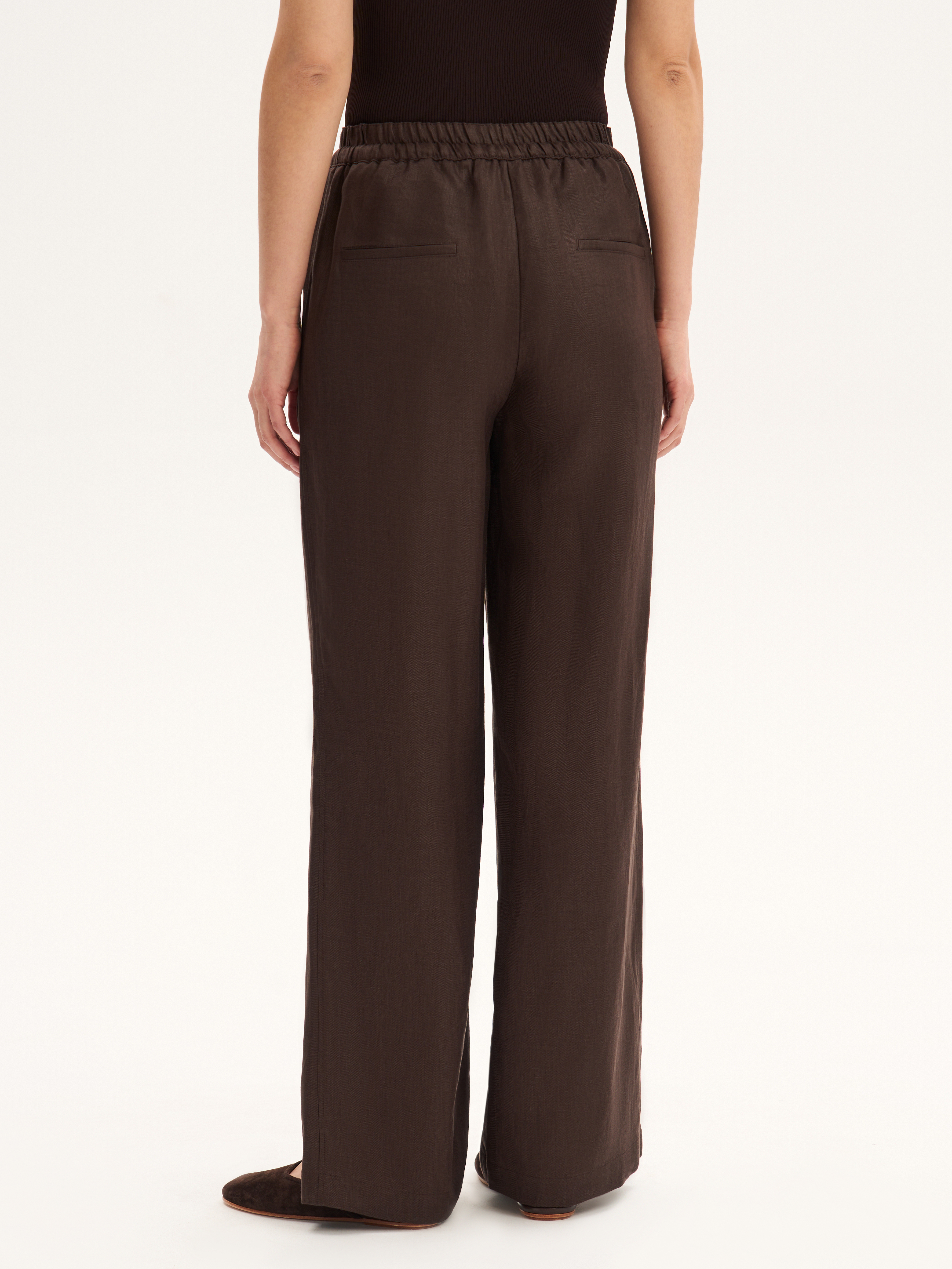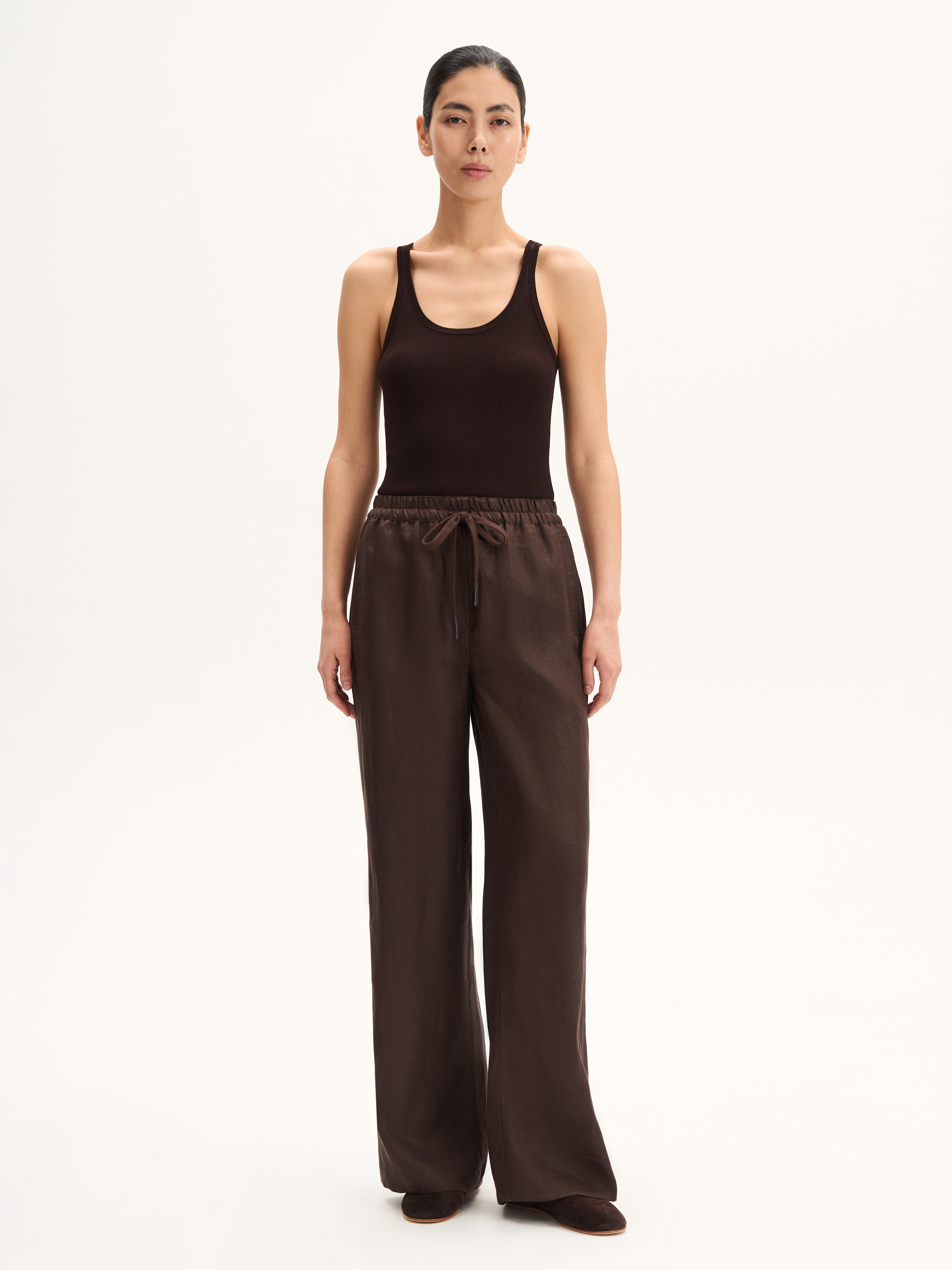 Свободный силуэт, струящаяся фактура и максимальный комфорт — эти брюки идеально вписываются в повседневный летний гардероб. Эластичный пояс с кулиской мягко фиксирует посадку, не сковывая движений, а прямые штанины визуально вытягивают силуэт. Натуральный лен в составе обеспечивает воздухопроницаемость и легкость, а глубокий оттенок подчеркивает минималистичную эстетику модели. Носите брюки с простыми топами или рубашками из той же ткани — для расслабленных, но собранных образов.