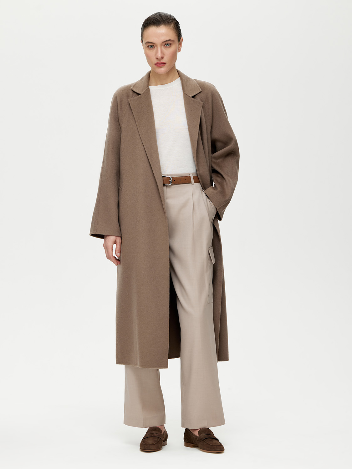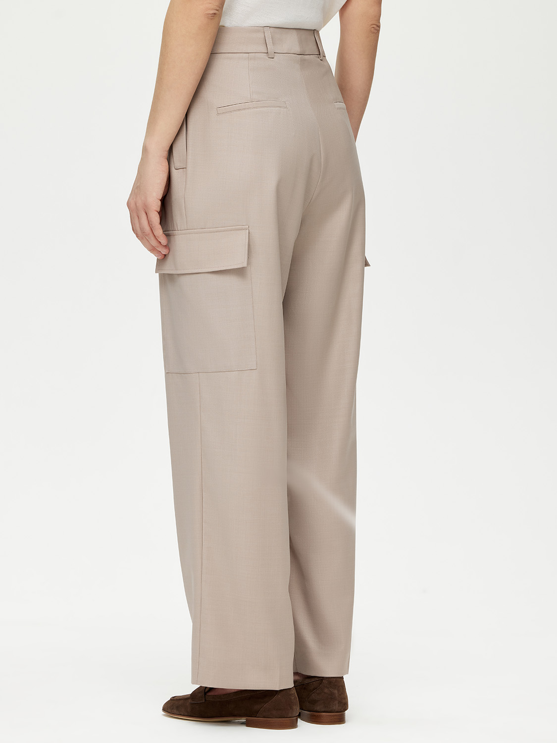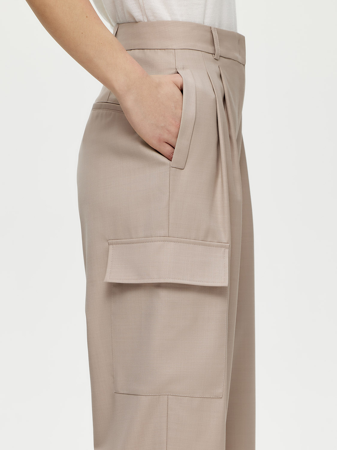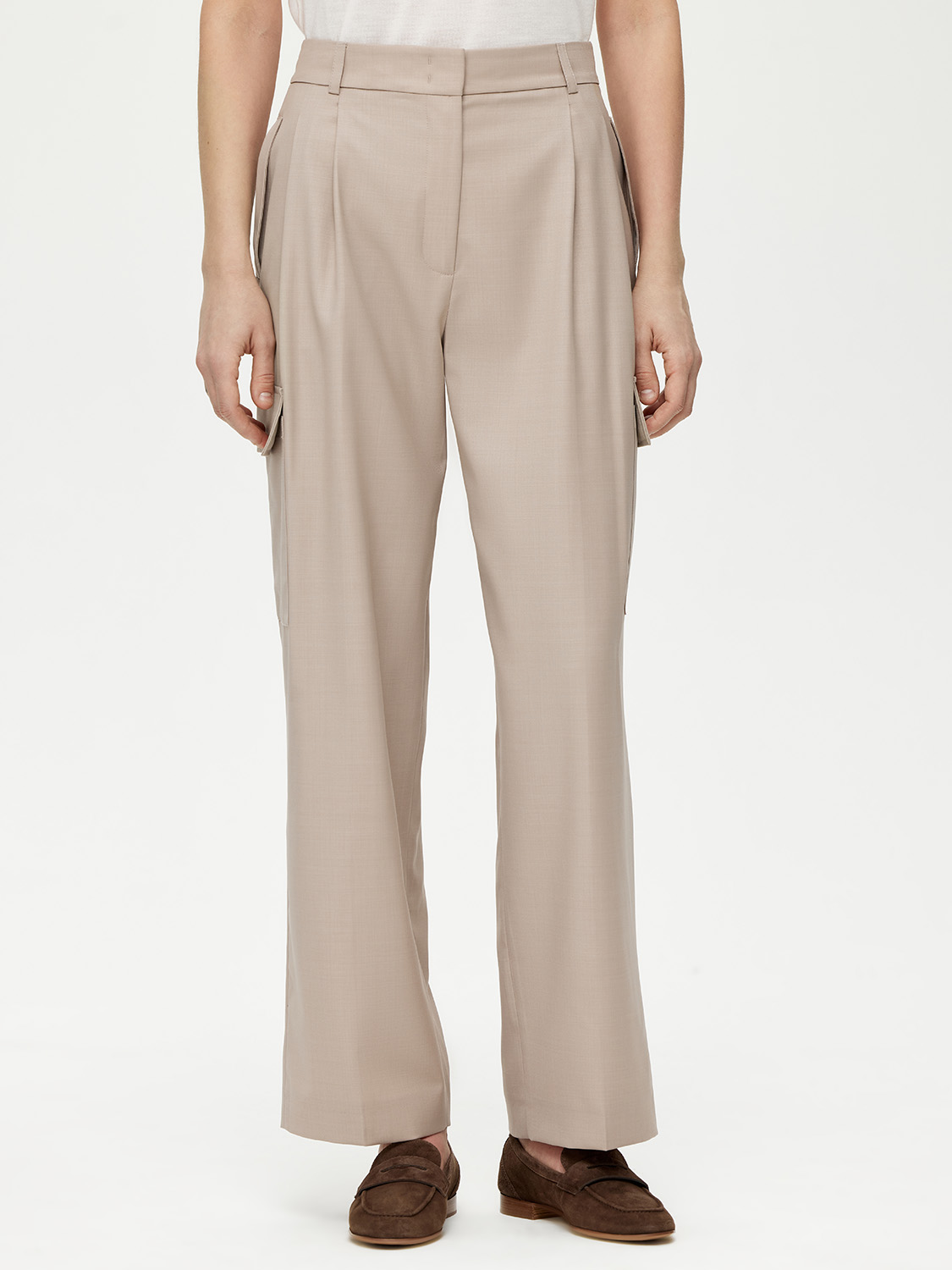 Прямые брюки карго с характерными боковыми накладными карманами. Выполнены из тонкой и тактильно приятной костюмной шерсти. Такой материал хорошо держит форму, не вытягивается и не мнется. Плотное переплетение гладких нитей придает деликатный блеск. На подкладке. Высокая посадка и стрелки визуально вытягивают силуэт. Такой фасон станет отличной альтернативой классическим костюмным брюкам и будет уместен на работе при нестрогом дресс-коде. За счет лаконичности сочетаются с различными верхами. В качестве обуви выбирайте казаки, лоферы, кеды или туфли. На модели размер S. Параметры модели: рост 177, 80-59-89.