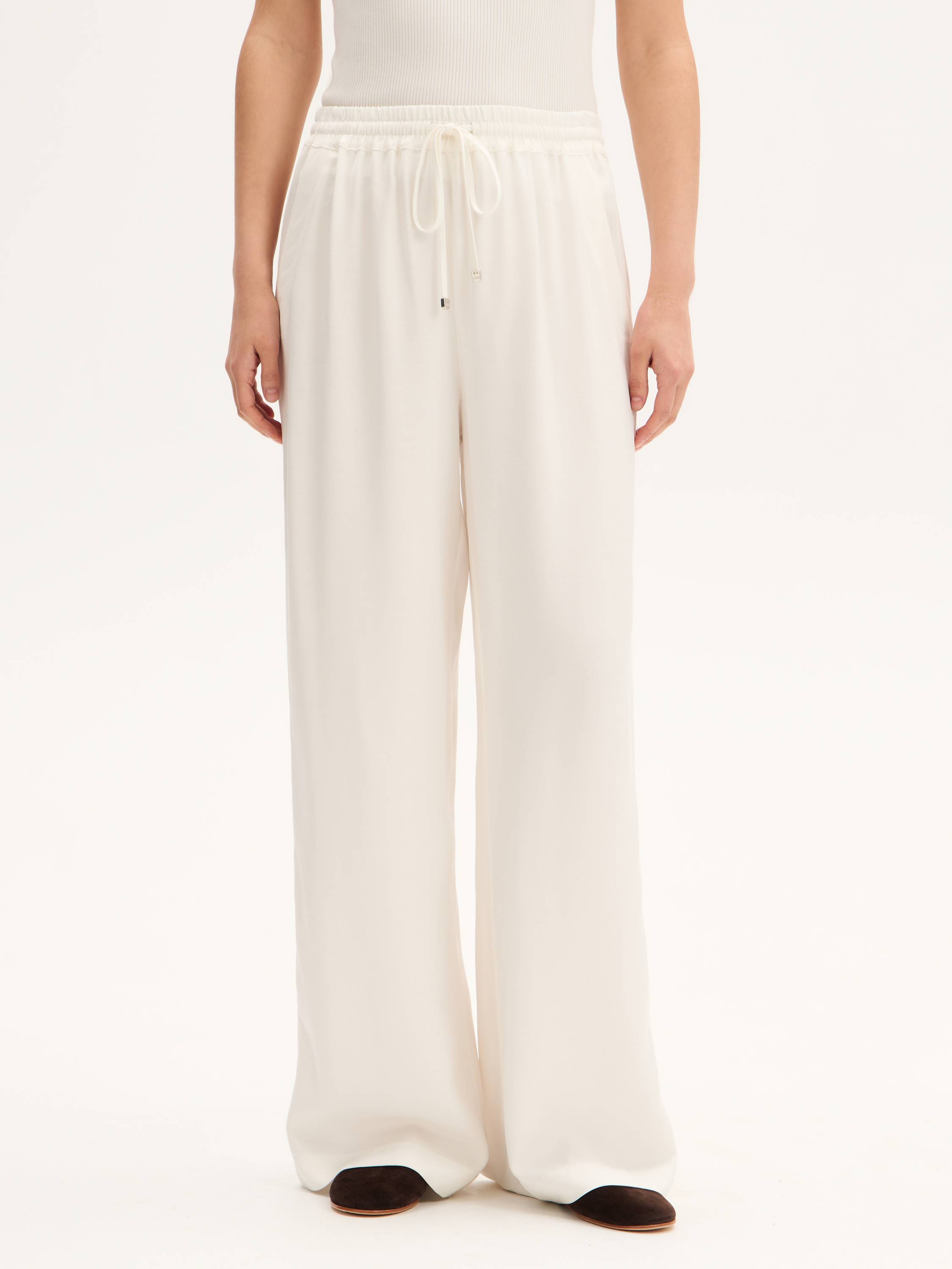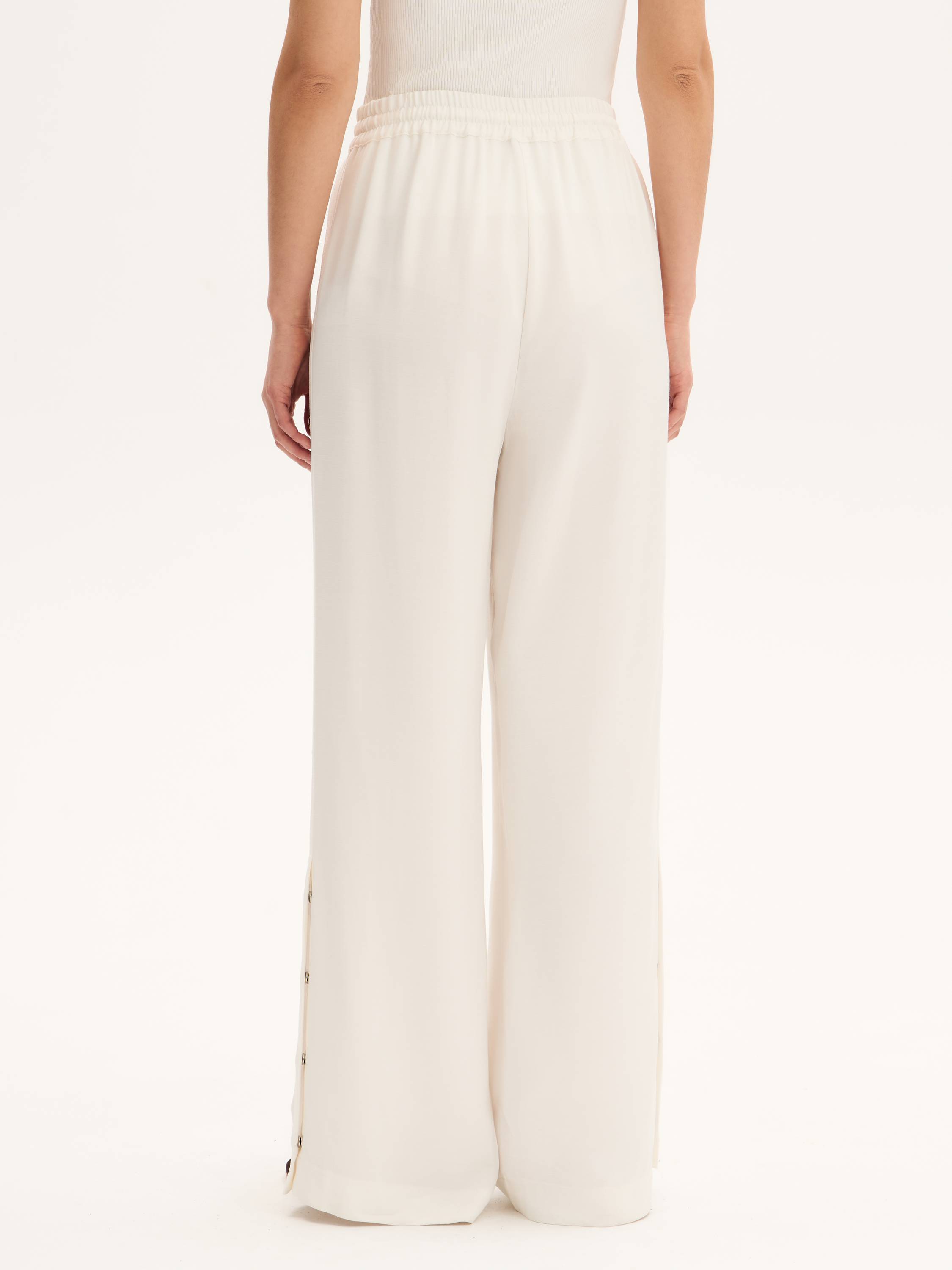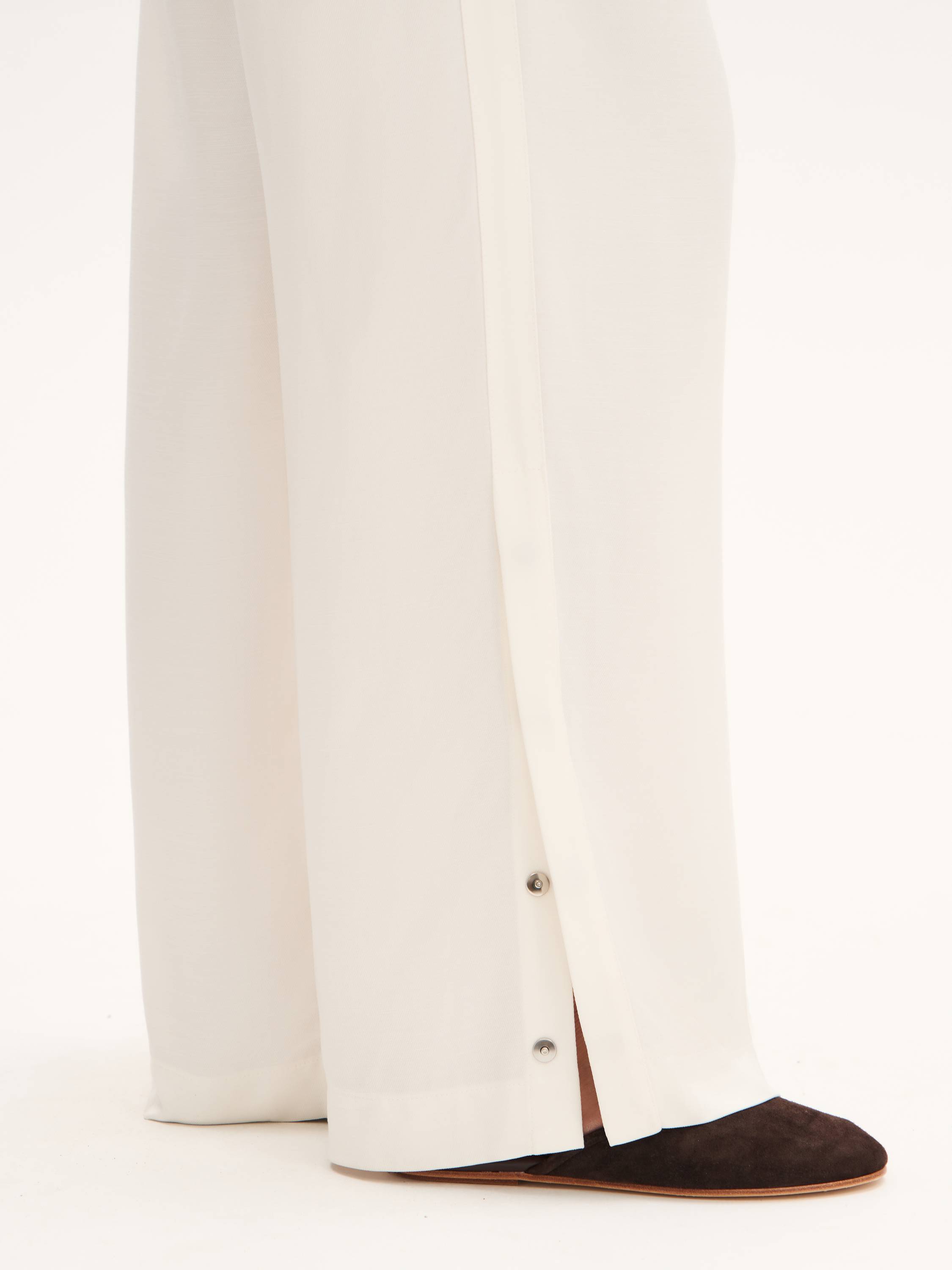 Легкие брюки свободного кроя с эластичным поясом и регулируемой кулиской выполнены из гладкого смесового полотна на основе района и тенсела. Район (вискозное волокно на натуральной основе) обеспечивает струящийся силуэт и приятную прохладу, а тенсел придает ткани мягкость, воздухопроницаемость и устойчивость к износу. Модель дополнена декоративными разрезами по бокам с застежками на кнопки — они акцентируют движение и позволяют менять форму низа. Брюки подойдут как для расслабленных образов на каждый день, так и для стилистических экспериментов в духе soft tailoring.