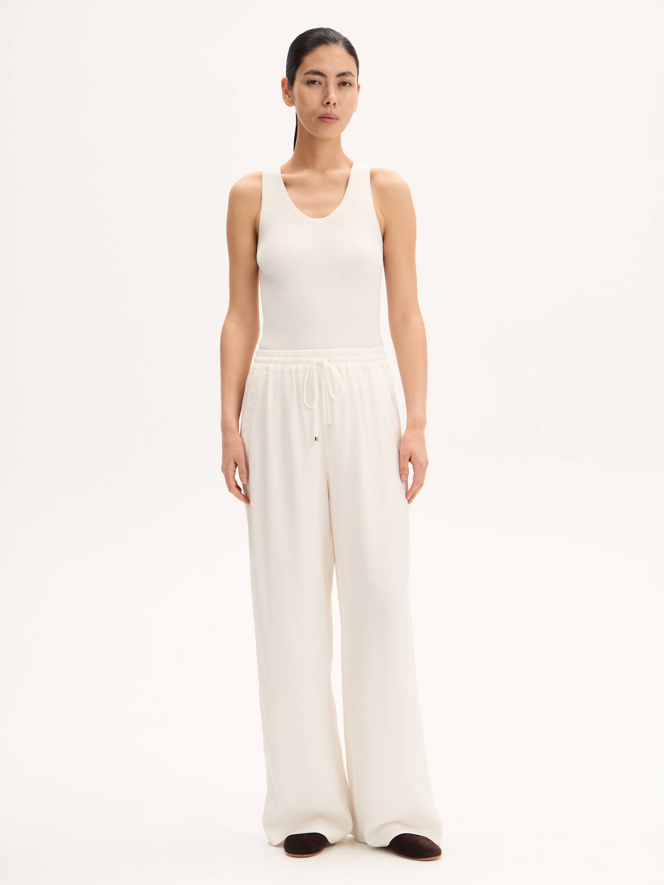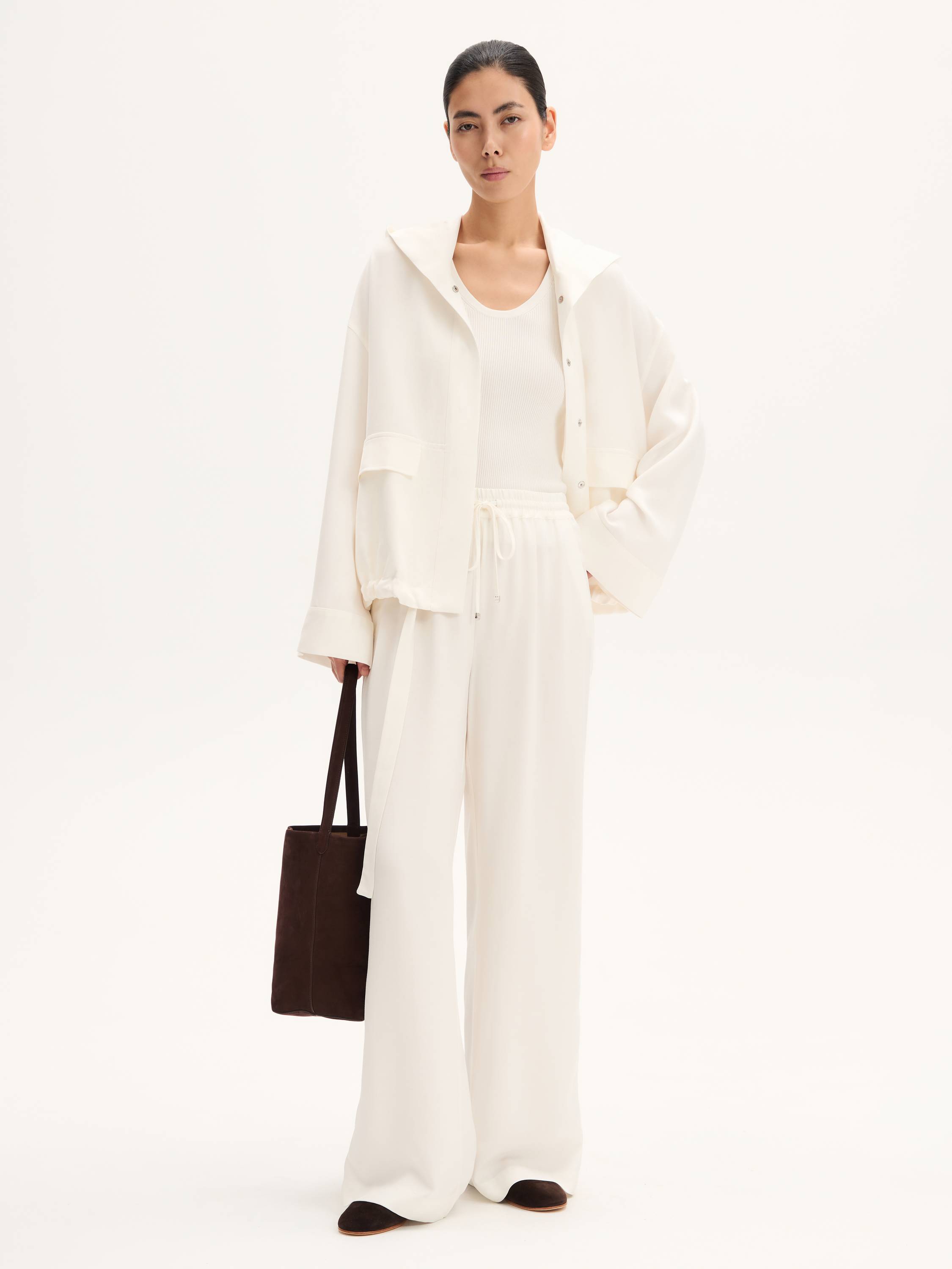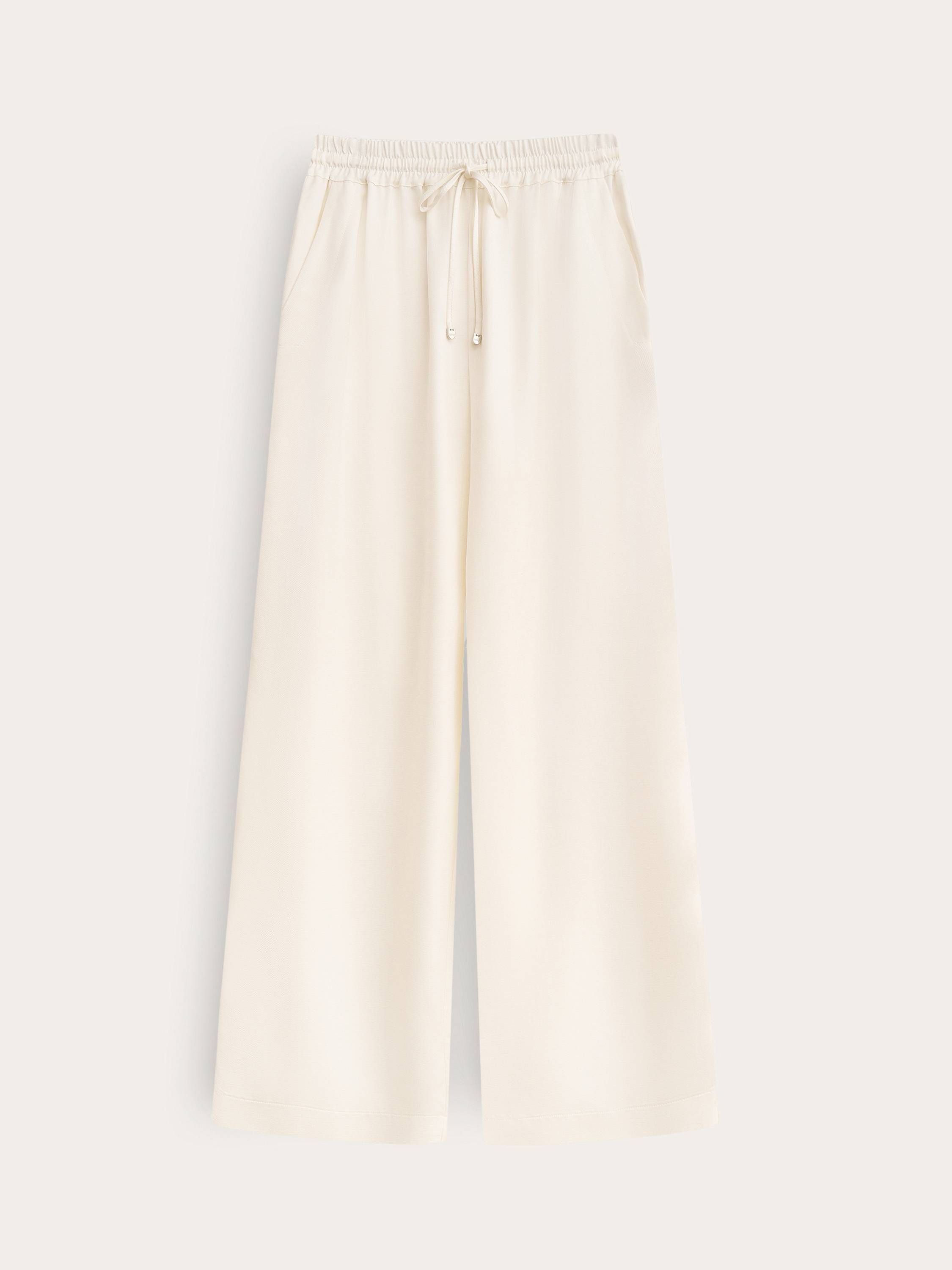 Легкие брюки свободного кроя с эластичным поясом и регулируемой кулиской выполнены из гладкого смесового полотна на основе района и тенсела. Район (вискозное волокно на натуральной основе) обеспечивает струящийся силуэт и приятную прохладу, а тенсел придает ткани мягкость, воздухопроницаемость и устойчивость к износу. Модель дополнена декоративными разрезами по бокам с застежками на кнопки — они акцентируют движение и позволяют менять форму низа. Брюки подойдут как для расслабленных образов на каждый день, так и для стилистических экспериментов в духе soft tailoring.
