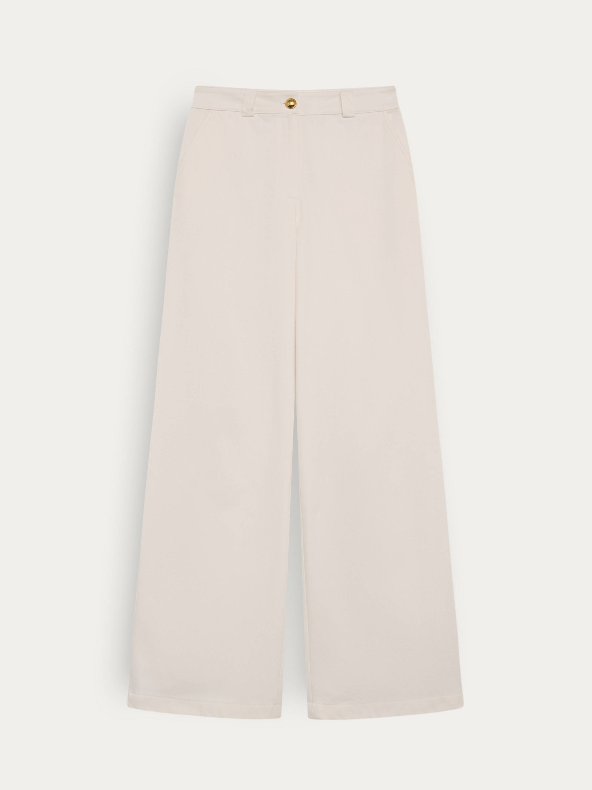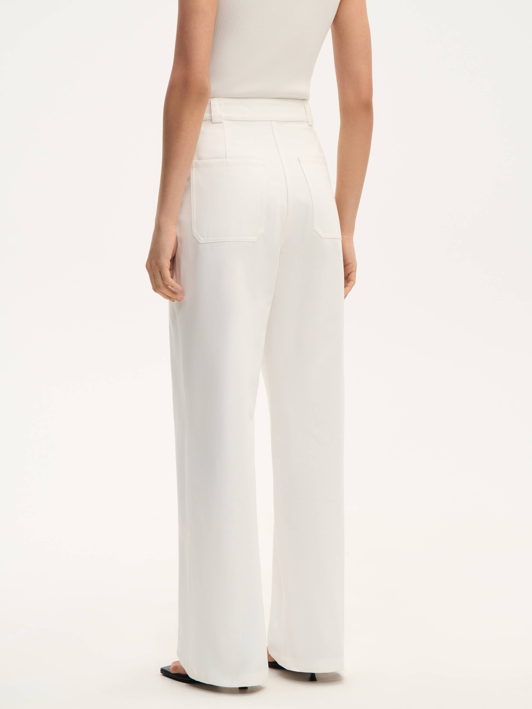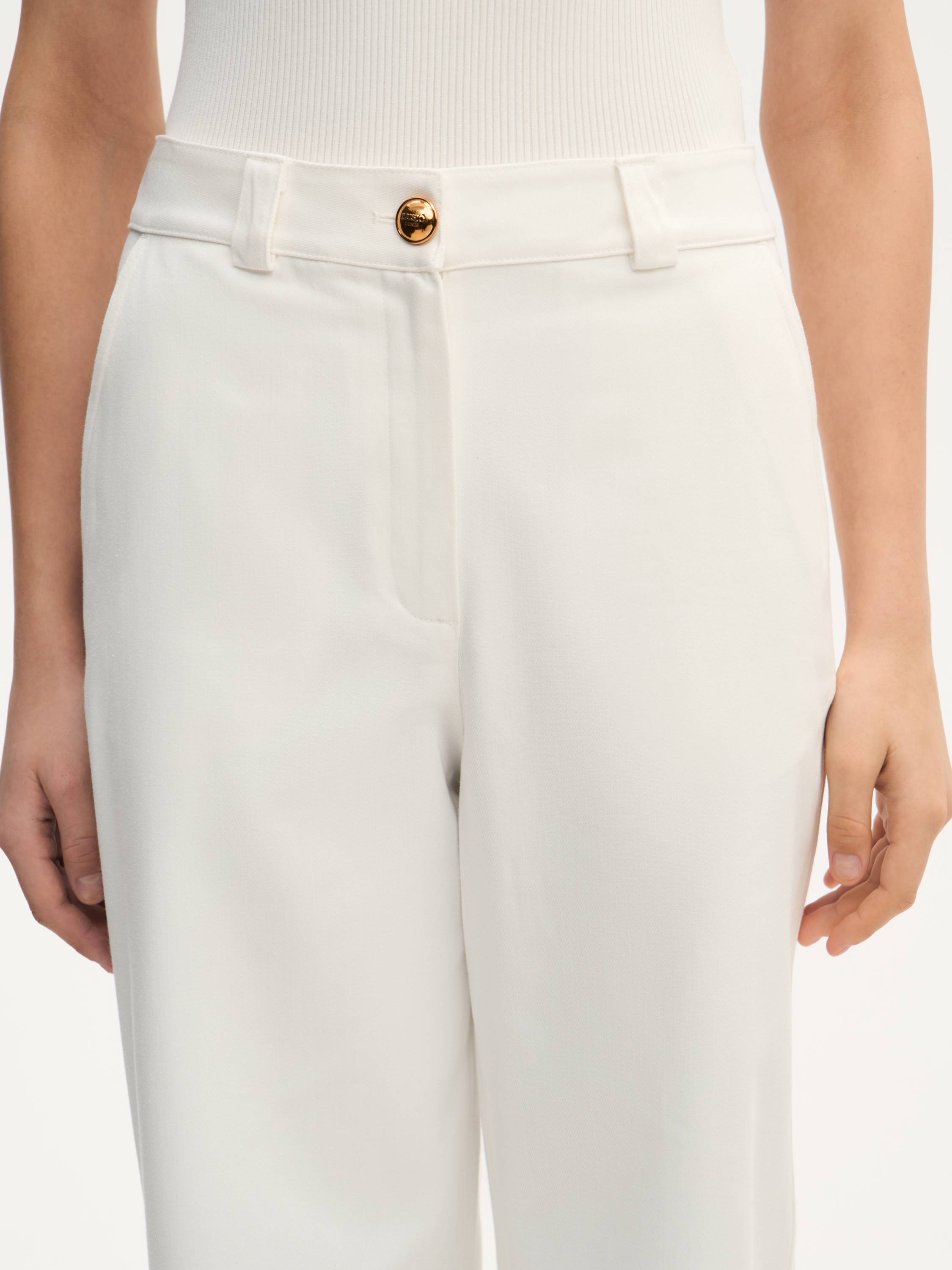 Джинсы прямого кроя выполнены из хлопкового денима плотностью 12,0 Oz с добавлением района. Натуральное волокно обеспечивает прочность и комфорт в носке, а район придает ткани мягкость и легкую струящуюся посадку. Модель с высокой посадкой, полноценной длиной и акцентной застежкой на пуговицу дополнена поясом со шлевками и накладными карманами сзади. Чистый силуэт без лишнего декора делает джинсы универсальной основой гардероба — они легко сочетаются с топами, блузами или жакетами в повседневных и более собранных образах. Посадка: High Rise. Длина: Full Length.