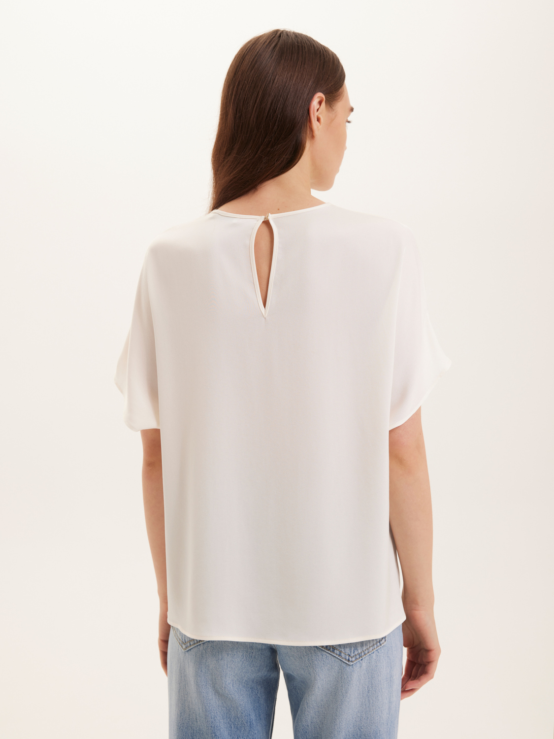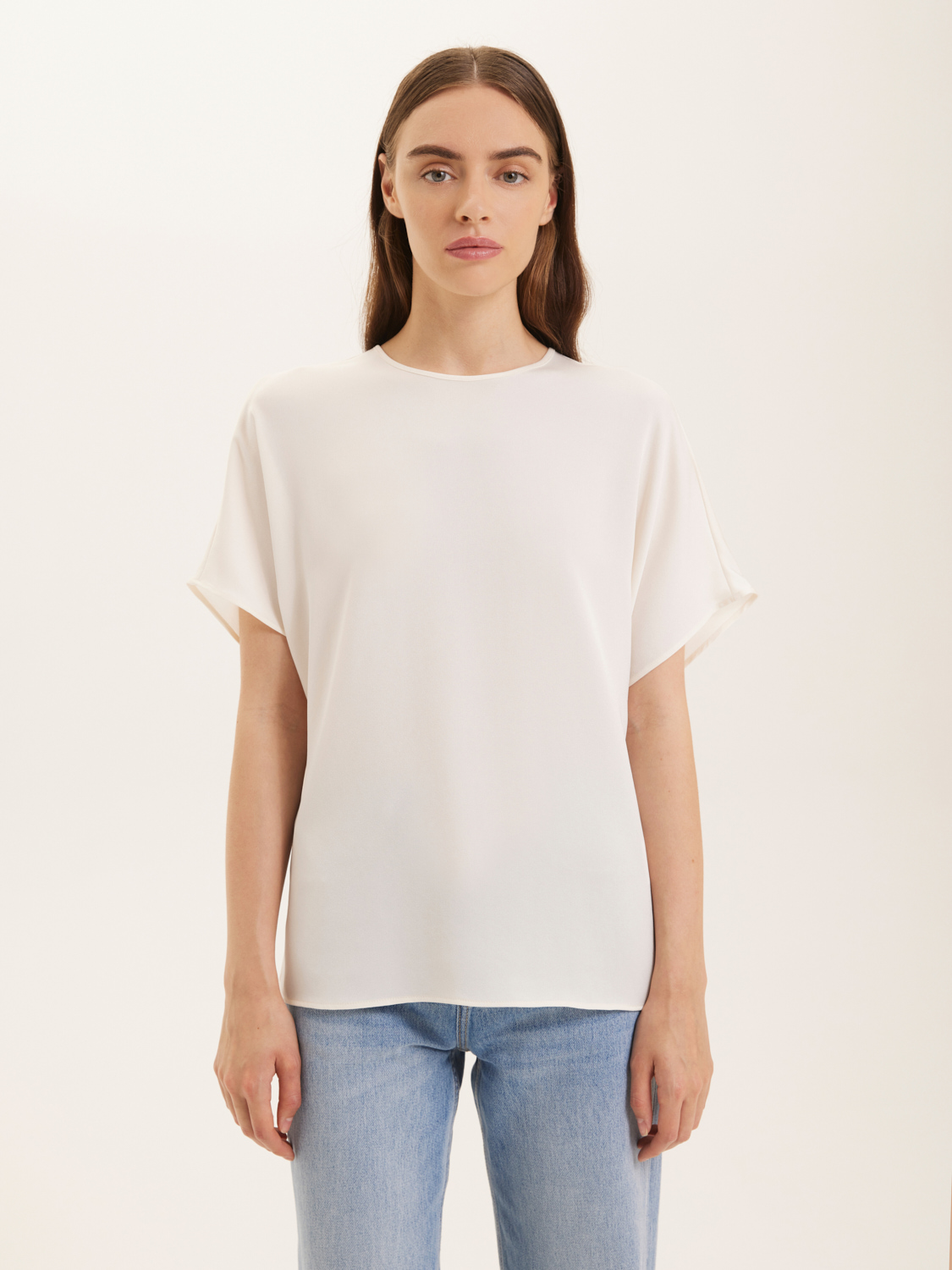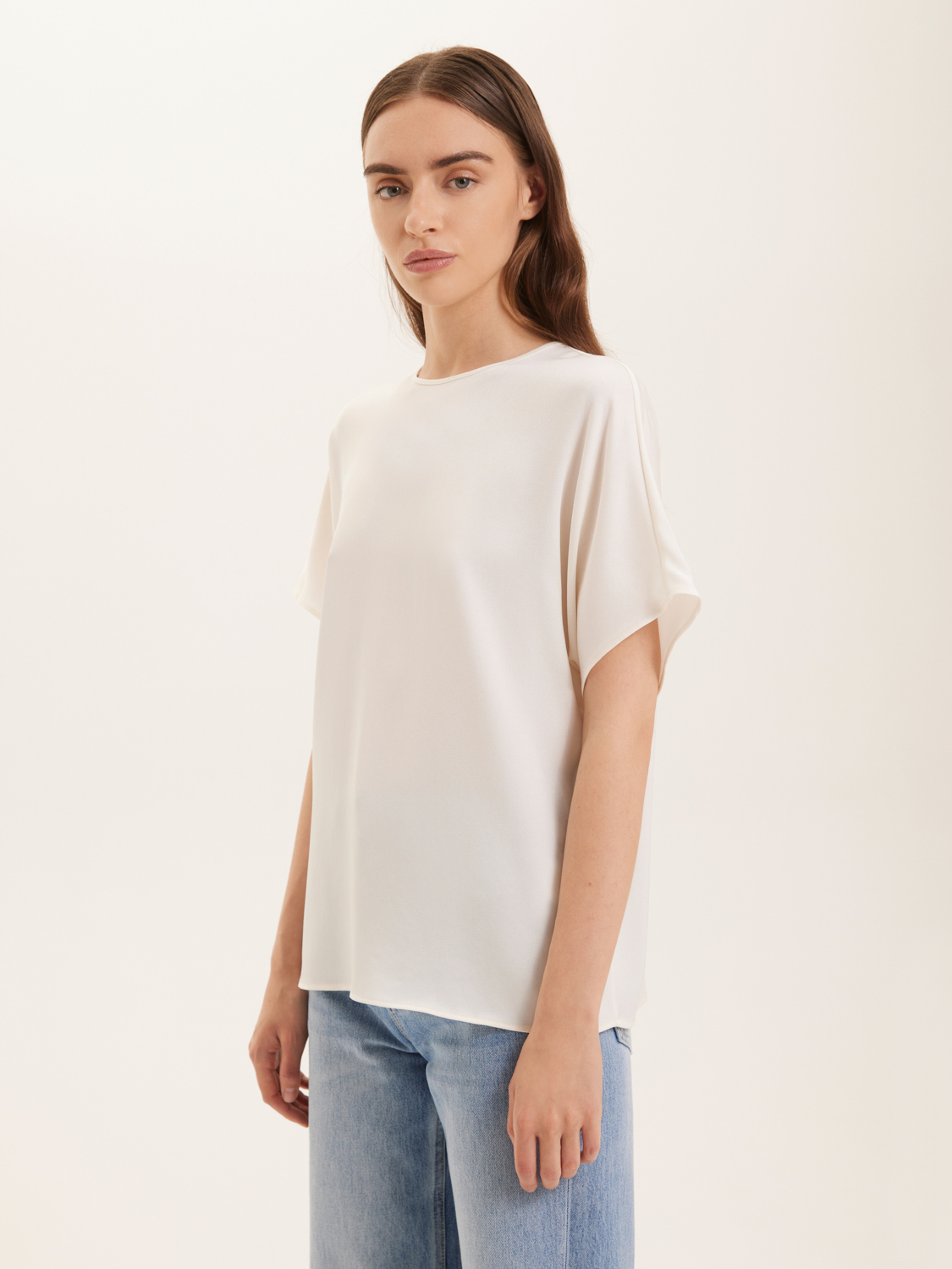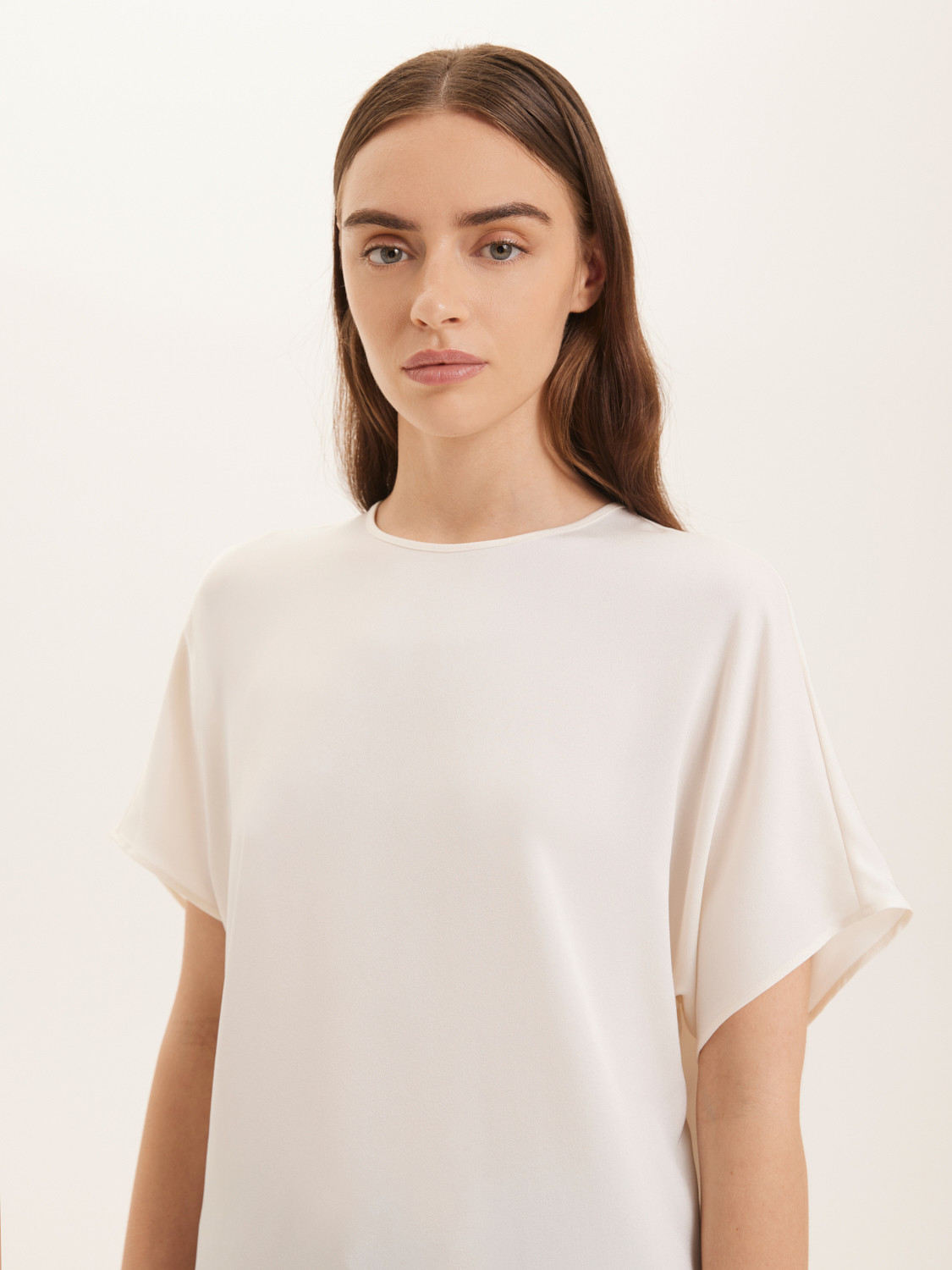 Атласная блуза свободного кроя. Невесомый и мягкий атлас придает утонченный блеск и приятные тактильные ощущения. Свободный крой и короткие рукава обеспечивают комфорт и динамичность движений. Простота и элегантность дизайна позволяют легко сочетать ее с джинсами, брюками или юбками. Блуза подойдет как для повседневных выходов, так и для более нарядных случаев с аксессуарами по вашему вкусу. На модели размер S. Параметры модели: рост 175, 80-60-87.