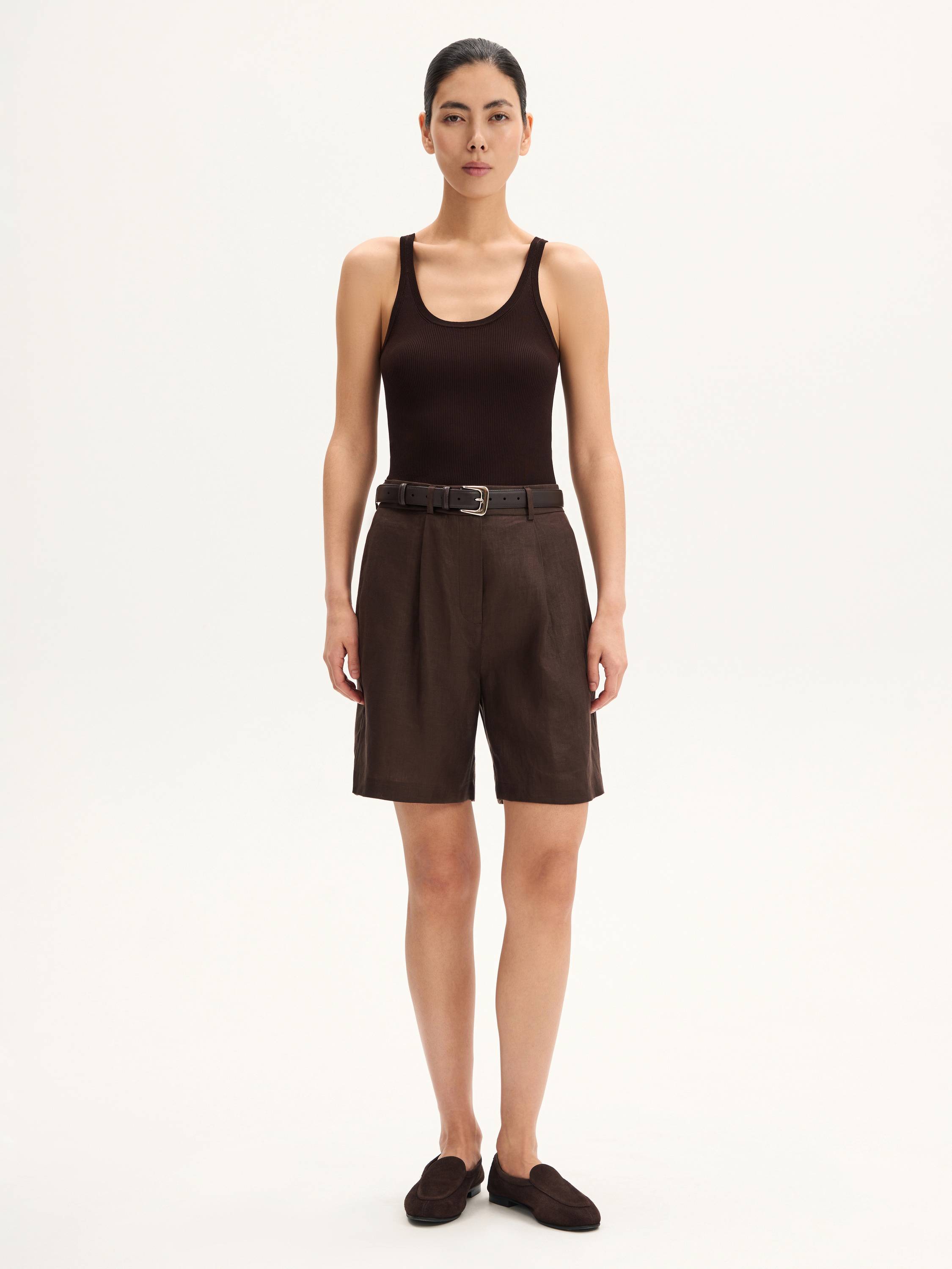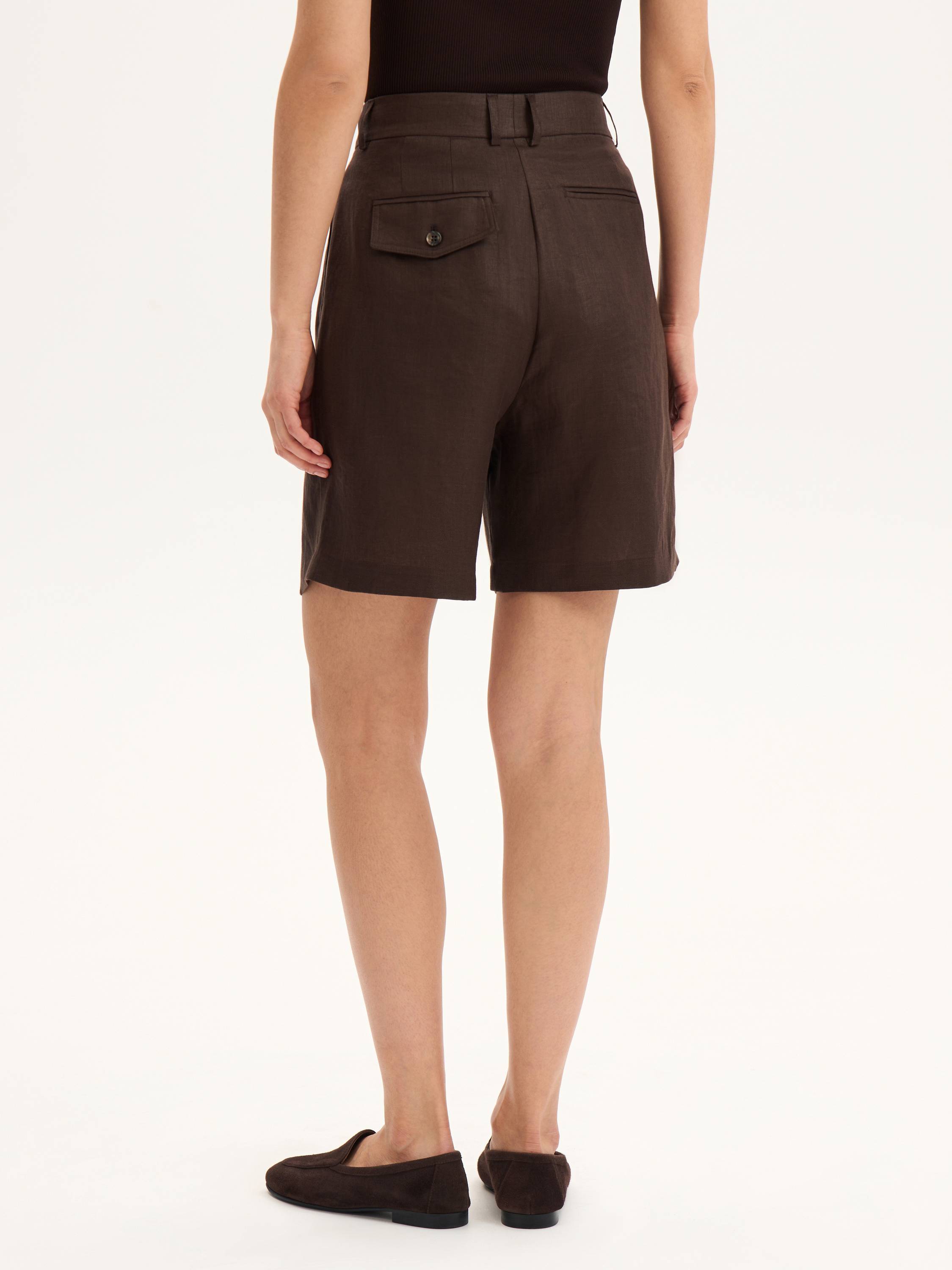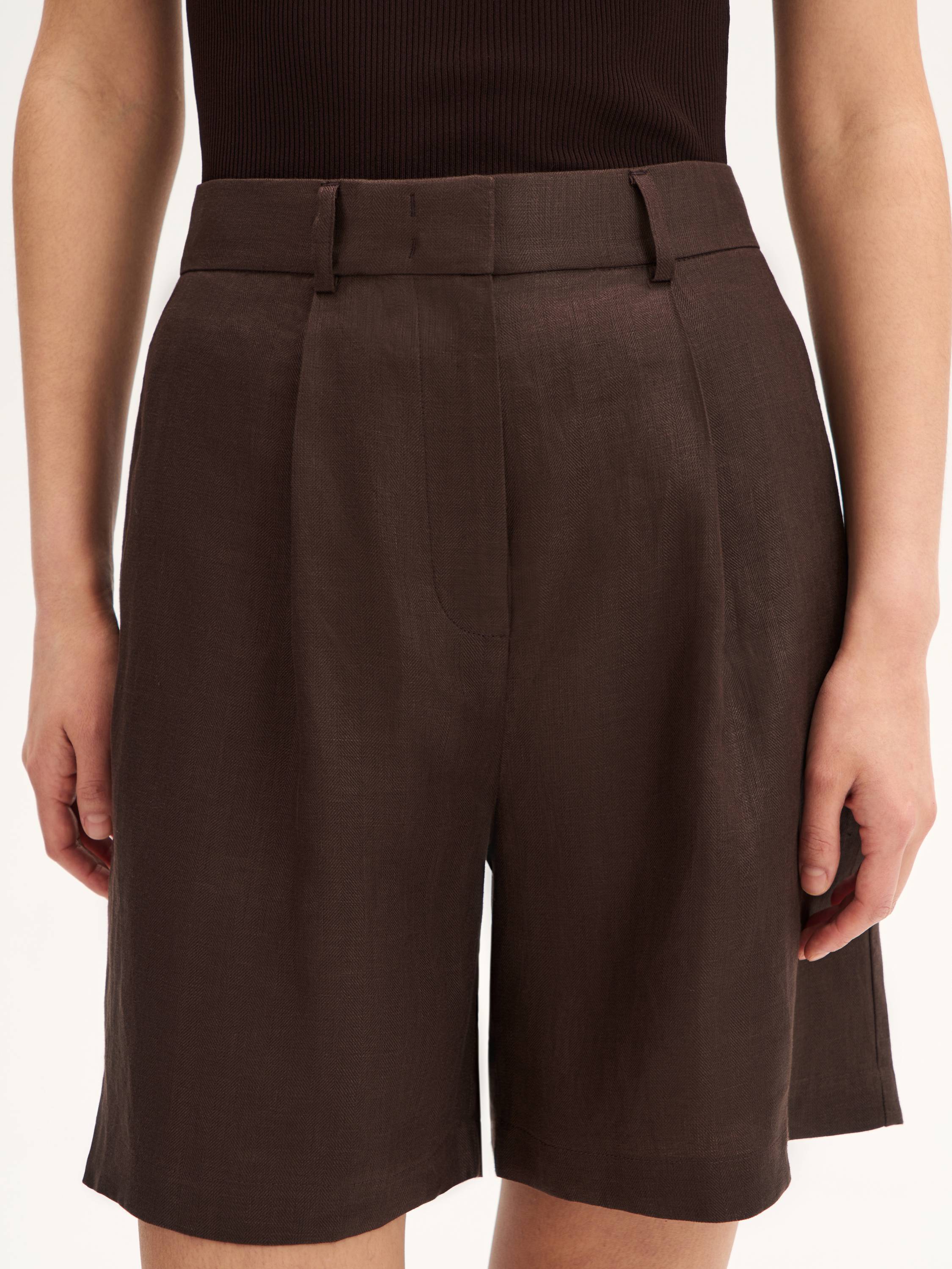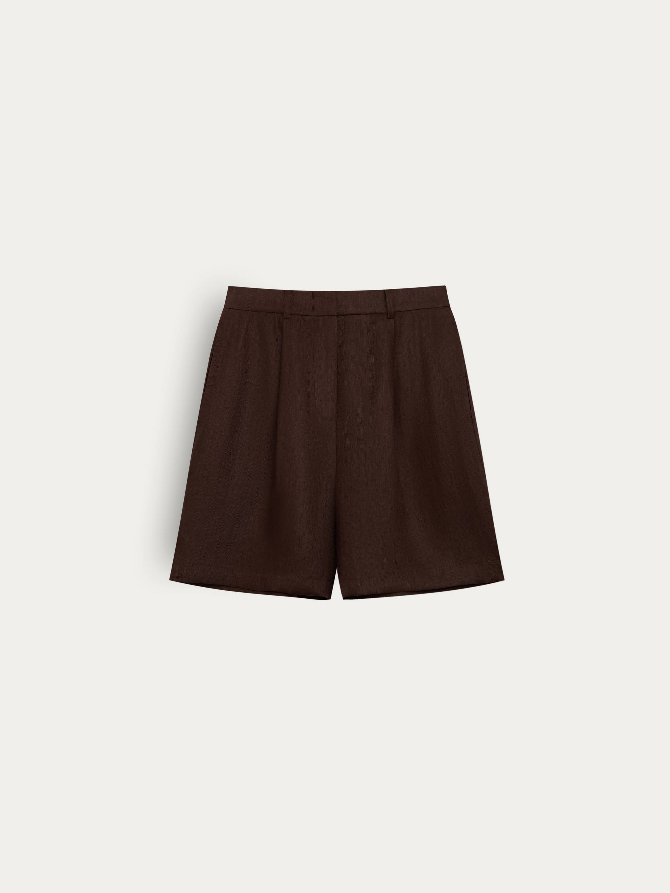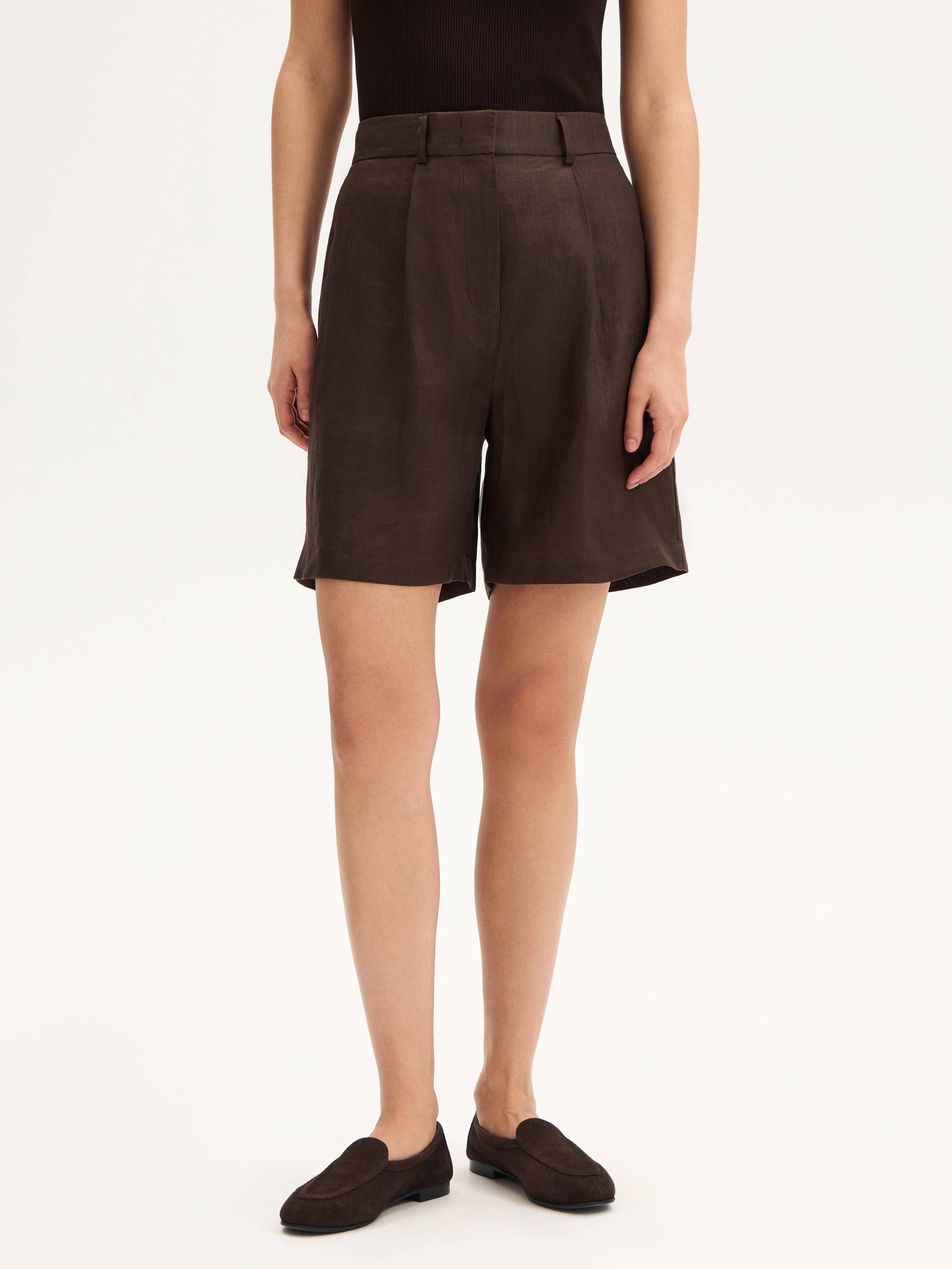 Эти льняные шорты — лаконичная база на теплый сезон. Прямой силуэт с классической посадкой, защипами и шлевками под ремень создает чистую форму и подчеркивает талию без давления. Натуральная ткань хорошо пропускает воздух, сохраняет ощущение прохлады и комфортно садится по фигуре. Лён придает фактуре легкую матовость и естественную пластичность — материал мягко драпируется и не теряет форму в течение дня. Носите с топами, сорочками или жакетами из комплекта — образ всегда будет собранным и элегантным.
