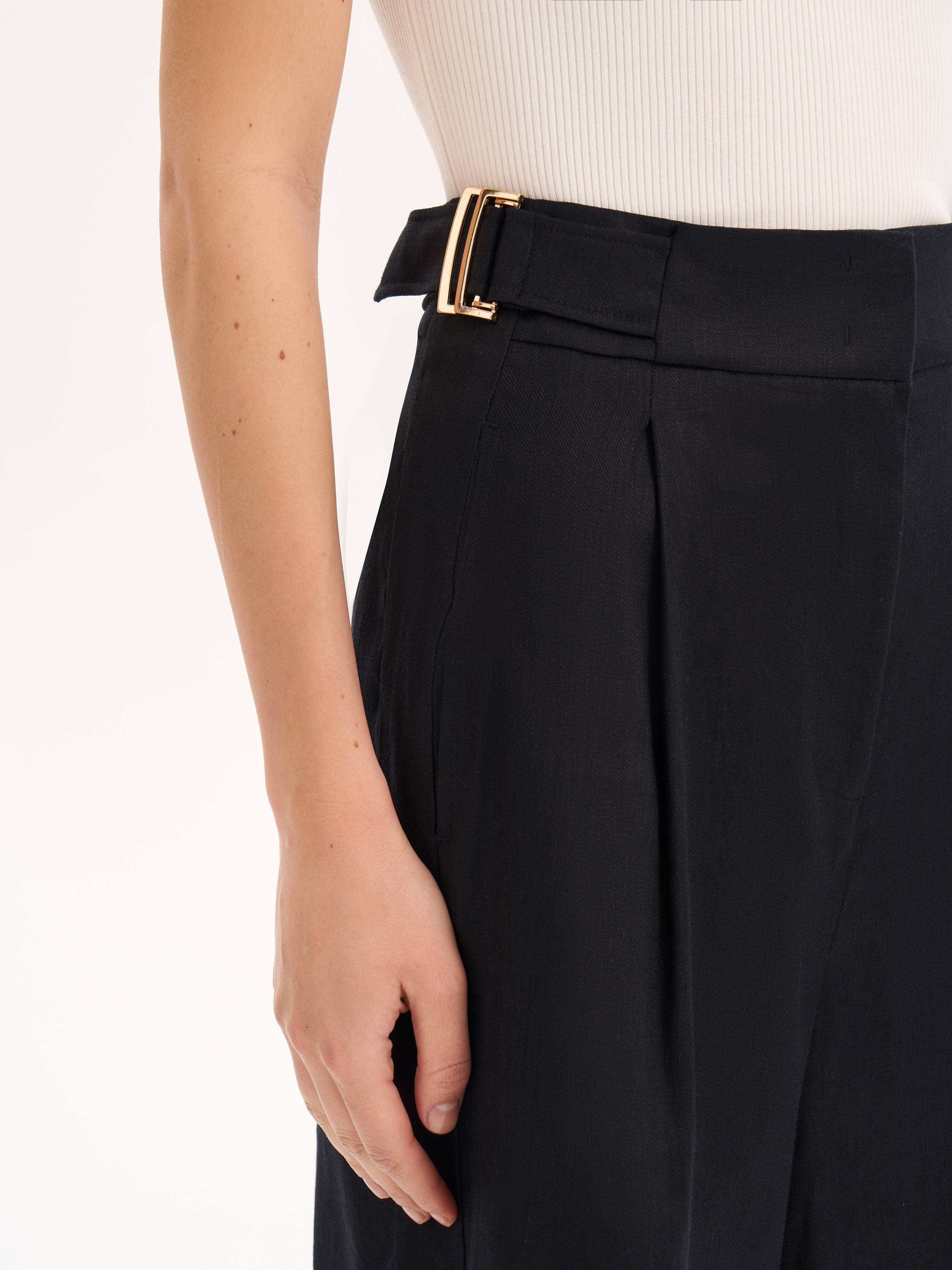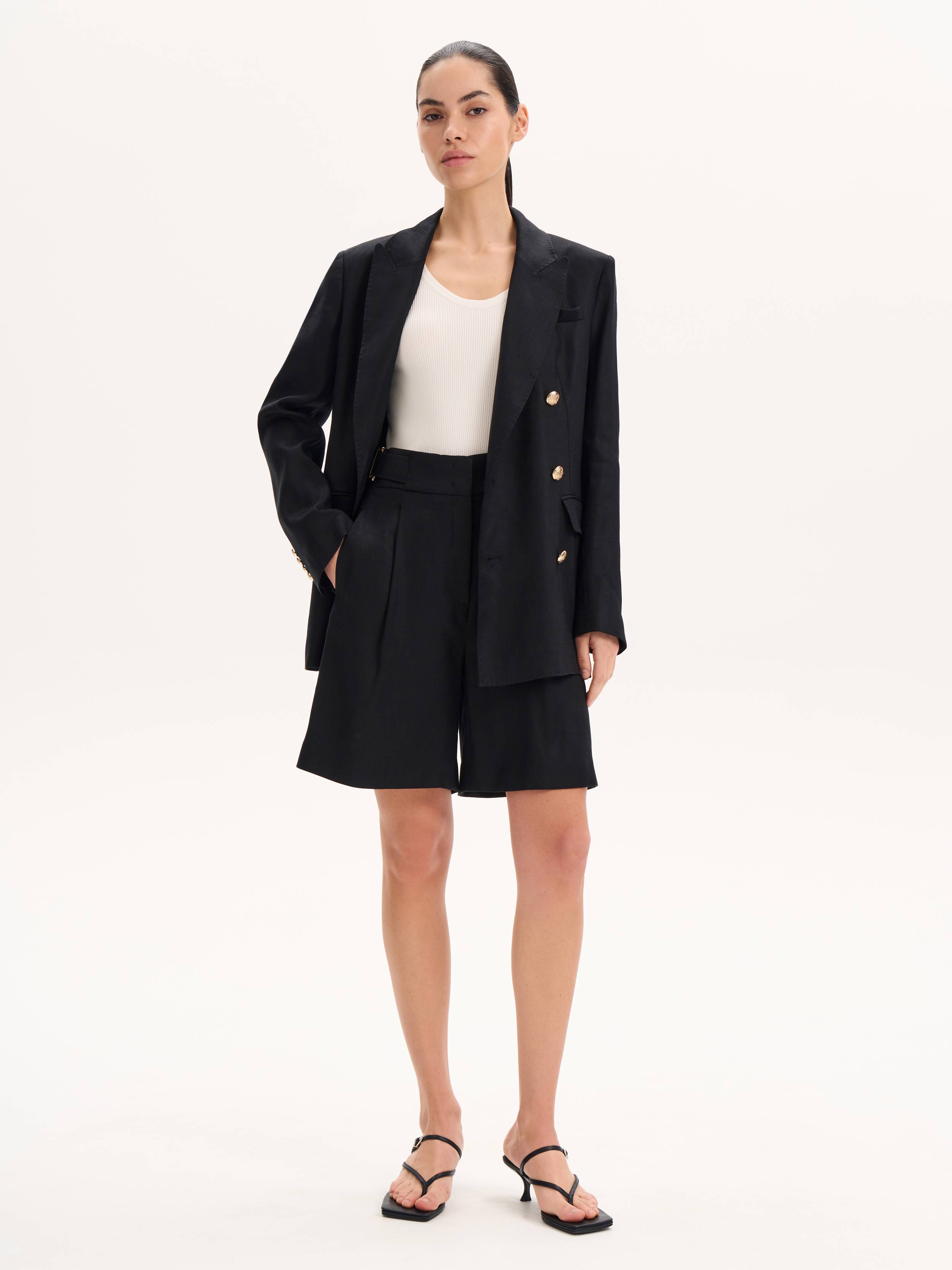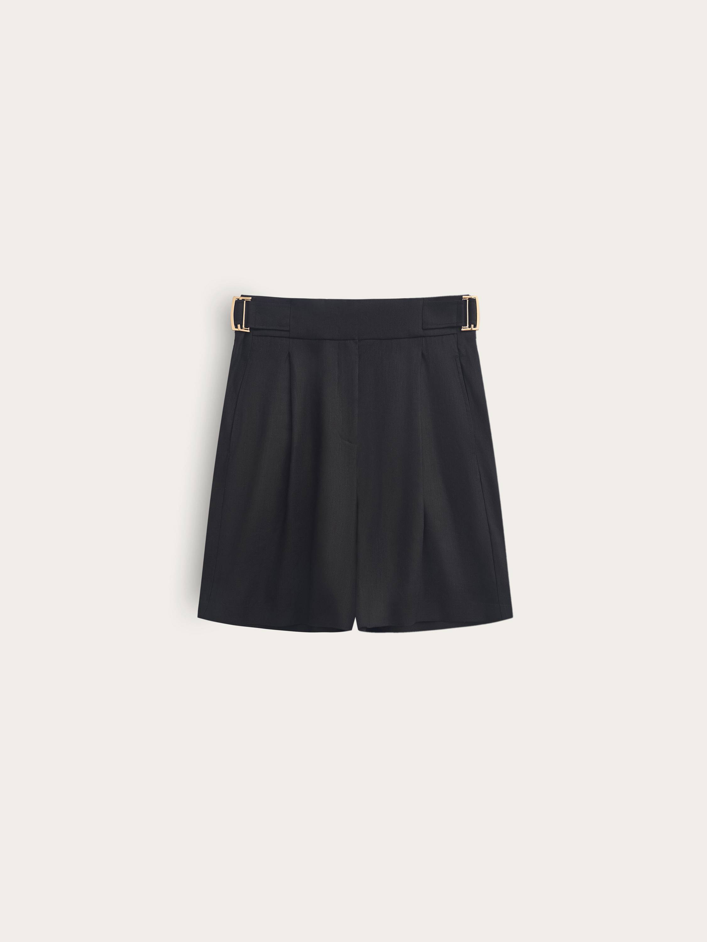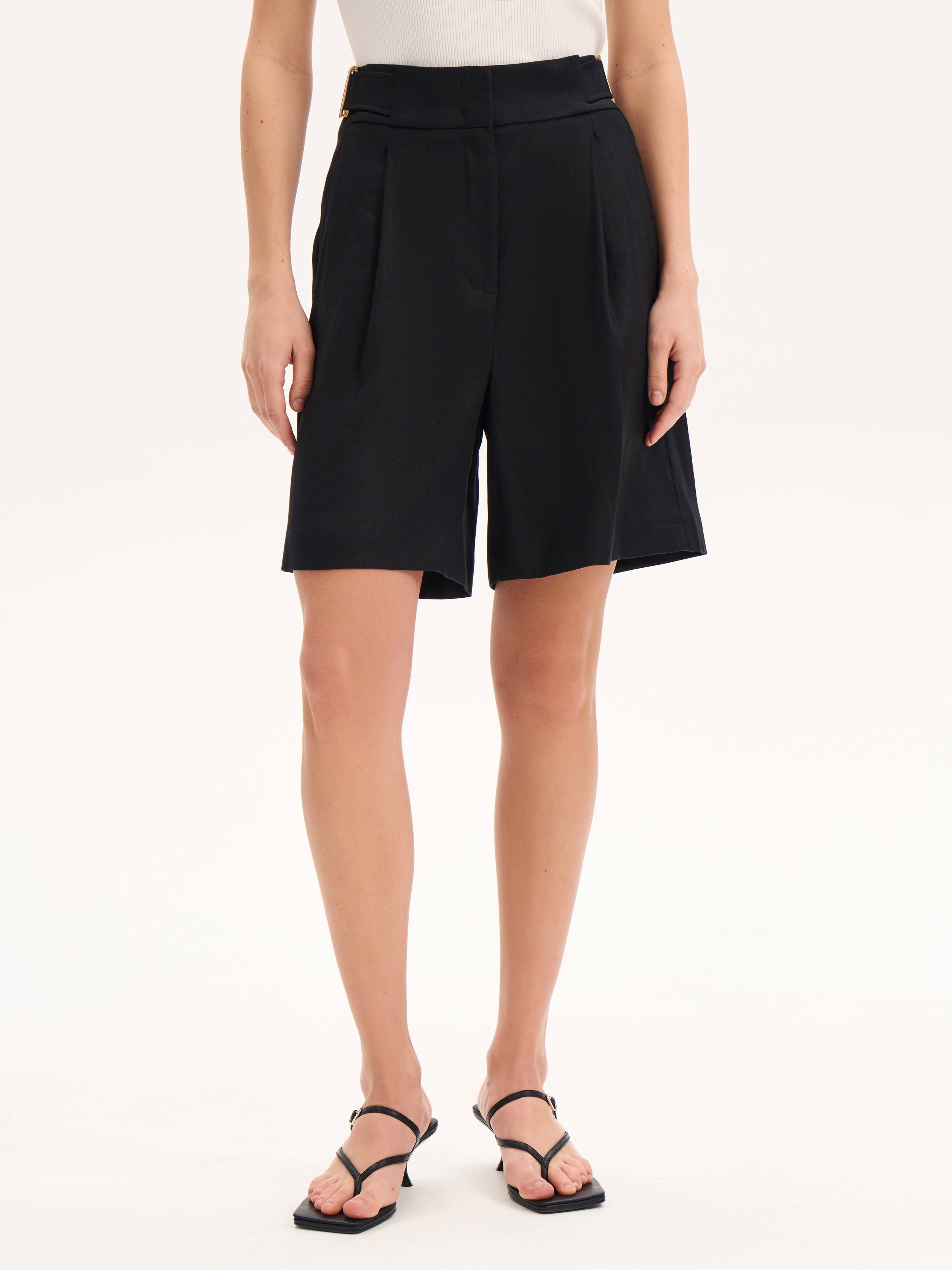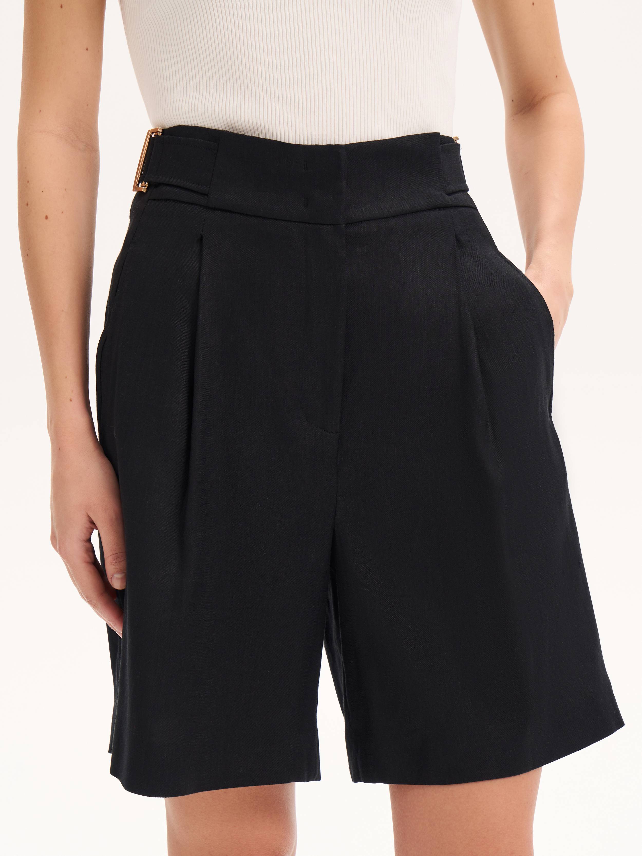 Структура и пластика в одном силуэте. Эти льняные шорты сочетают в себе лаконичную форму и деликатные конструктивные акценты: стрелки, мягкие складки от пояса и потайной крой застежки. Модель дополнена миниатюрными боковыми пряжками, позволяющими регулировать посадку на талии. Эти шорты выполнены из смесовой ткани с высокие содержанием льна — она дышит, мягко ложится по фигуре и сохраняет форму изделия. Носите шорты в паре с жилетом из того же материала или включайте в повседневные образы с топами, рубашками и легкими кардиганами.