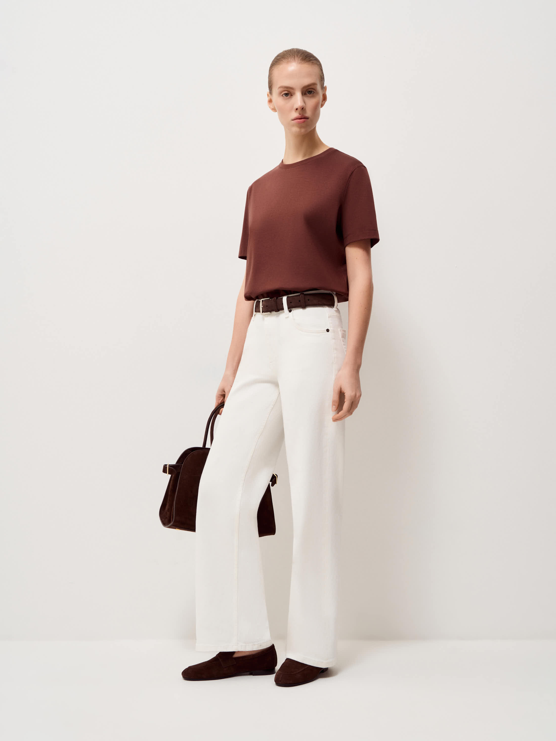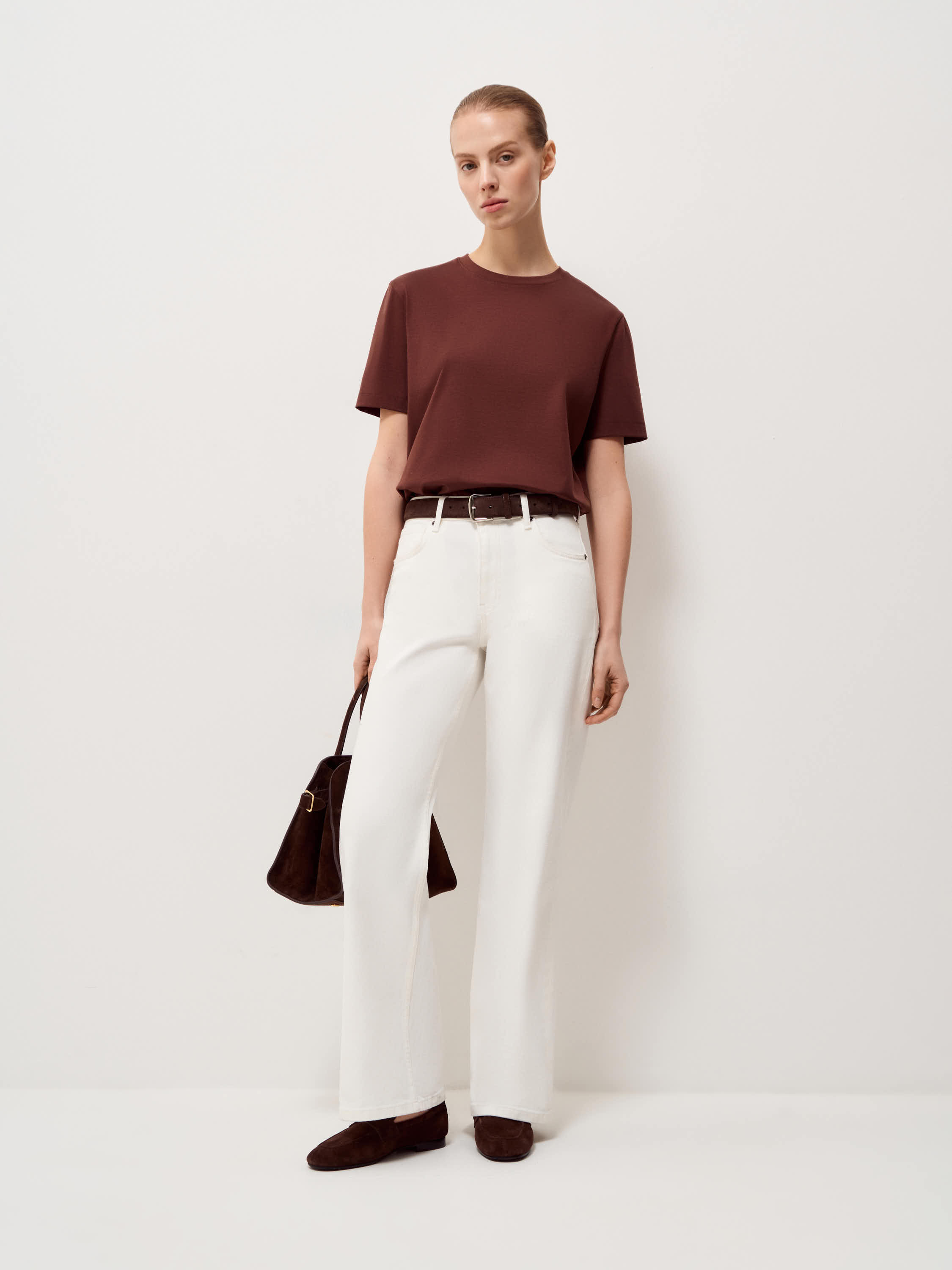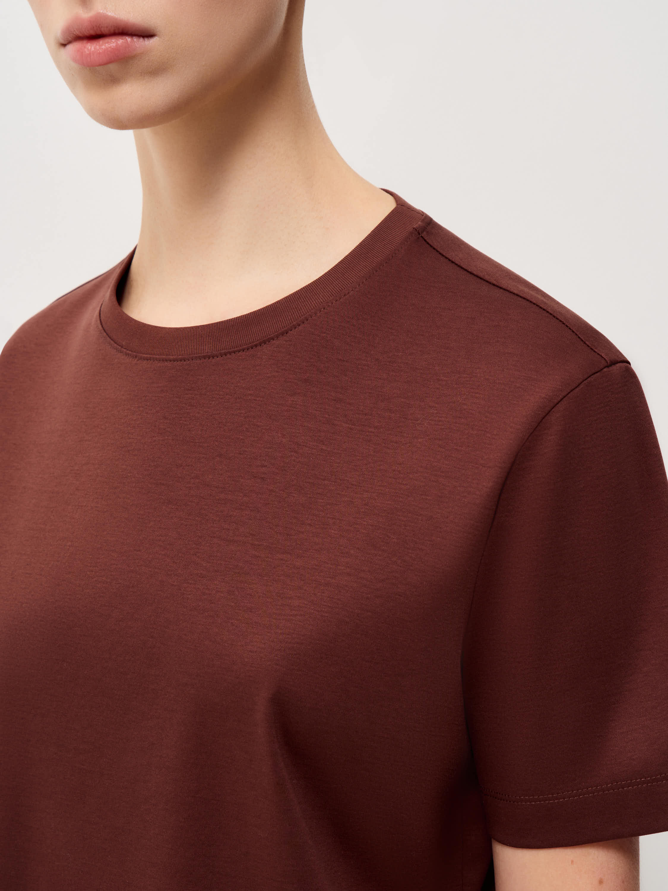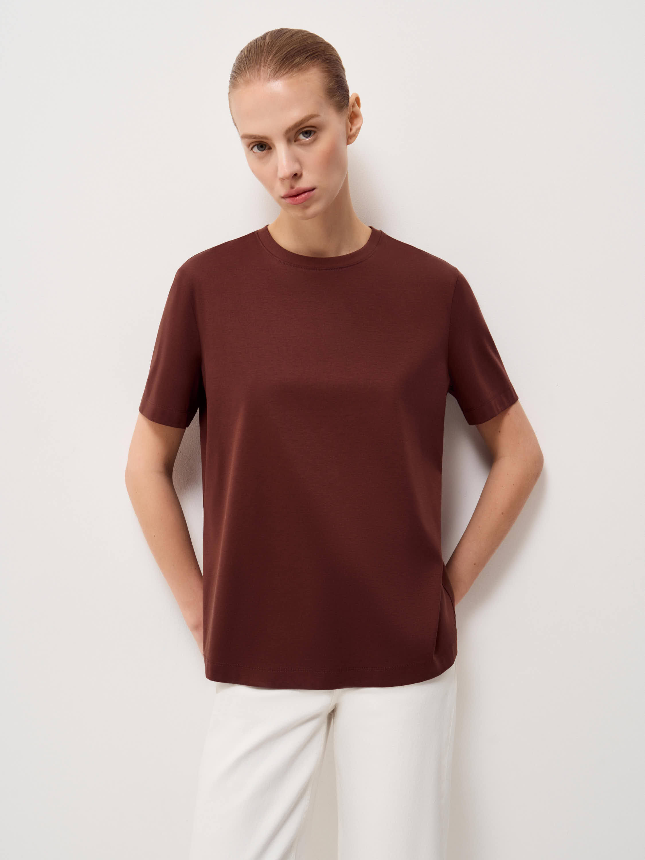 Футболка выполнена из мягкого трикотажа на основе хлопка с добавлением модала и тутового шелка. Материал гладкий, пластичный, приятный к коже, с ровной поверхностью без выраженной фактуры. Оттенок теплый карамельно-коричневый, спокойный и универсальный. Крой прямой, без излишнего объема, линия плеча естественная, посадка аккуратная и комфортная. Круглый вырез оформлен узкой планкой, короткий рукав классической длины. Модель органично сочетается с джинсами, прямыми брюками или юбкой и подходит для повседневных образов, а также для сочетаний с жакетом или рубашкой.