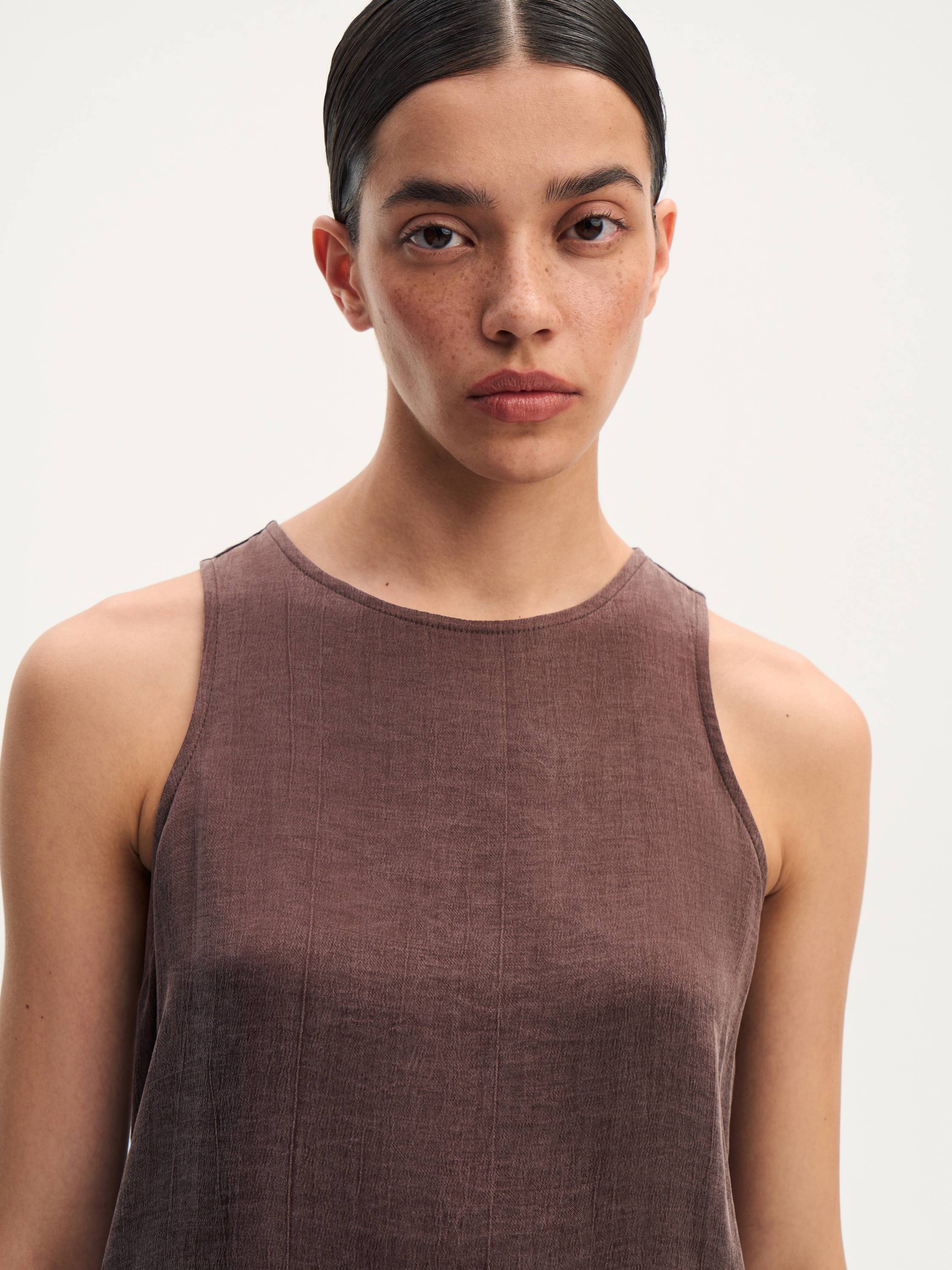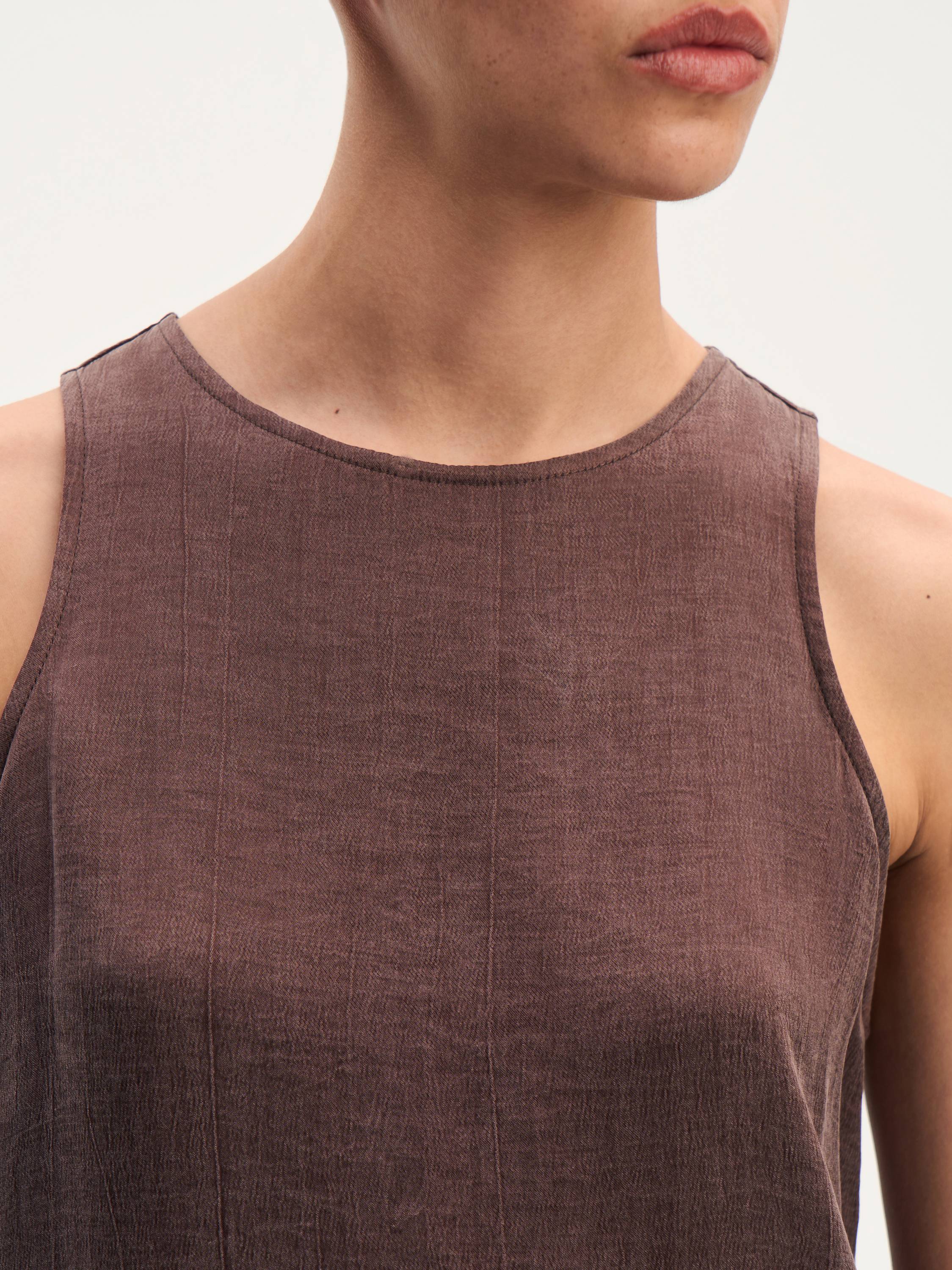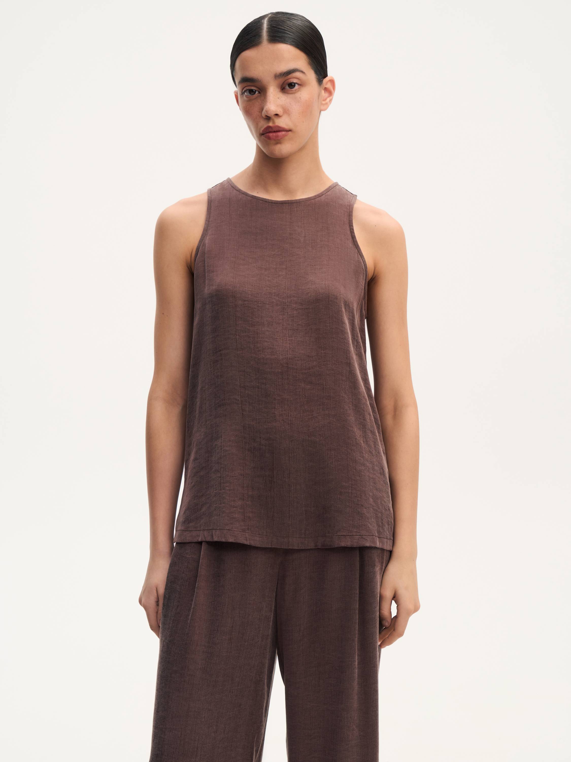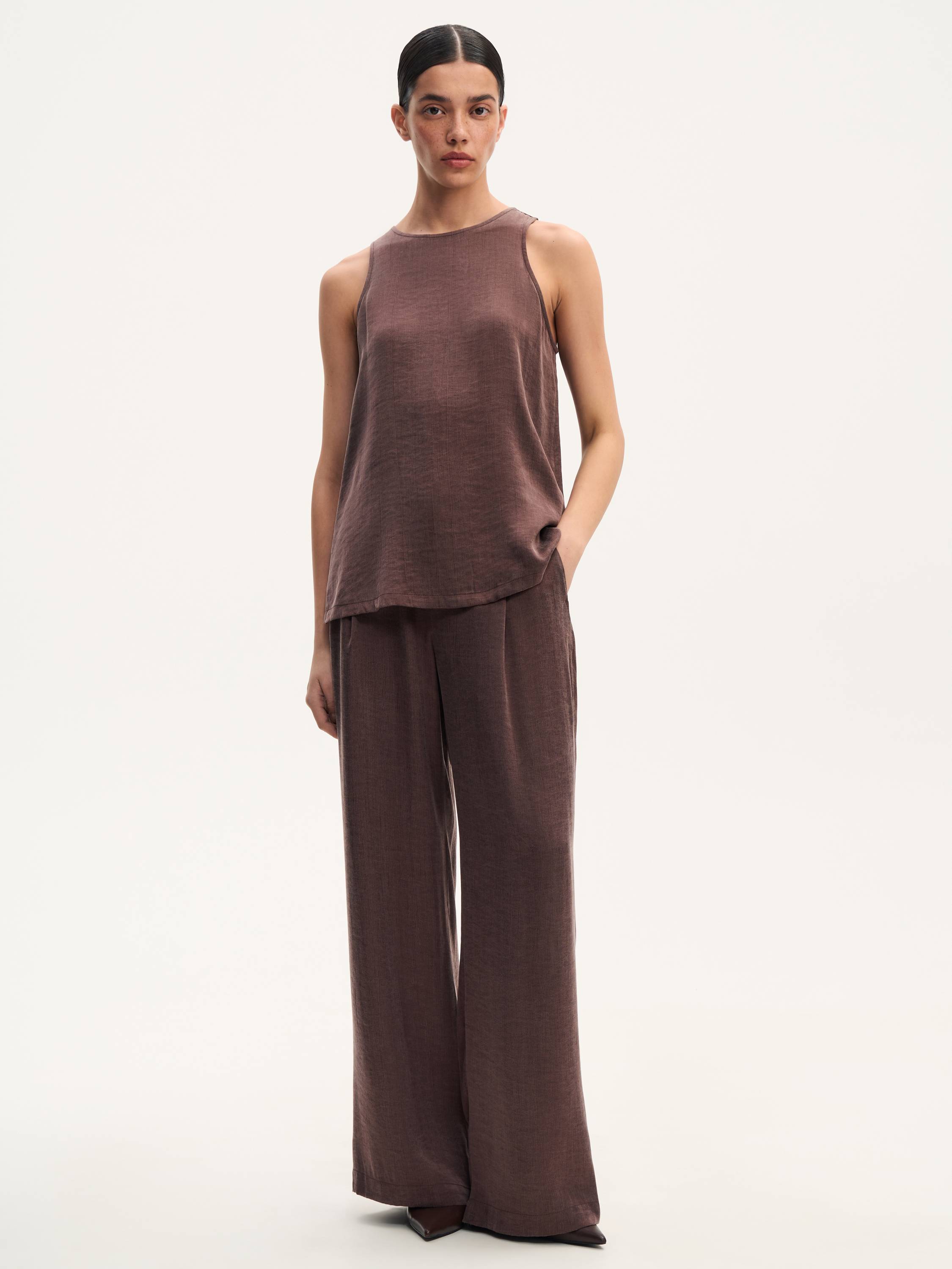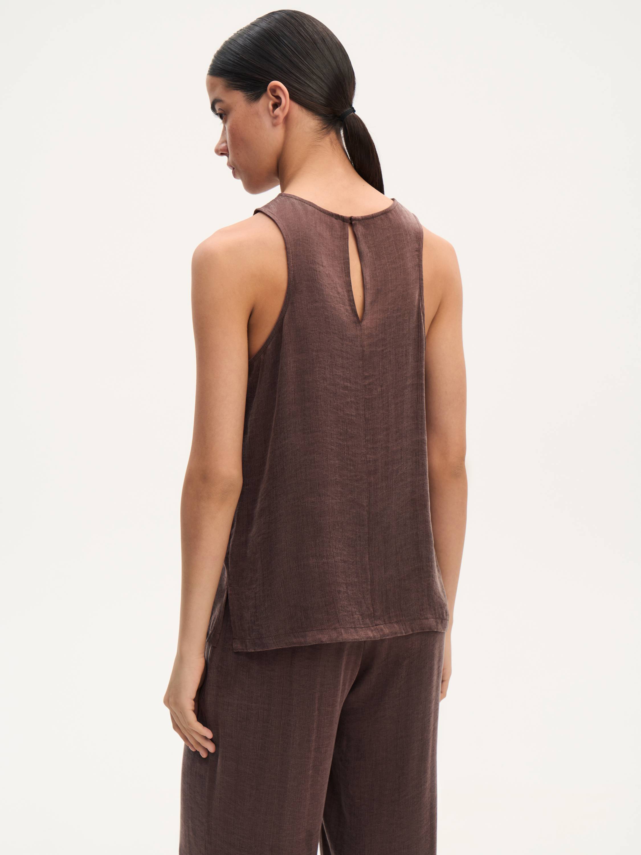 Топ из струящейся ткани — легкость и минимализм в каждой детали. Свободный крой мягко драпируется по фигуре, создавая комфортную посадку и ощущение невесомости. Открытая линия плеч подчеркивает хрупкость силуэта, а аккуратный вырез-капля на спинке добавляет элегантный акцент. Гладкая фактура ткани и лаконичный дизайн делают модель универсальной — она легко сочетается с классическими брюками, струящимися юбками или расслабленными джинсами, создавая стильные образы для разных случаев.