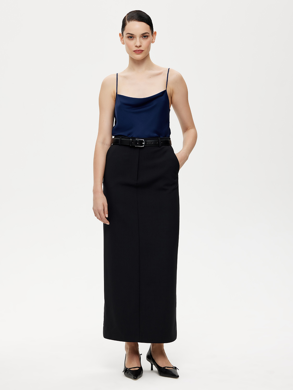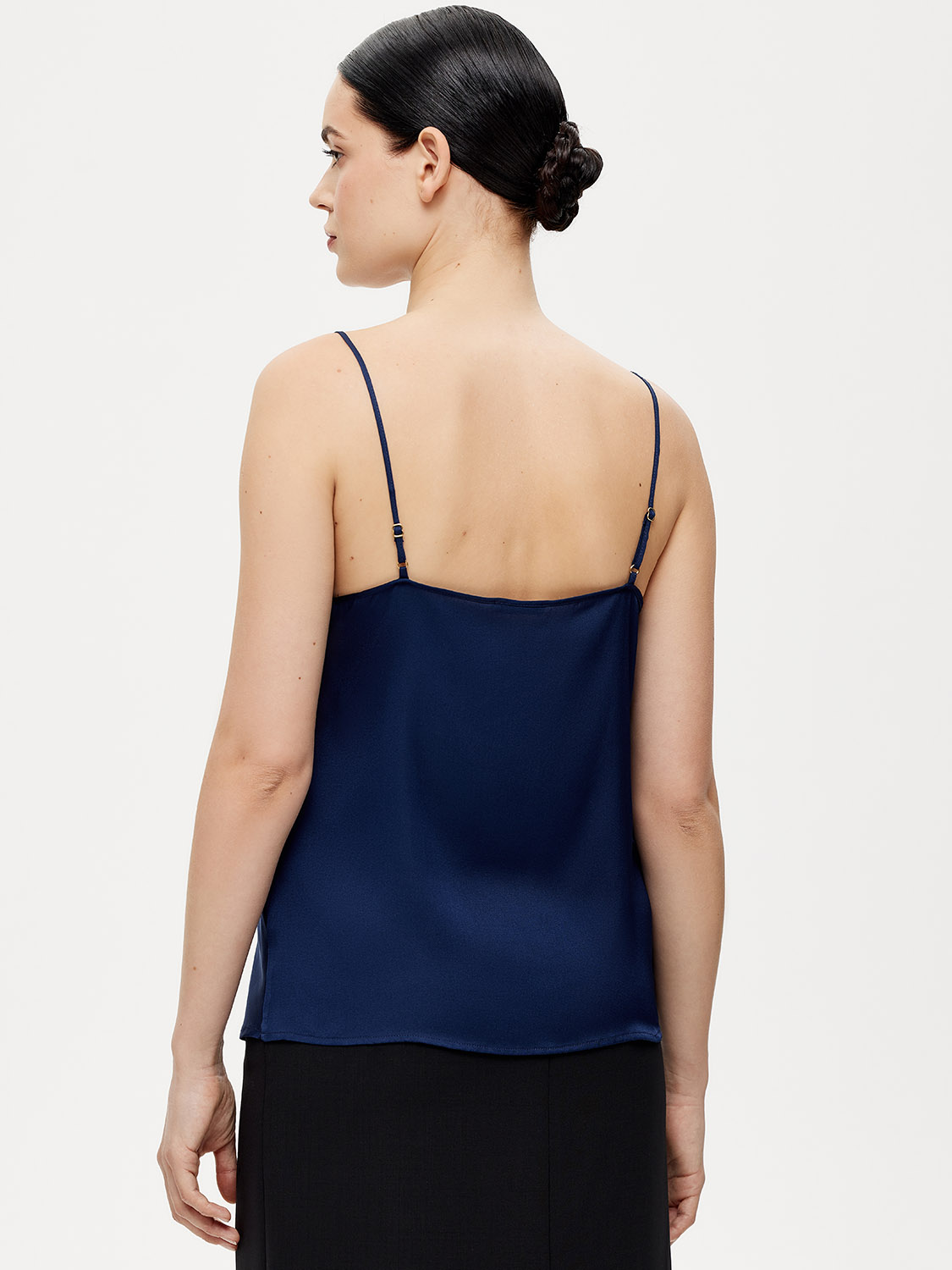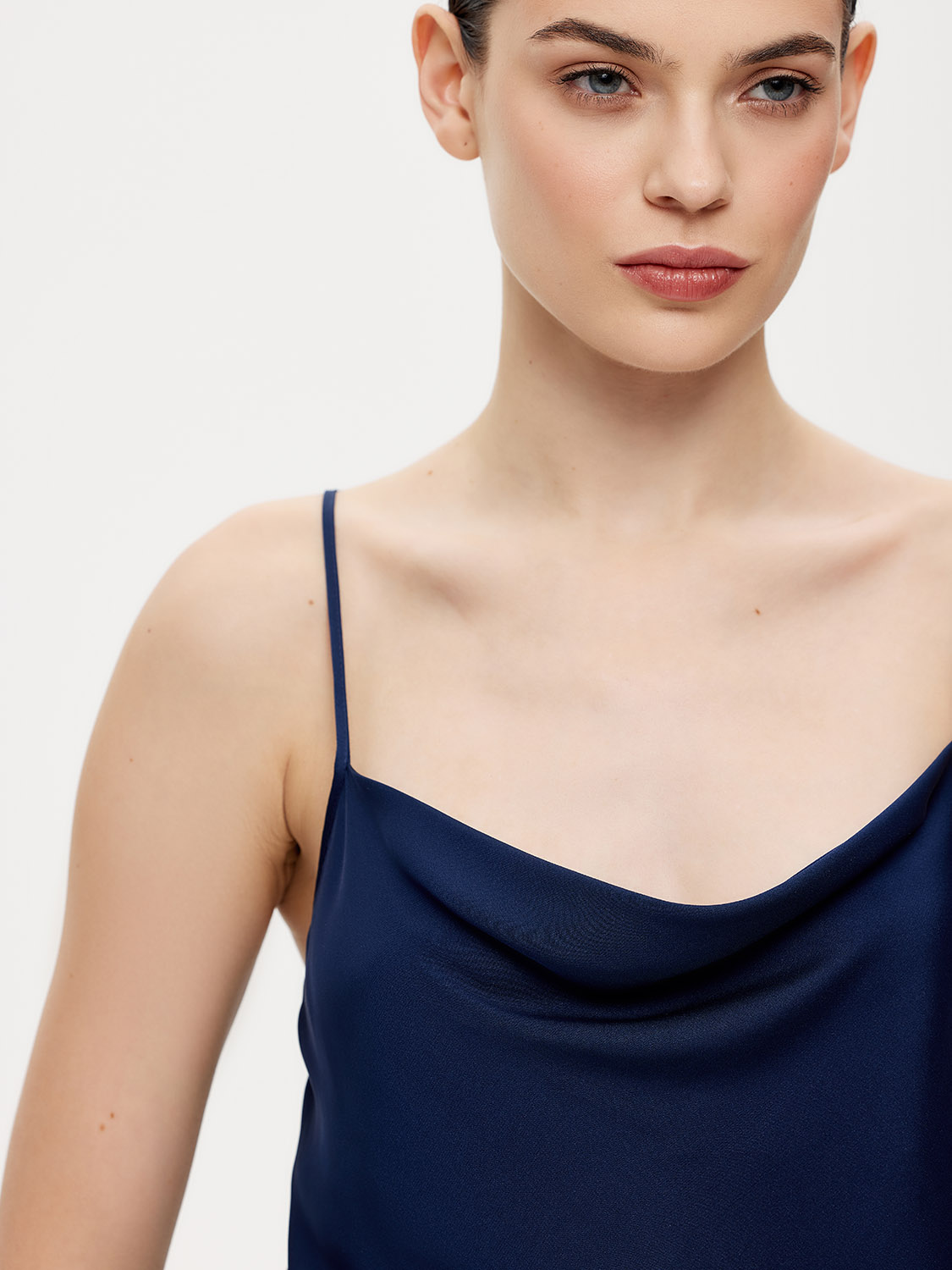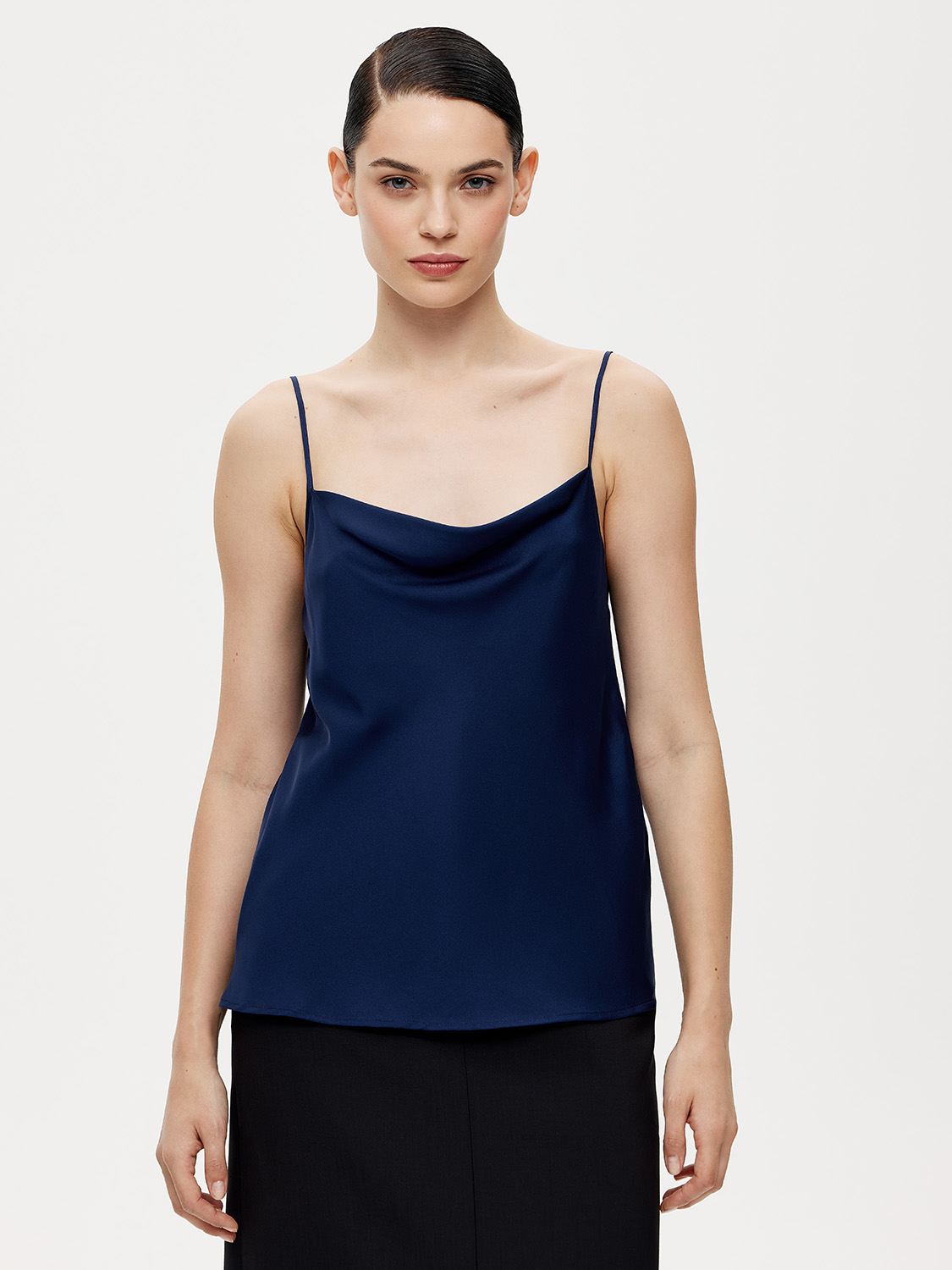 Изящный топ с тонкими бретельками. Длина бретелек регулируется. У топа свободный крой и вырез-качели. Топ выполнен из натурального тонкого гладкого шелка, нежного к коже, струящегося и прохладного. Роскошно драпируется, может выступать в комплекте с деловыми костюмами для совещаний и миди юбками для вечерних выходов, а джинсам добавляет непринужденного шика. На модели размер S. Параметры модели: рост 176, 89-67-94.