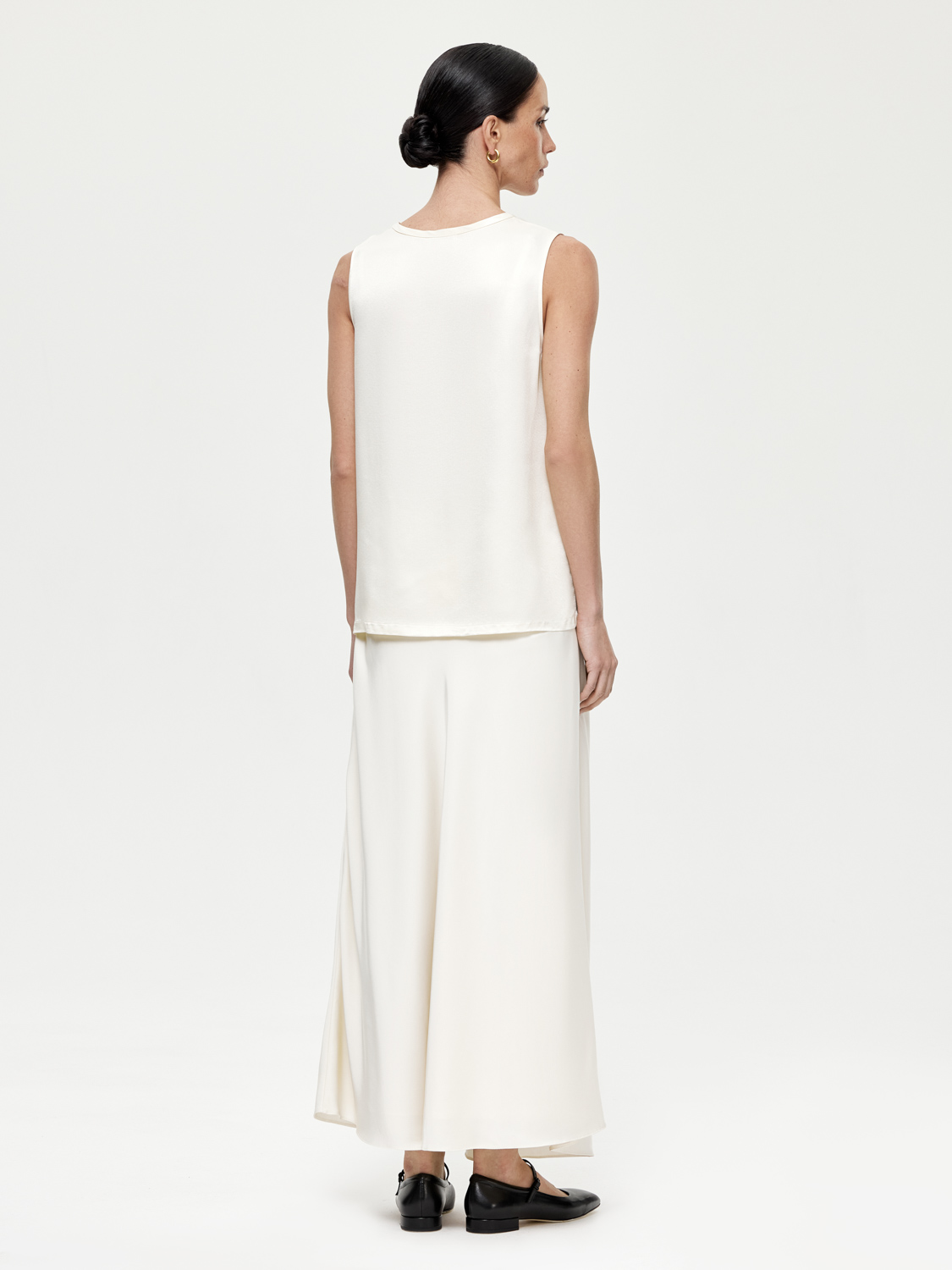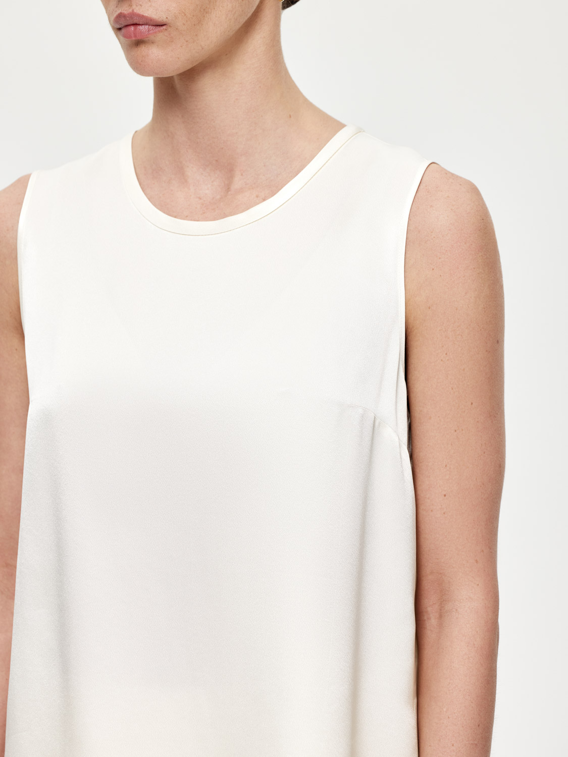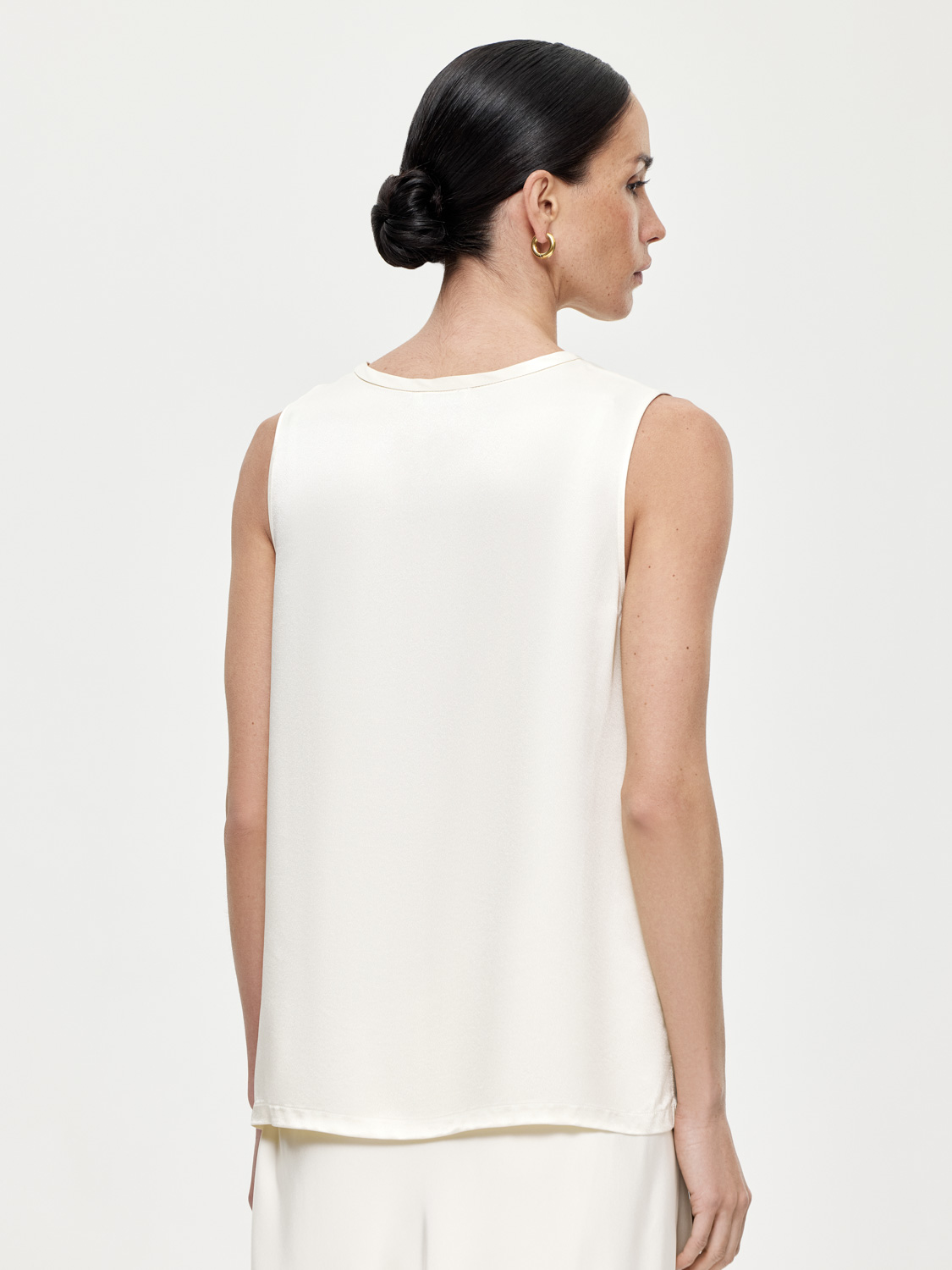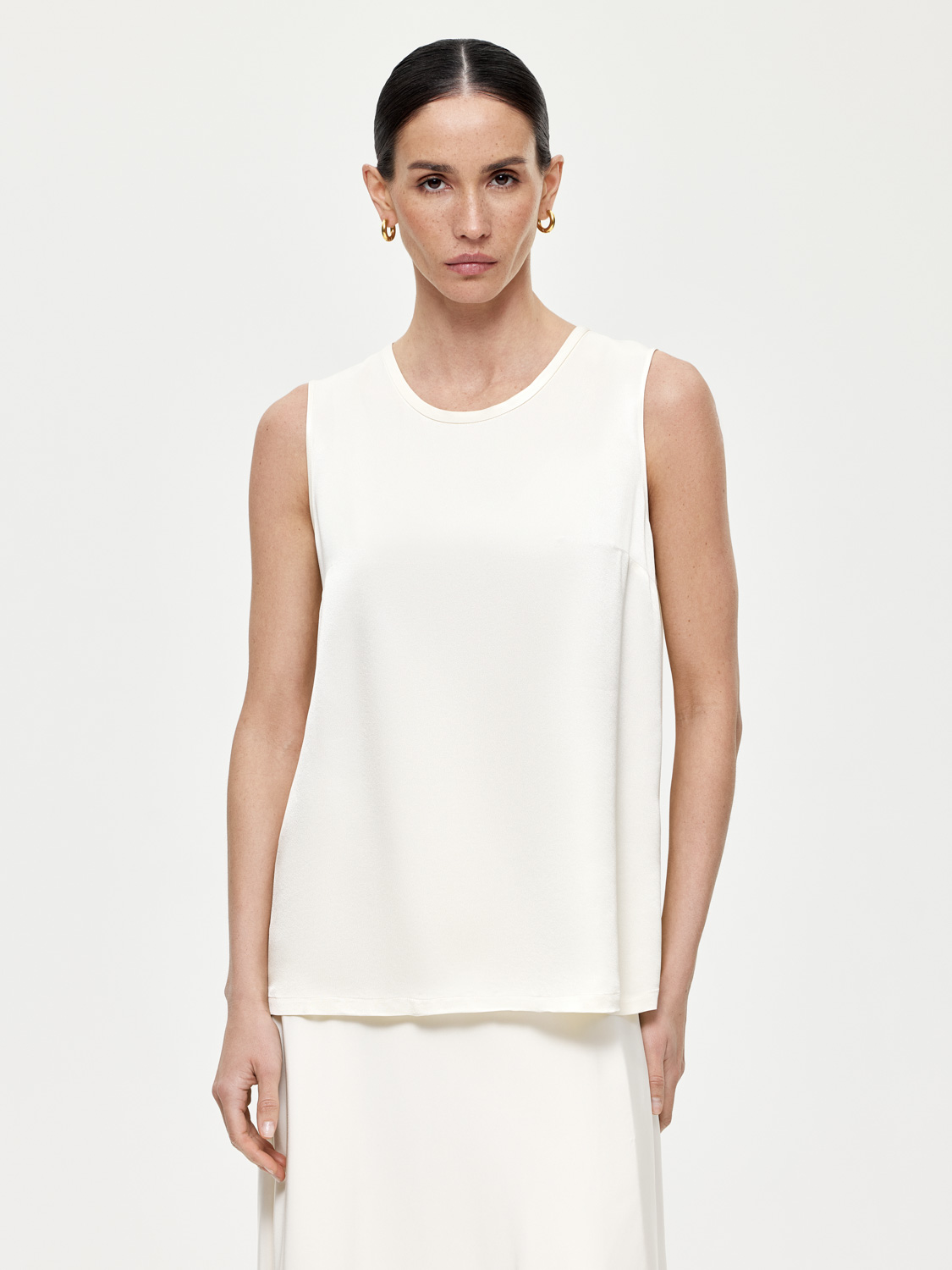 Лаконичный базовый топ из шелковистой вискозы станет отличной альтернативой хлопковым майкам и добавит изящества. Материал прочный и комфортный в носке. Топ с округлым вырезом прямого свободного кроя с изысканным деликатным переливом. Идеален в качестве первого слоя под кардиганы и жакеты. Подходит для костюмных ансамблей, casual вариантов с джинсами и шортами и вечерних акцентных выходов. На модели размер S. Параметры модели: рост 172, 81-58-87.