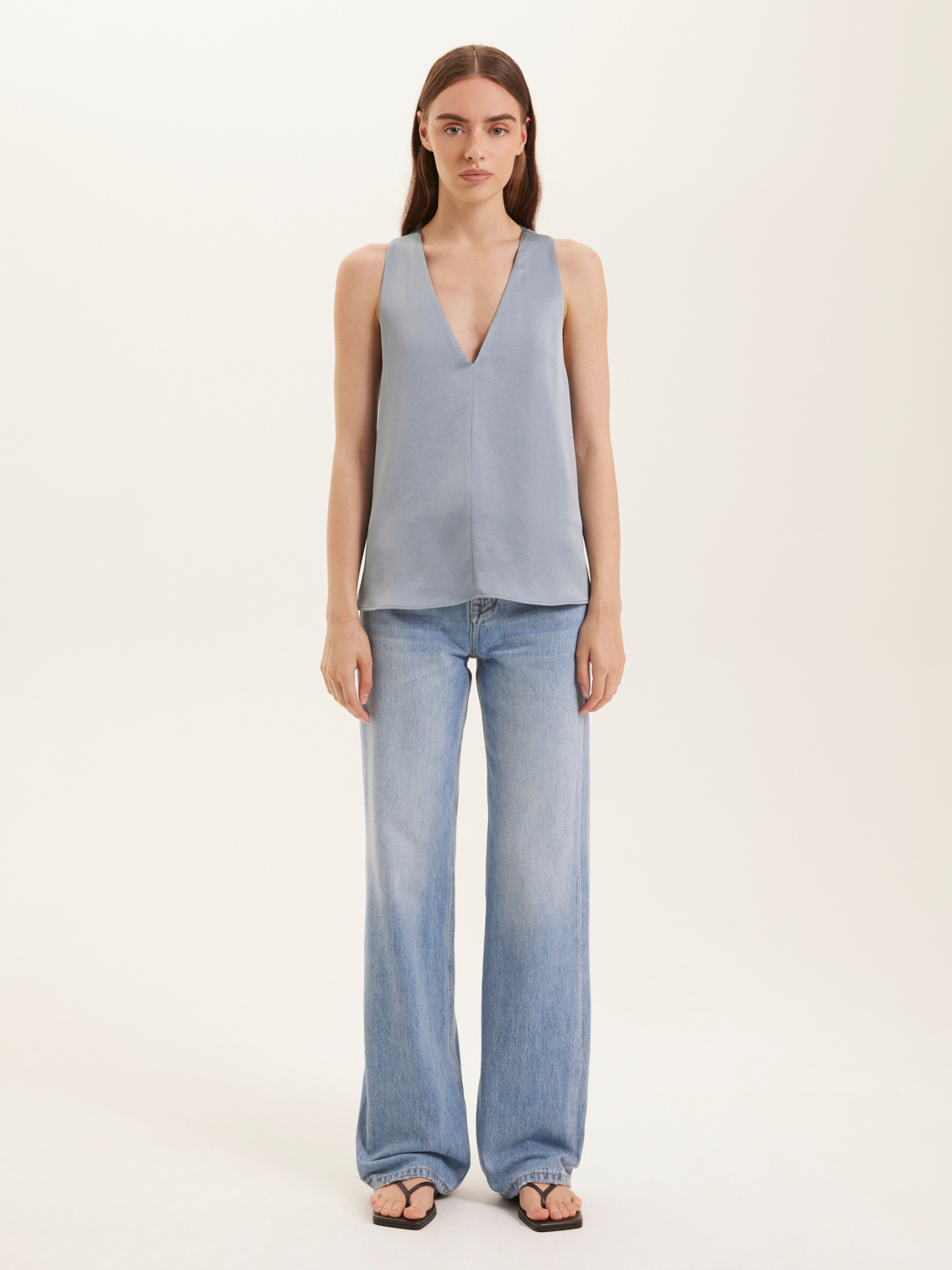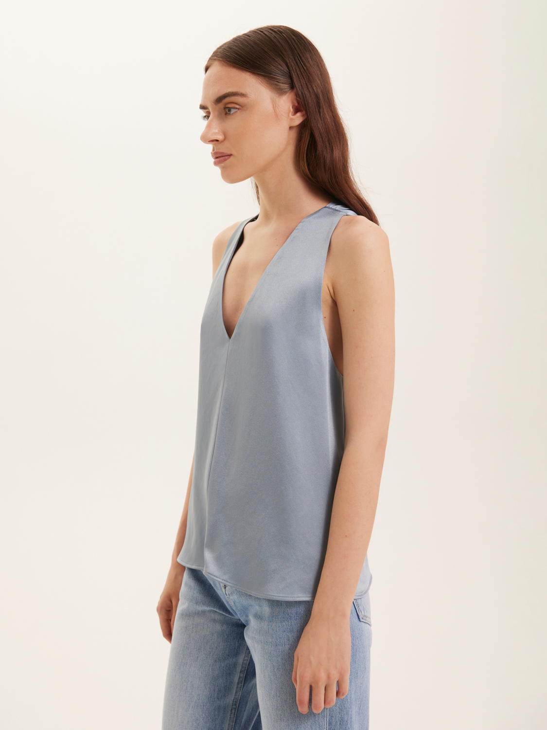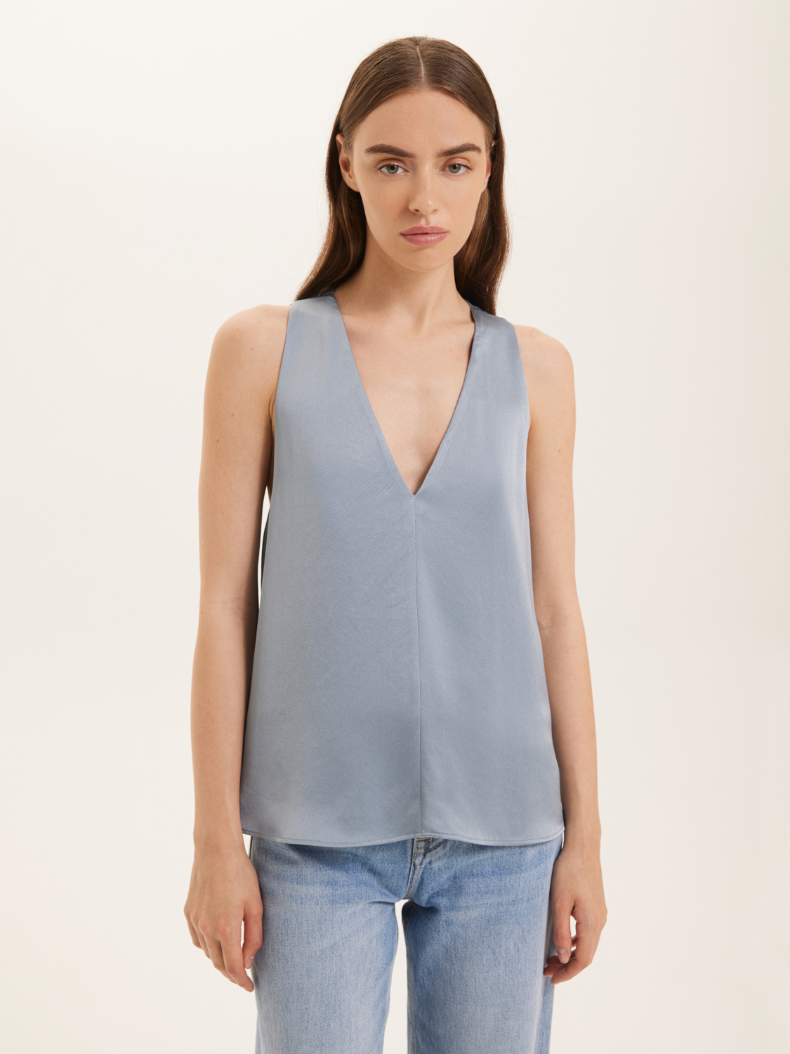 Топ свободного кроя из мягкого и шелковистого атласа. Материал приятен телу, с деликатным сиянием. Глубокий V-образный вырез подчеркивает зону декольте, а изысканное драпирование на спине добавляет изящества и утонченности. Топ можно сочетать с джинсами для повседневного выхода или с юбкой и аксессуарами для более нарядных случаев. На модели размер S. Параметры модели: рост 175, 80-60-87.