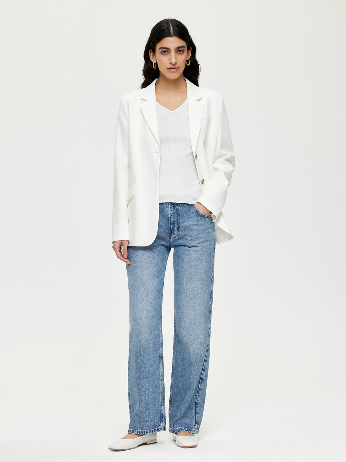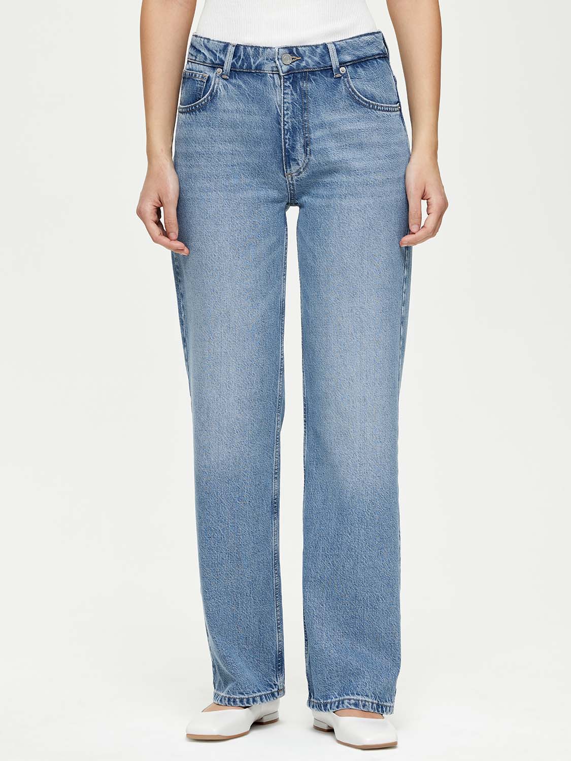Базовые прямые джинсы со средней посадкой. Застежка на молнию и пуговицу. Выполнены из шелковистого мягкого тенсела с добавлением переработанного хлопка. Такой материал тактильно приятный и гипоаллергенный. Он не вытянется со временем и долго будет сохранять презентабельный внешний вид. Джинсы со слегка выбеленным эффектом, который придает винтажный лоск. Носите с футболками и топами, рубашками и блузами, дополняйте жакетами, кардиганами и бомберами. За счет полной длины обувь может быть как на каблуке, так и на плоском ходу. На модели размер 26. Параметры модели: рост 177, 81-61-92.