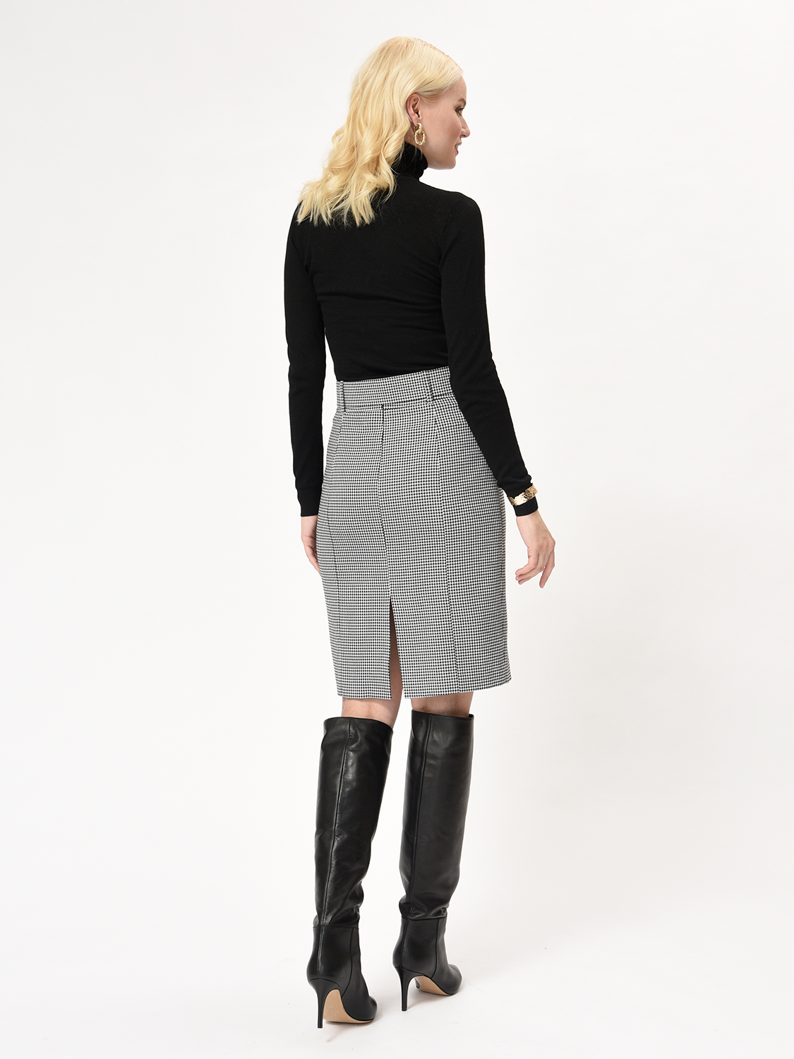 Элегантная юбка карандаш с узором гусиная лапка и поясом на талии. Благодаря смесовой ткани с добавлением вискозы и шерсти юбка не растягивается, не закатывается и не собирается, идеально сидит по фигуре и подчеркивает силуэт. Ткань плотная и не просвечивает. Юбку можно считать базовой и универсальной, так как она подойдет для работы, офиса и деловых встреч, а дополнив аксессуарами образ, можно надеть на праздничное и торжественное событие.