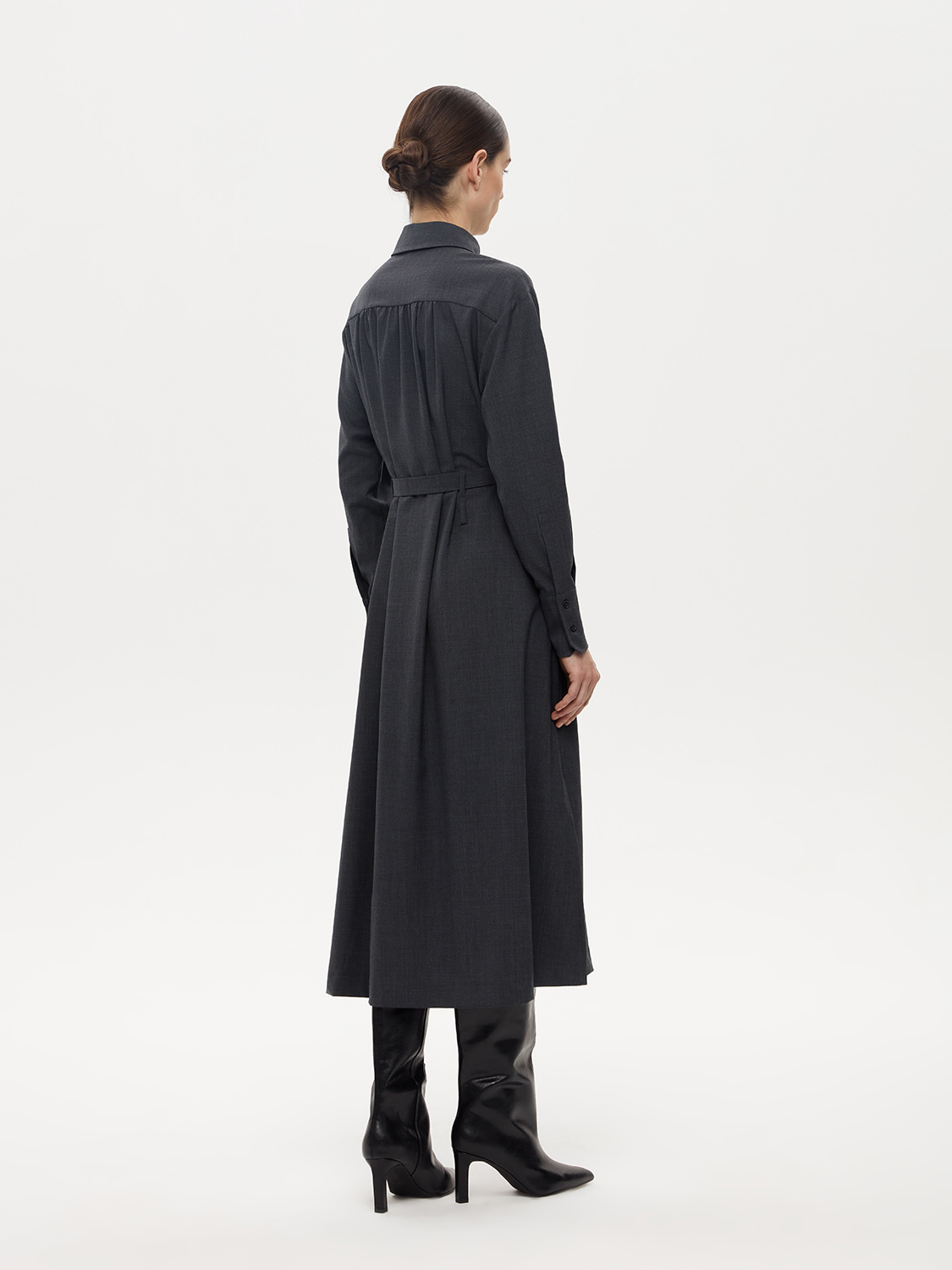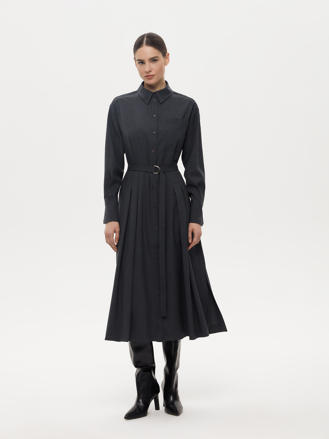 Элегантное платье миди рубашечного кроя из смесовой шерсти. Шерсть придает ткани мягкость, теплоту и долговечность, а вискоза и полиэстер делают её более износостойкой и устойчивой к истиранию. Длина миди подходит для различного типа фигуры и роста, рубашечный крой создает расслабленный и в то же время элегантный силуэт. Съемный пояс на талии подчеркивает женственные изгибы фигуры и создает в меру строгий образ, а застежка спереди на пуговицы обеспечивает удобство при надевании и снятии платья. На модели размер S. Параметры модели: рост 176, 80-59-89.