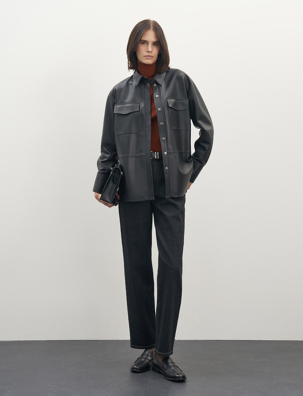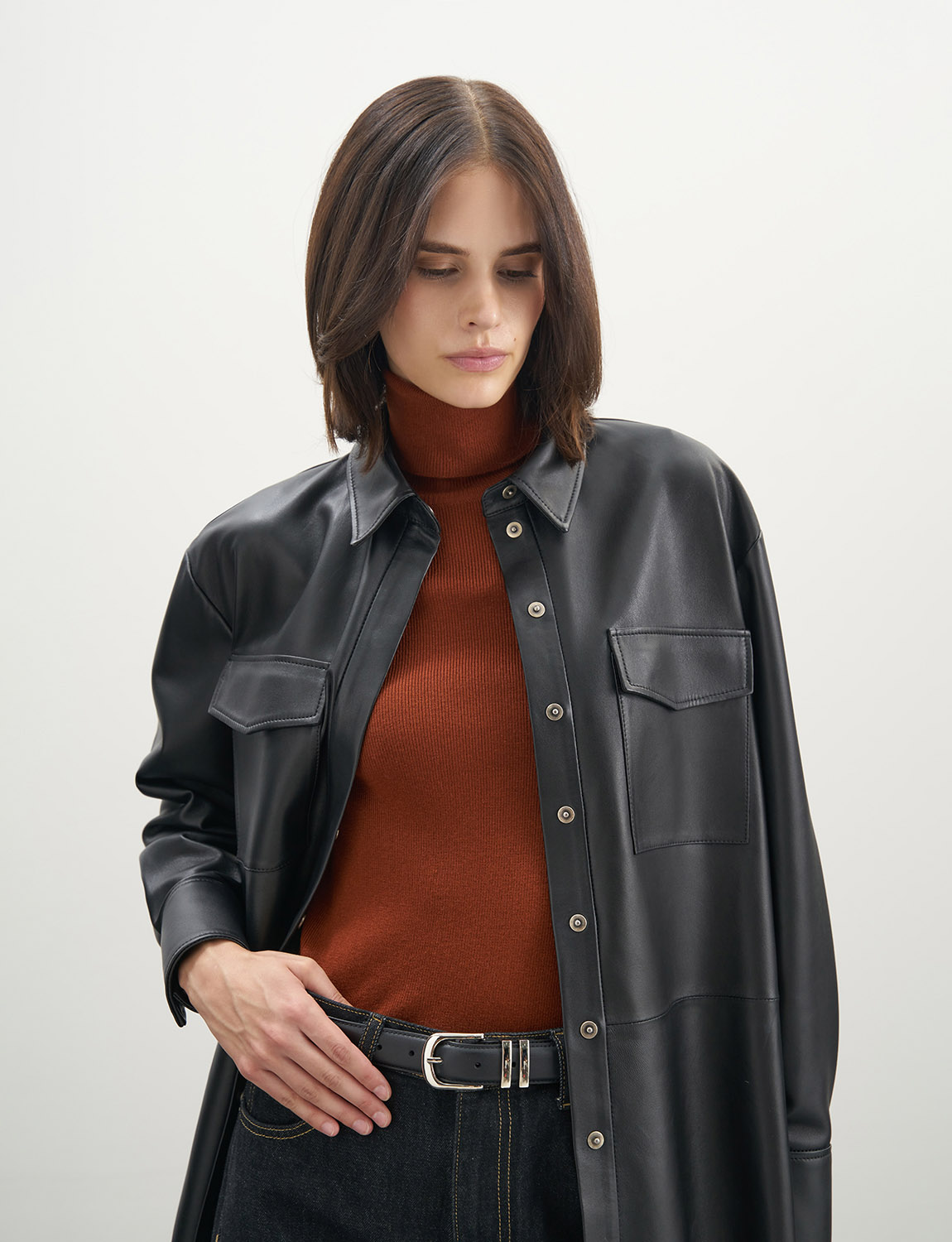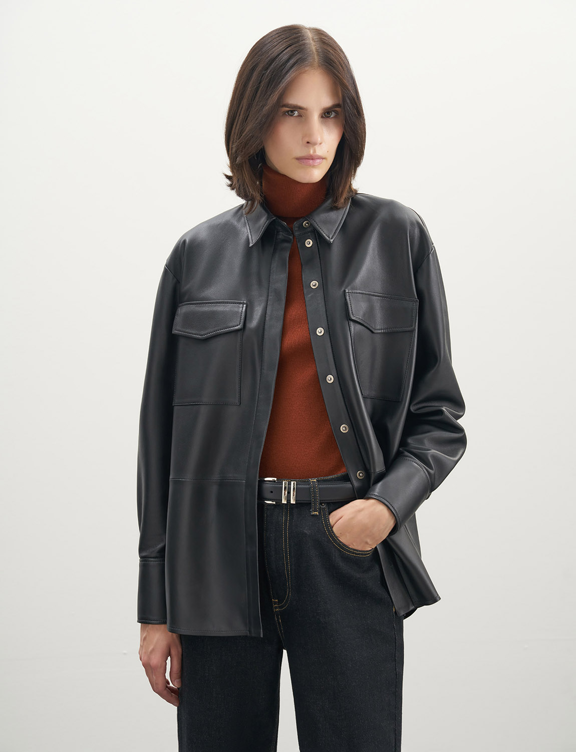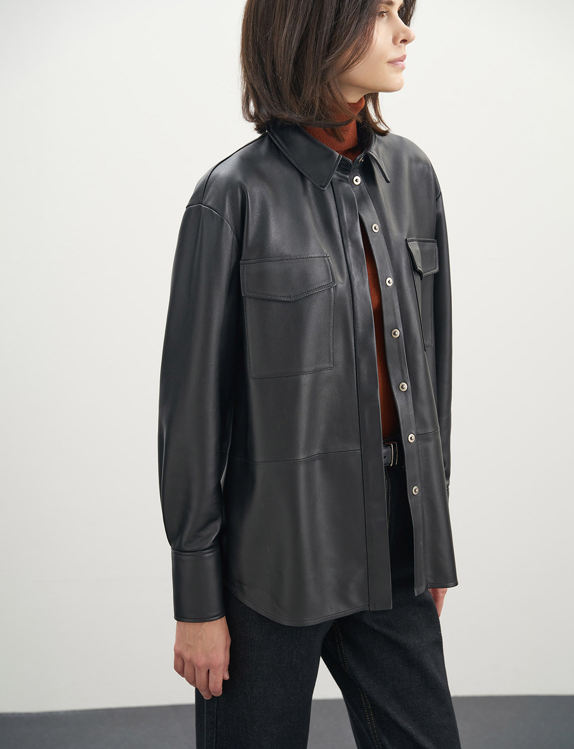 Элегантная и стильная рубашка из премиальной овечьей кожи отличается своей мягкостью и гладкой фактурой. Нагрудные карманы придают модели функциональности, а застежка со скрытой планкой обеспечивает комфортную посадку. Рукава с манжетами подчеркивают изящество рук, а свободный крой оверсайз подходит для любой фигуры. Рубашка сочетается с джинсами, леггинсами и кожаными брюками. Дополните свой образ стильными ботинками или сапогами на каблуке. Рубашка станет ярким и дерзким элементом гардероба для создания разнообразных образов, а также подойдет для деловых встреч и вечерних мероприятий. На модели размер S. Параметры модели: рост 179, 75-59-87.