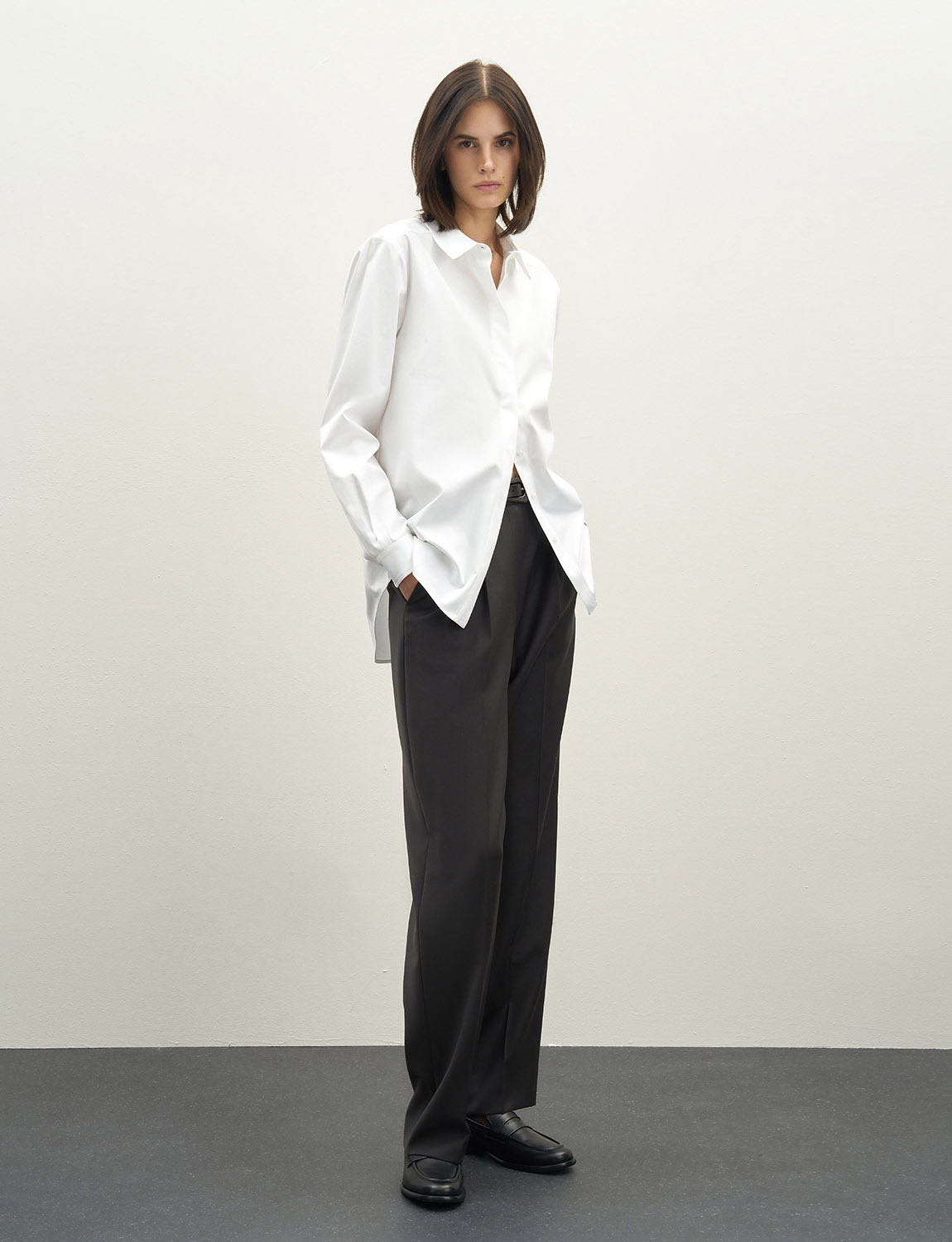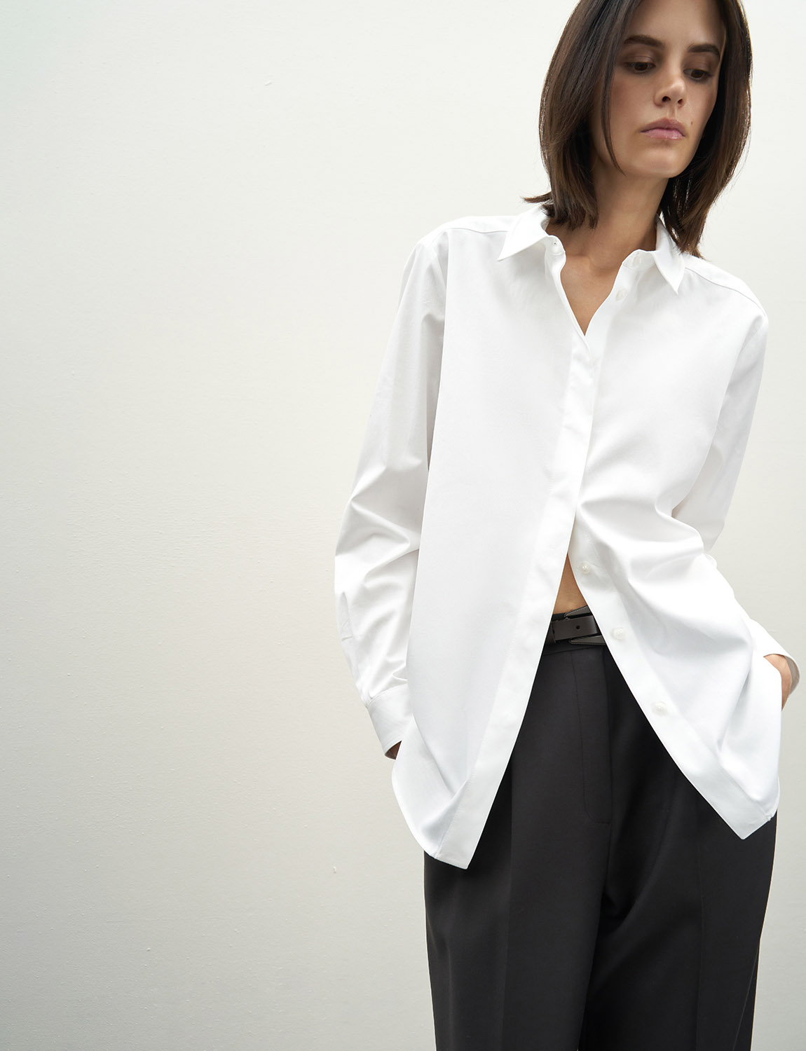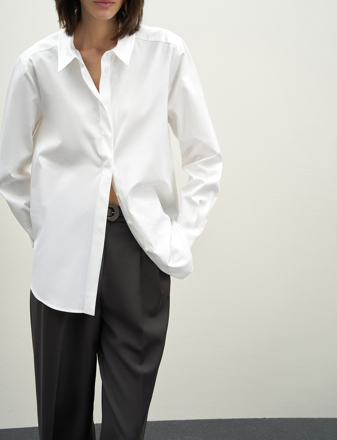 Базовая хлопковая рубашка оверсайз. Классический ворот, застежка на пуговицы со скрытой планкой, манжеты на рукавах. Благодаря натуральному составу ткани, рубашка приятна телу, свободно сидит по фигуре и подойдет под любой её тип. Стильно сочетается с кэжуал образами - джинсами, лоферами или кедами, а также с классическими брюками, юбками и жакетами. Универсальный и незаменимый вариант для работы и офиса, деловых встреч и повседневной жизни. На модели размер S. Параметры модели: рост 179, 75-59-87.