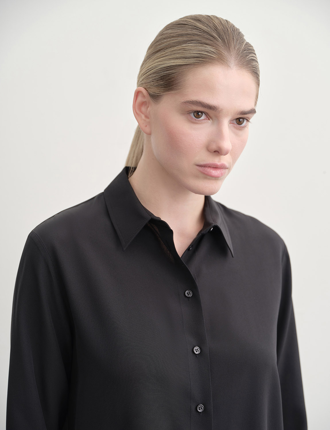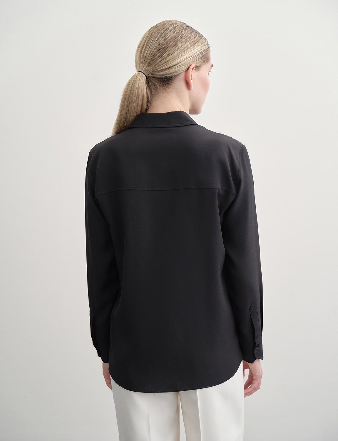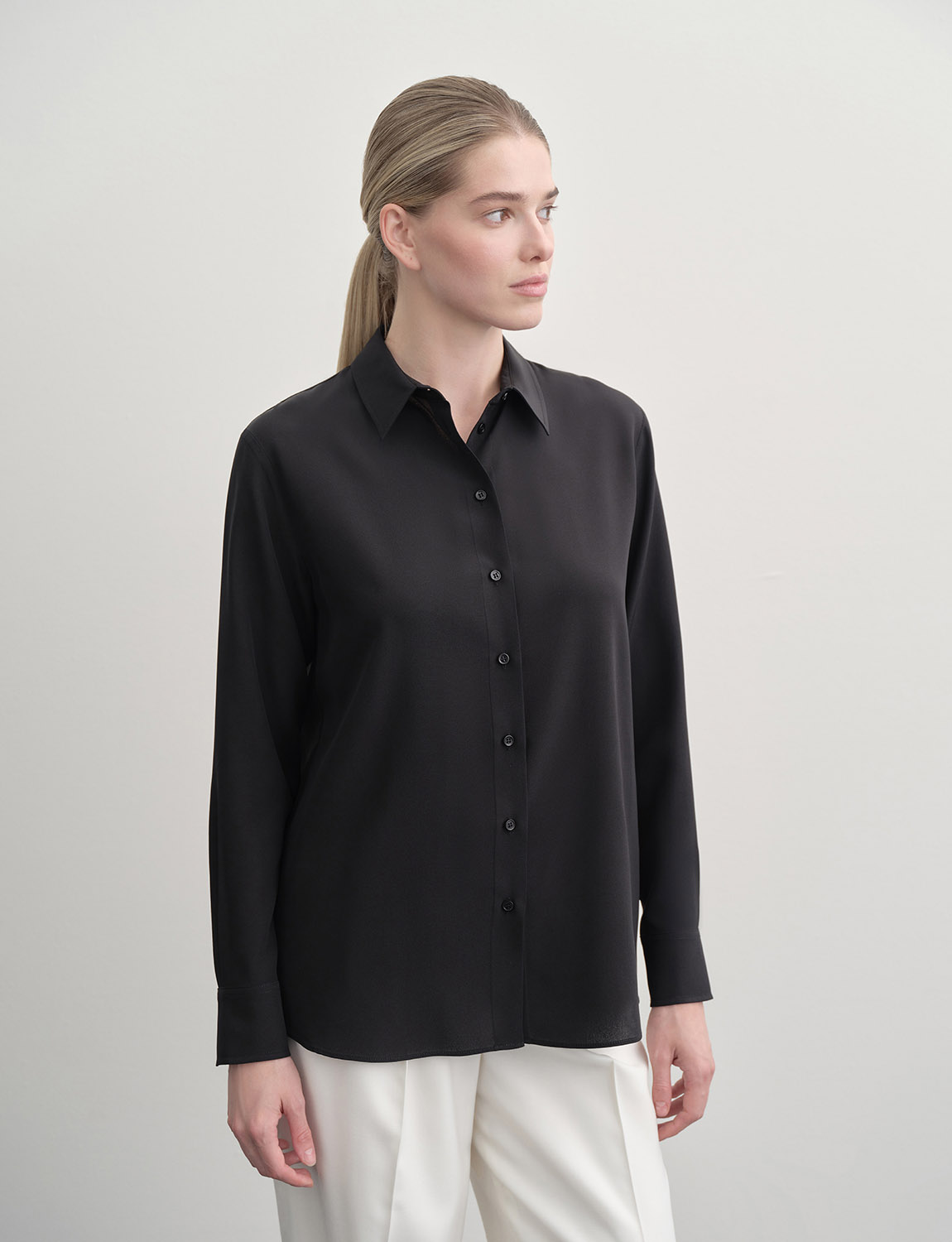 Рубашка прямого кроя из гладкого натурального шелка. Классический воротник, длинные рукава с манжетами и застежка спереди на пуговицы. Натуральный шелк - долговечный материал, мягкий и гладкий на ощупь, обеспечивает хорошую воздухопроницаемость и сохраняет прохладу даже в жаркую погоду. Шелк гипоаллергенен и не вызывает раздражения кожи. Рубашку можно сочетать с джинсами и брюками, с юбками и костюмными шортами. В качестве обуви можно выбрать классические туфли, ботильоны или лоферы. Рубашка подойдет для работы или деловых встреч, а также для вечерних выходов и прогулок. На модели размер S. Параметры модели: рост 174, 86-63-90.