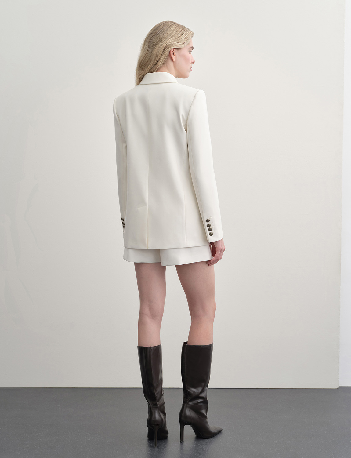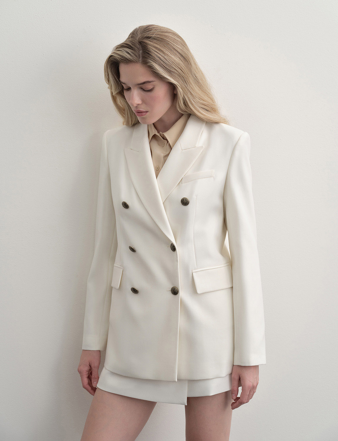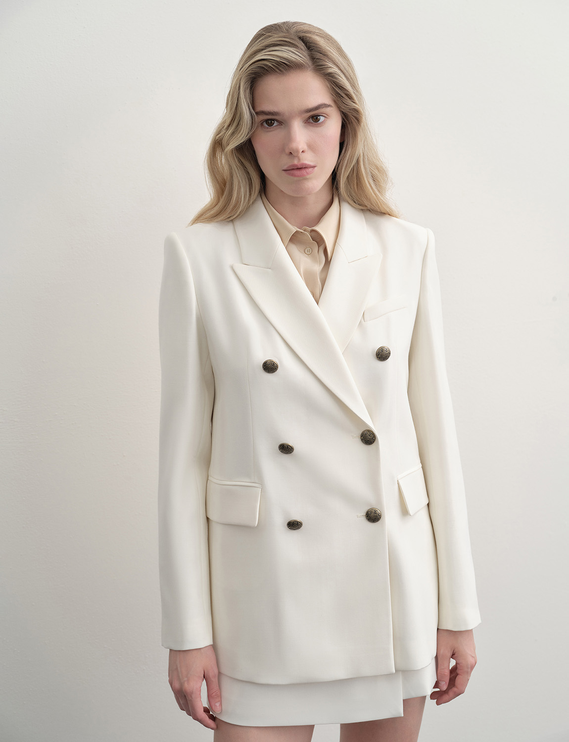 Двубортный жакет прямого кроя из смесовой ткани с шерстью в составе. Классические лацканы и декоративные клапаны придают элегантный вид, а изящные пуговицы на манжетах завершают образ. Жакет сочетается с костюмной группой – брюками, юбками или шортами, а также в качестве второго слоя с топами, блузами и водолазками. Подойдет для создания делового образа или для официального мероприятия. Благодаря содержанию натуральной шерсти, материал жакета обладает высокими тепловыми свойствами, а добавление синтетических волокон делает ткань прочной и долговечной. На модели размер S. Параметры модели: рост 174, 86-63-90.