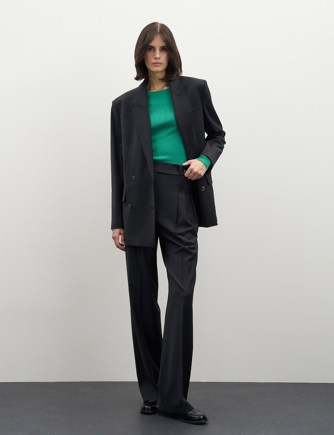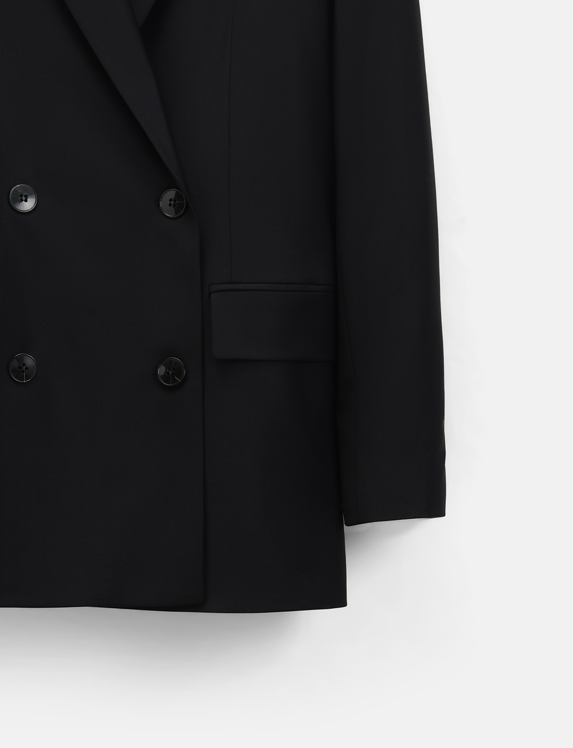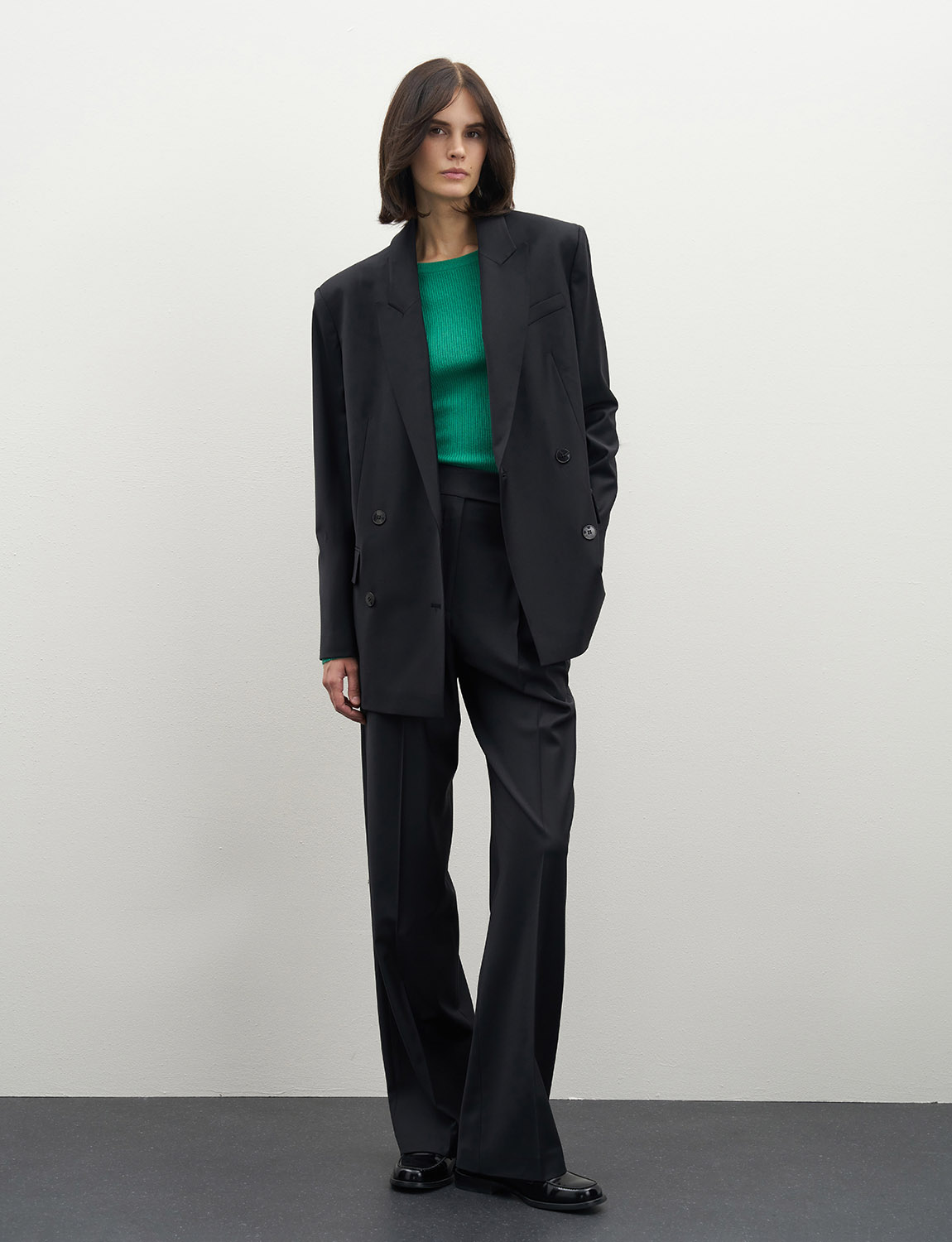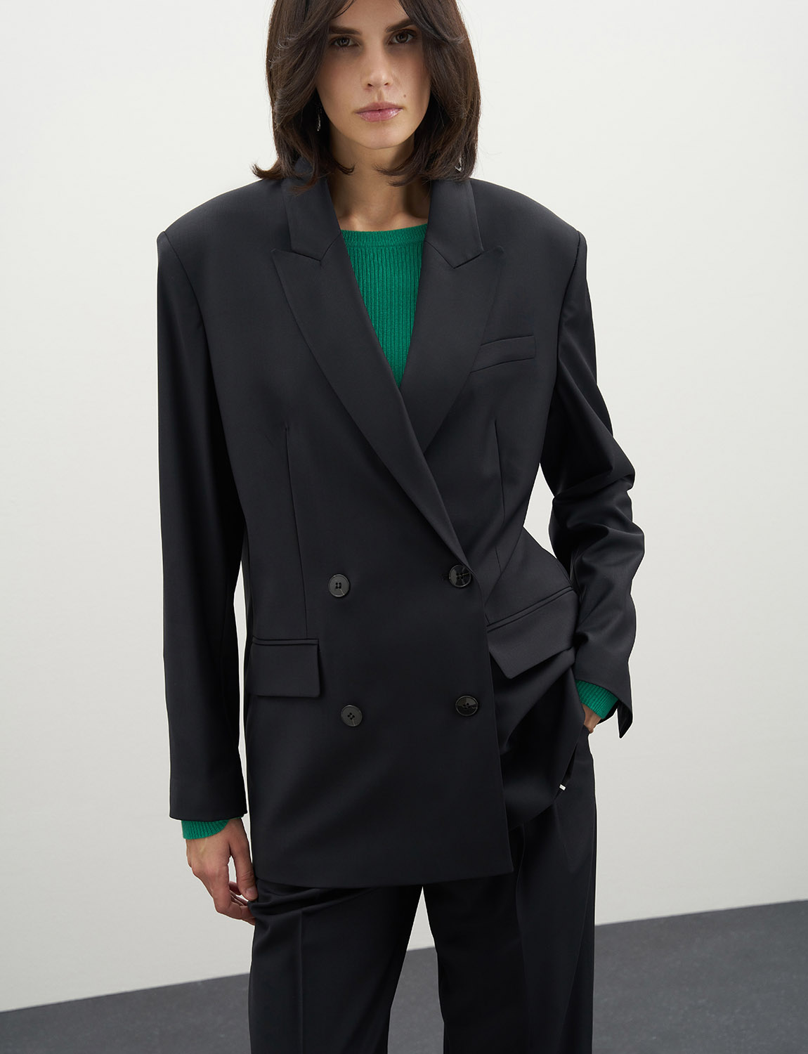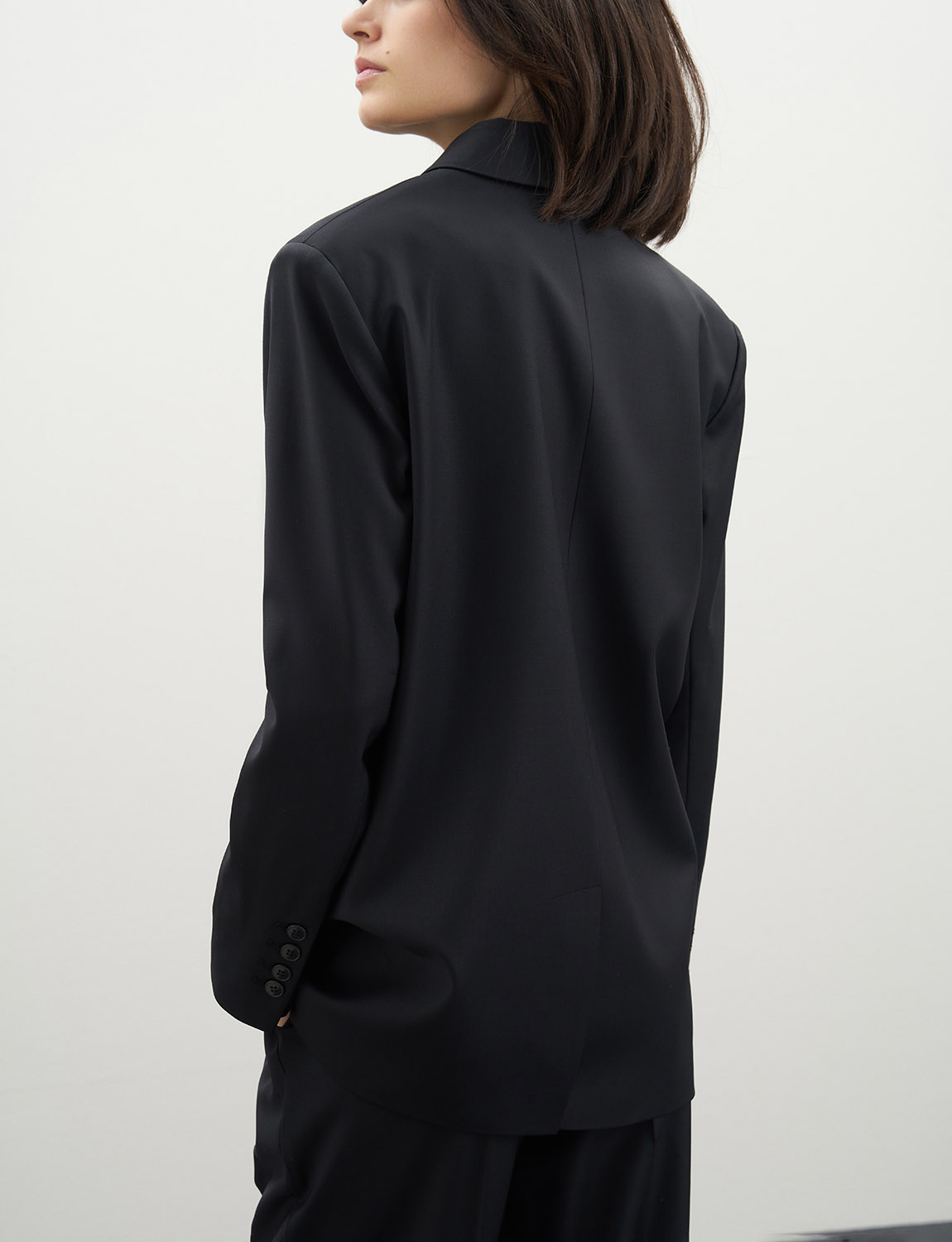 Двубортный костюмный жакет прямого кроя из натуральной шерсти. Классический ворот с лацканами, плотная дышащая подкладка, шлица по спинке. Жакет со временем не растянется и не потеряет свои первоначальные свойства, подойдет для работы, офиса, для деловых и вечерних мероприятий. Удачно будет сочетаться с классическими прямыми брюками, топами и блузами, туфлями-лодочками или лоферами. На модели размер S. Параметры модели: рост 179, 75-59-87.