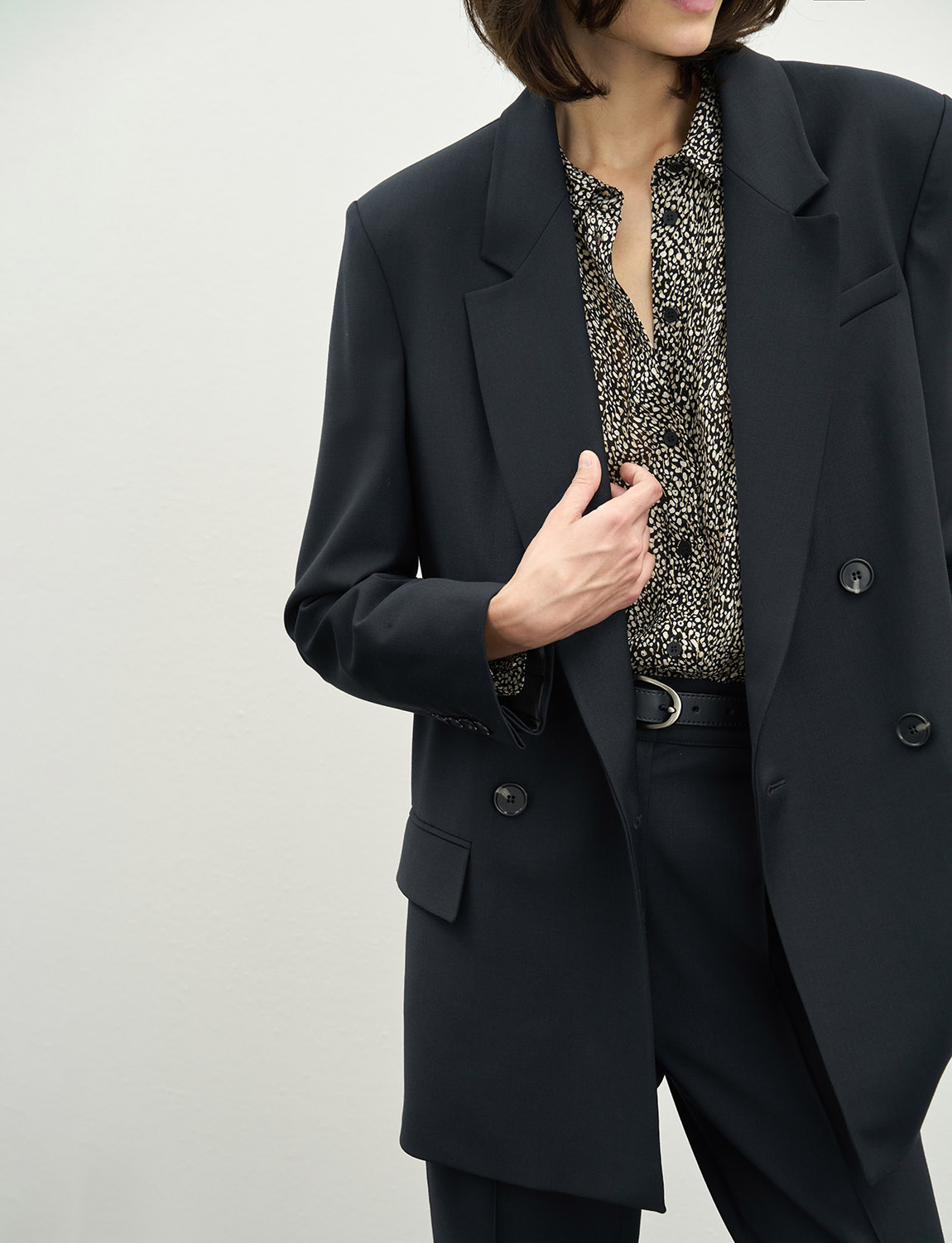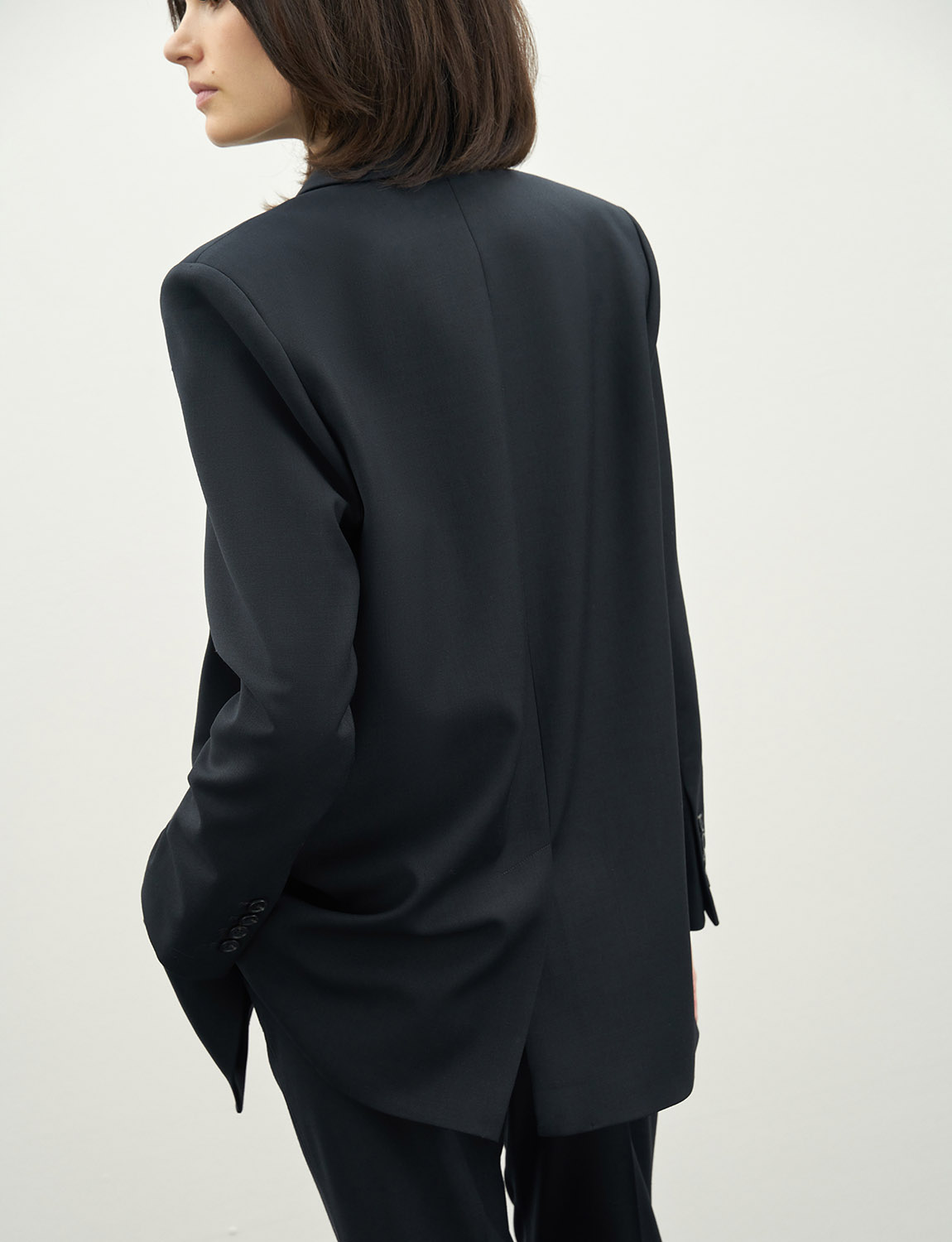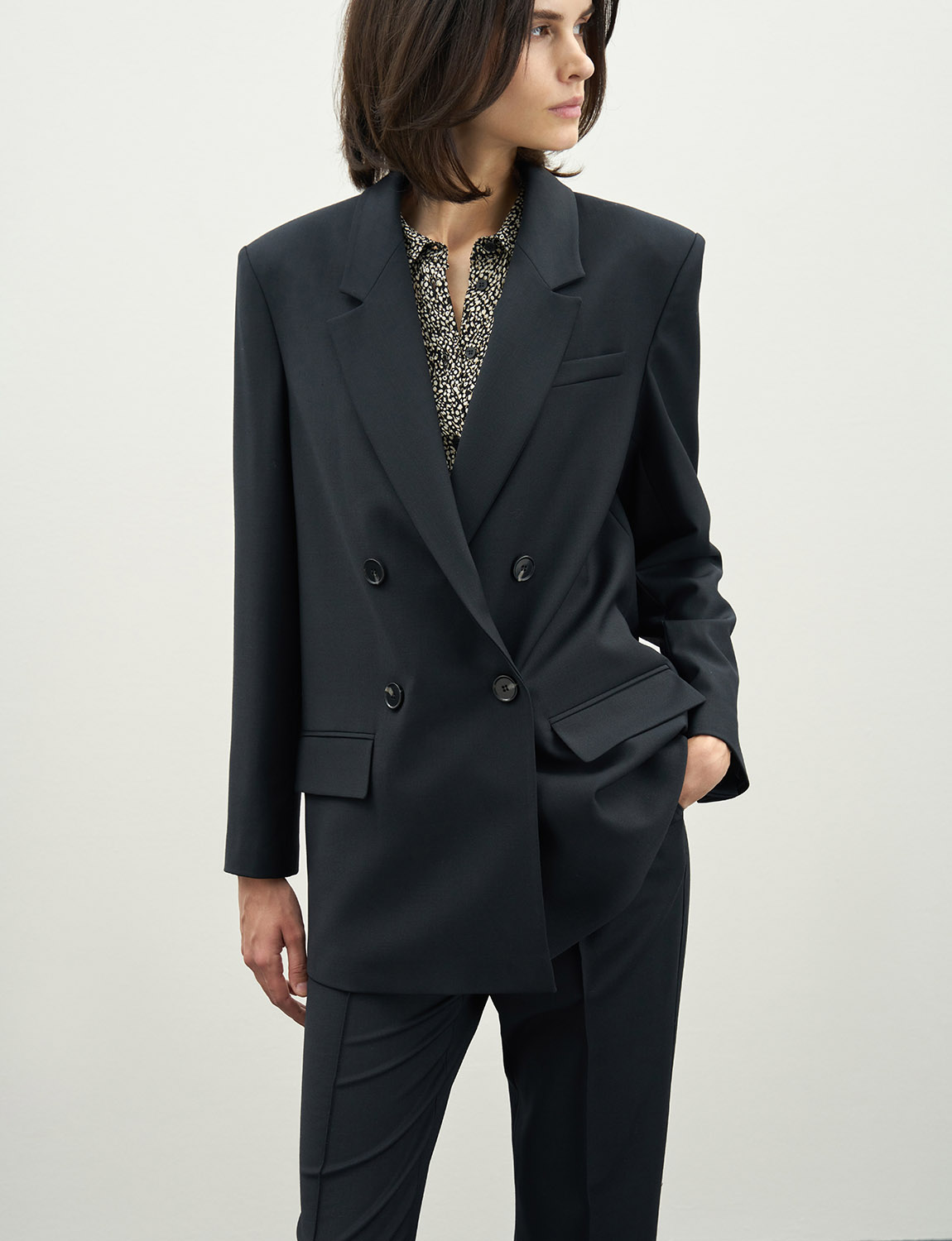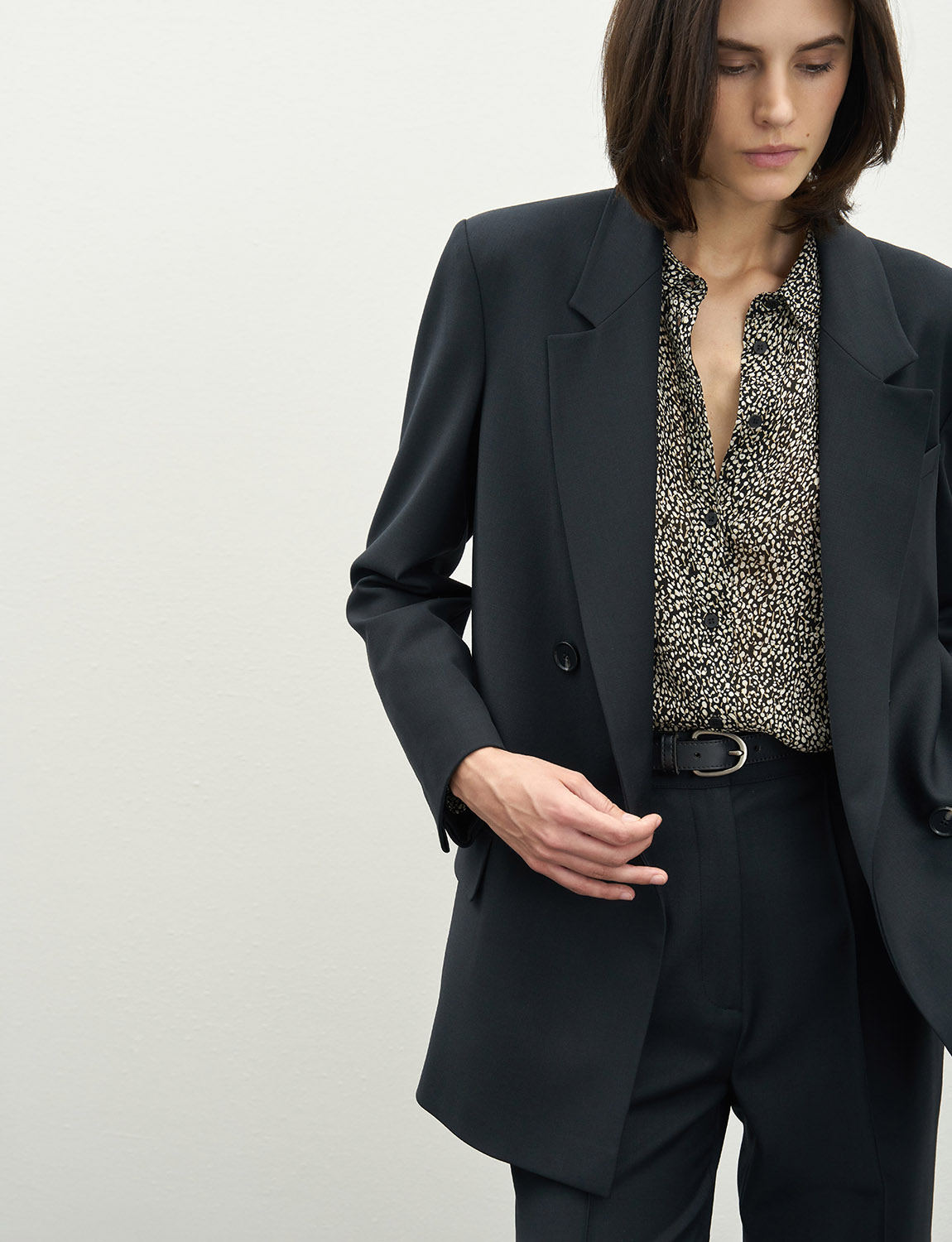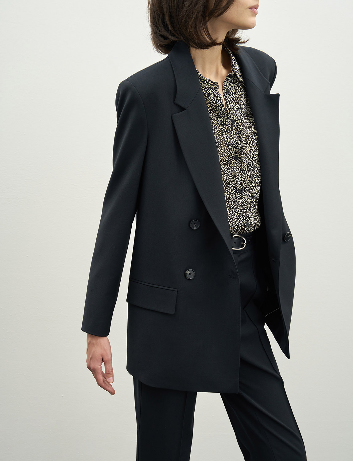 Двубортный костюмный жакет прямого кроя с натуральной шерстью в составе. Классический ворот с лацканами, плотная дышащая подкладка, шлица по спинке, подплечники, благодаря которым жакет держит форму и сидит по фигуре. Жакет со временем не растянется и не потеряет свои первоначальные свойства, подойдет для работы, офиса, для деловых и вечерних мероприятий. Удачно будет сочетаться с классическими прямыми брюками, топами и блузами, туфлями-лодочками или лоферами. На модели размер S. Параметры модели: рост 179, 75-59-87.