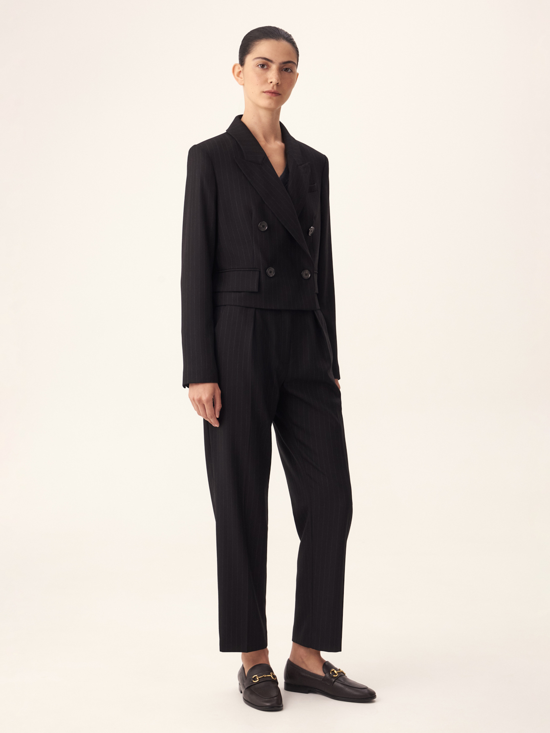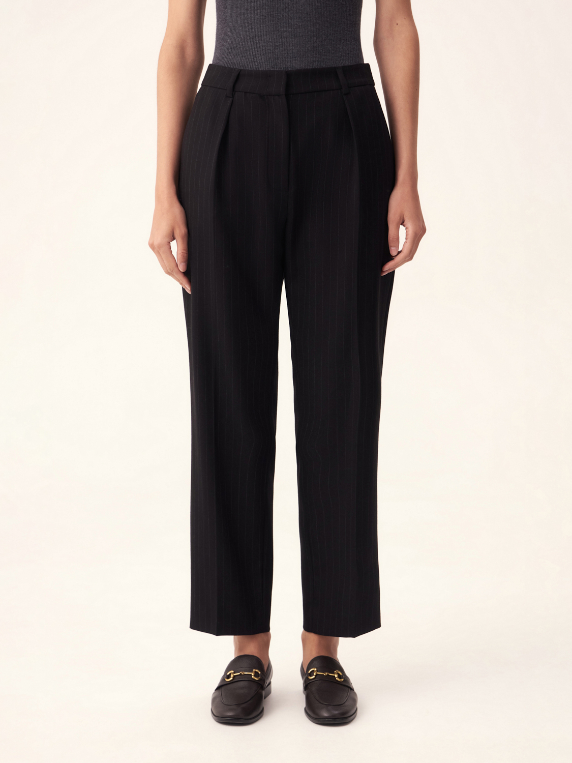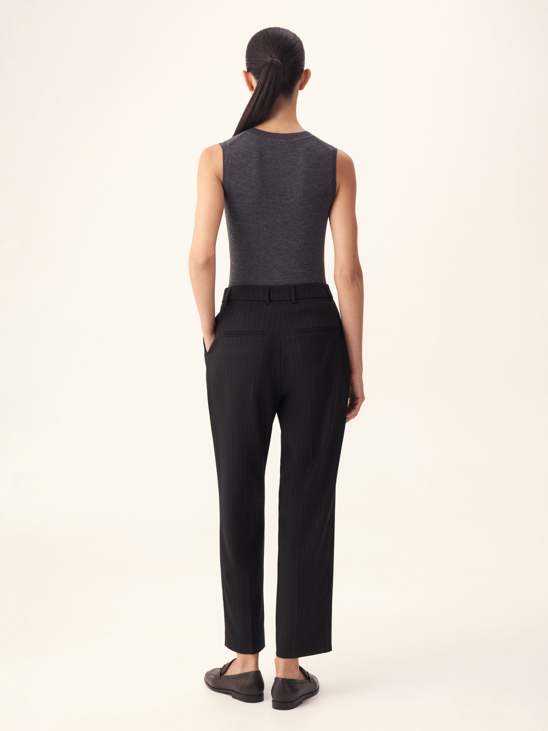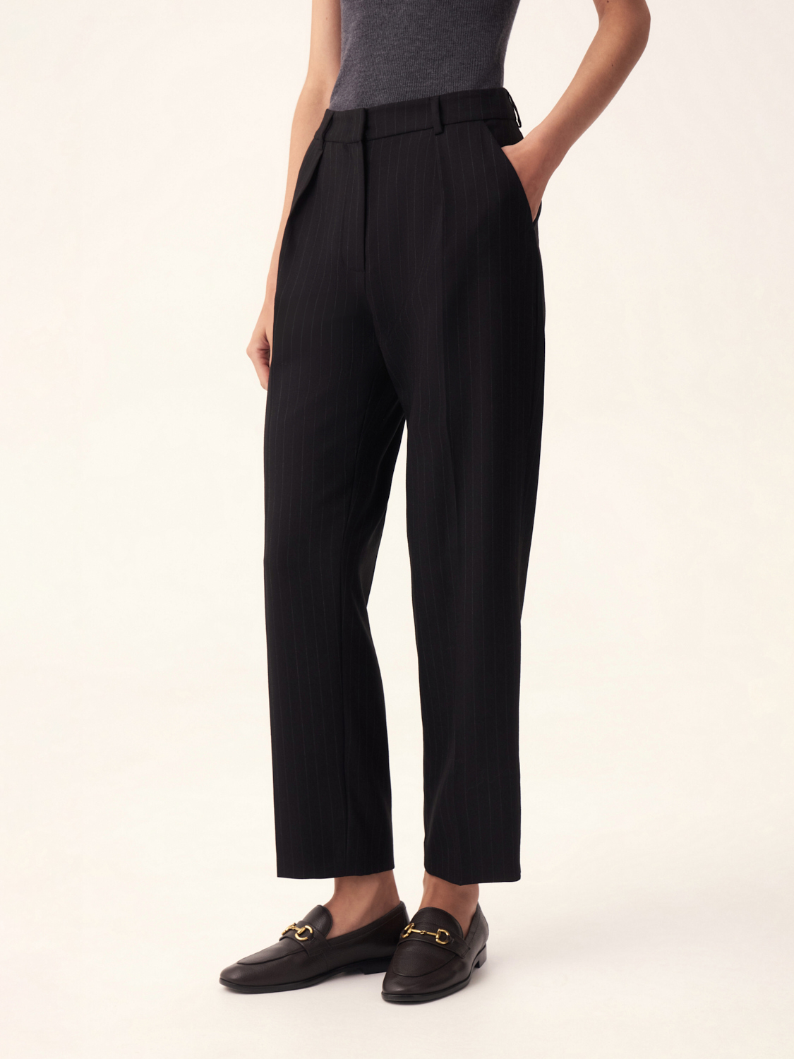 Брюки из шерсти в полоску — воплощение классического стиля с современным акцентом. Высокая посадка и слегка укороченная длина создают элегантный и утонченный силуэт, который подчеркивает женственность и при этом обеспечивает комфорт. Тонкая вертикальная полоска визуально вытягивает ноги, добавляя образу стройности. Брюки оснащены боковыми карманами и скрытой застежкой, что добавляет им функциональности, оставаясь при этом в рамках минималистичного дизайна. Эти брюки станут отличным выбором как для деловых встреч, так и для повседневного гардероба, сочетаясь с различными топами и жакетами. На модели размер S.