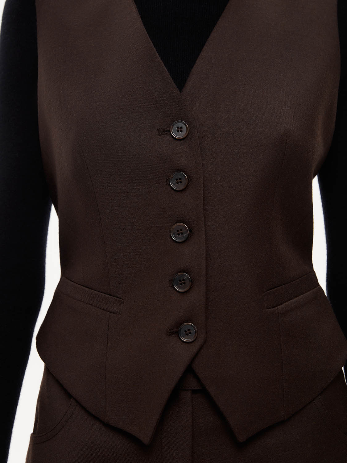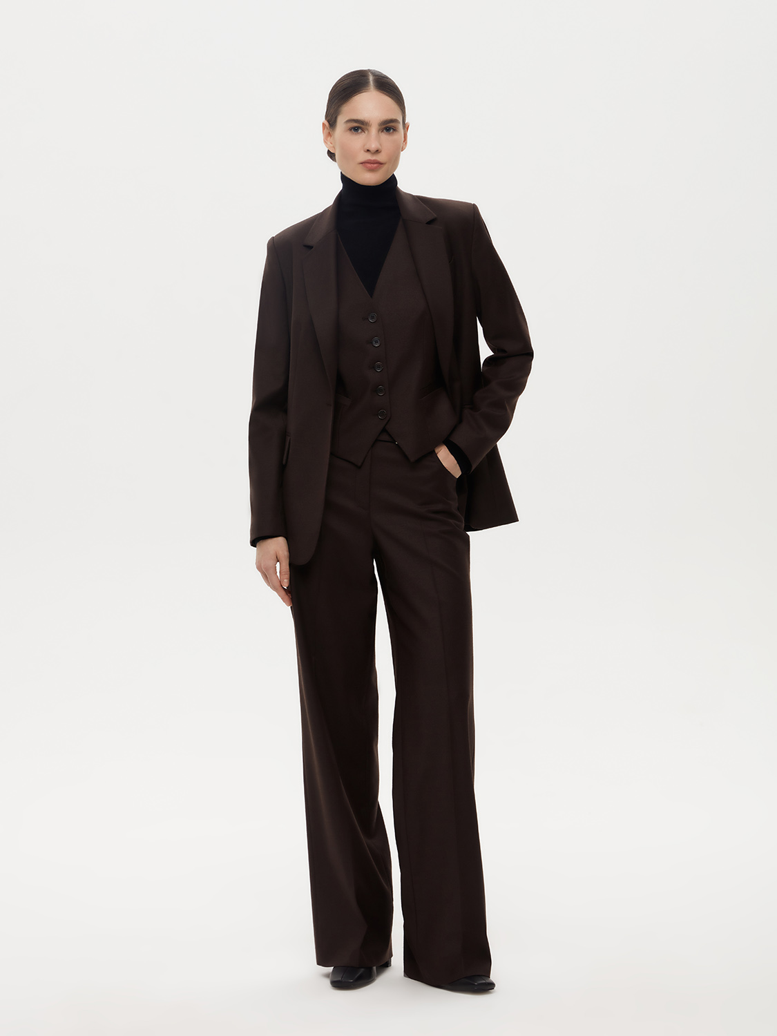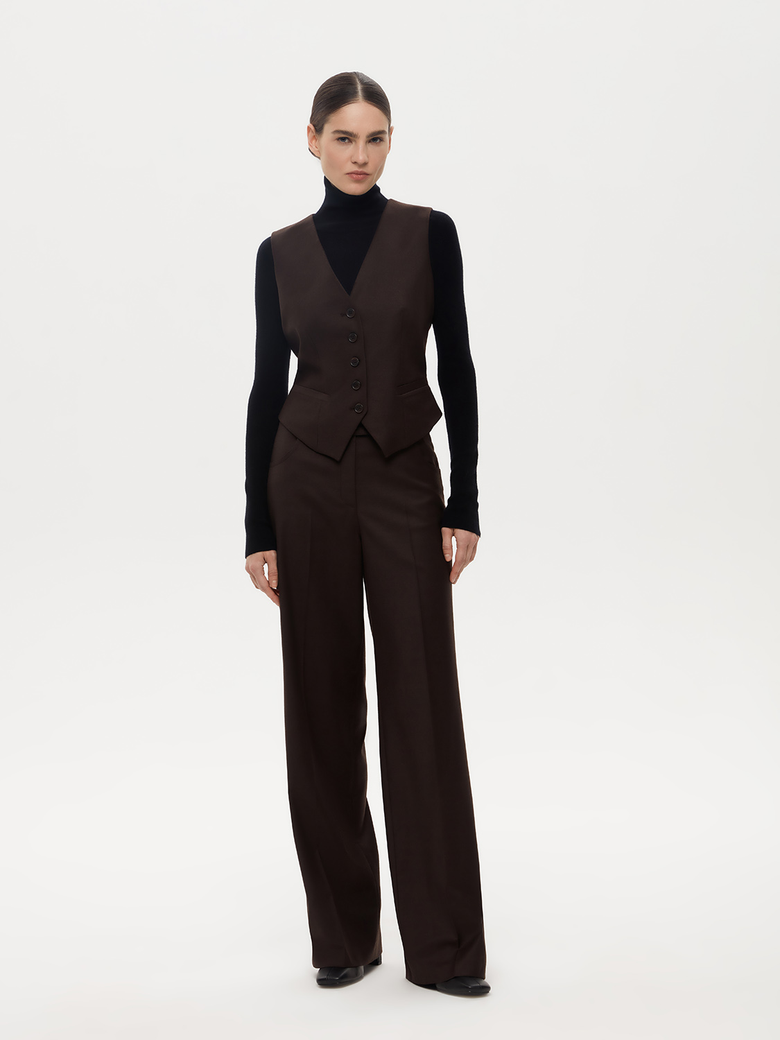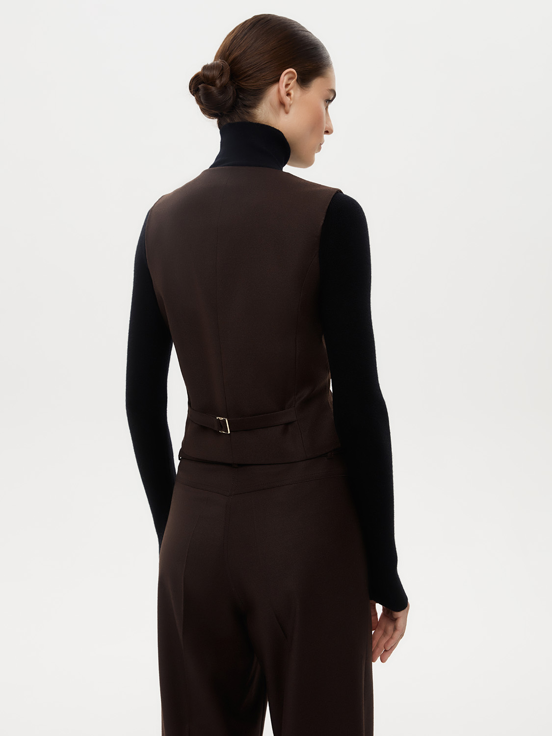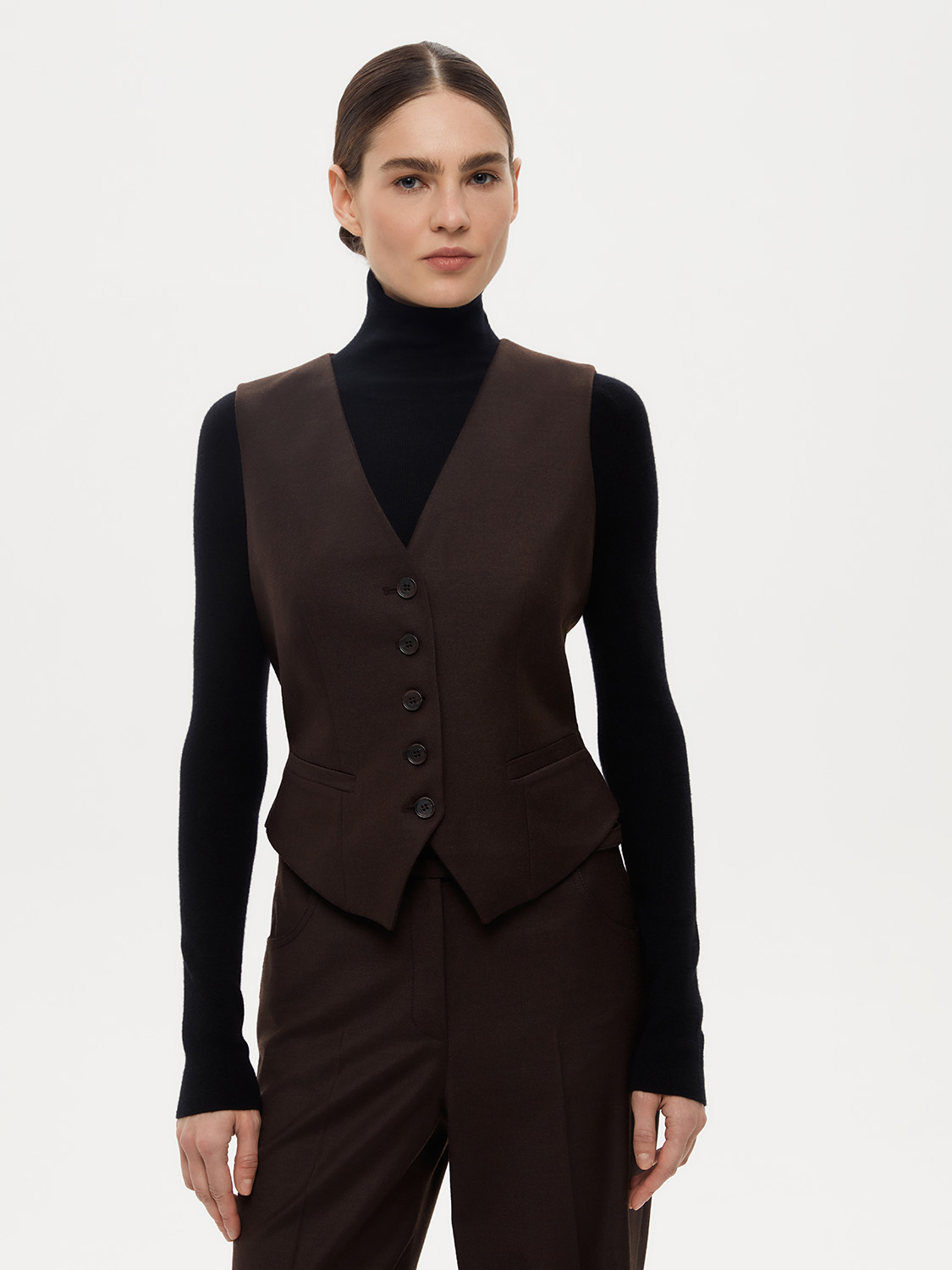 Костюмная жилетка из смесовой натуральной шерсти. Благодаря приталенному крою и V-образному вырезу, она подчеркивает фигуру и придает образу элегантности. Хлястик на спине регулирует прилегание. Смесовая ткань с добавлением натуральной шерсти прочная, износостойкая и теплая. Жилетка сочетается с костюмной группой - брюками, юбками, шортами, также подойдет первым слоем под жакет и вторым слоем с водолазкой или джемпером. Жилетка дополнит деловой и офисный образ, а также подойдет для вечерних выходов. На модели размер S. Параметры модели: рост 176, 84-60-89.