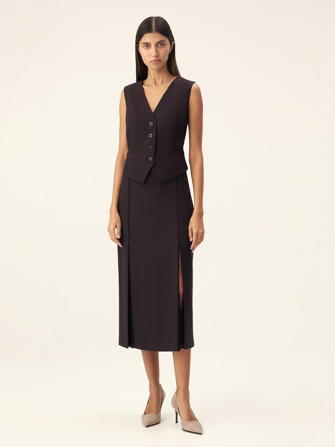Костюмная жилетка с приталенным силуэтом и V-образным вырезом, который визуально удлиняет фигуру. Регулируемый ремешок на спине позволяет подогнать жилетку по фигуре для идеальной посадки. Благодаря лаконичному дизайну и продуманным деталям, модель легко вписывается в любой гардероб, добавляя нотку элегантности. Жилетка универсальна и легко комбинируется с рубашками, блузками или футболками, создавая разнообразные образы как для офиса, так и для повседневной жизни.