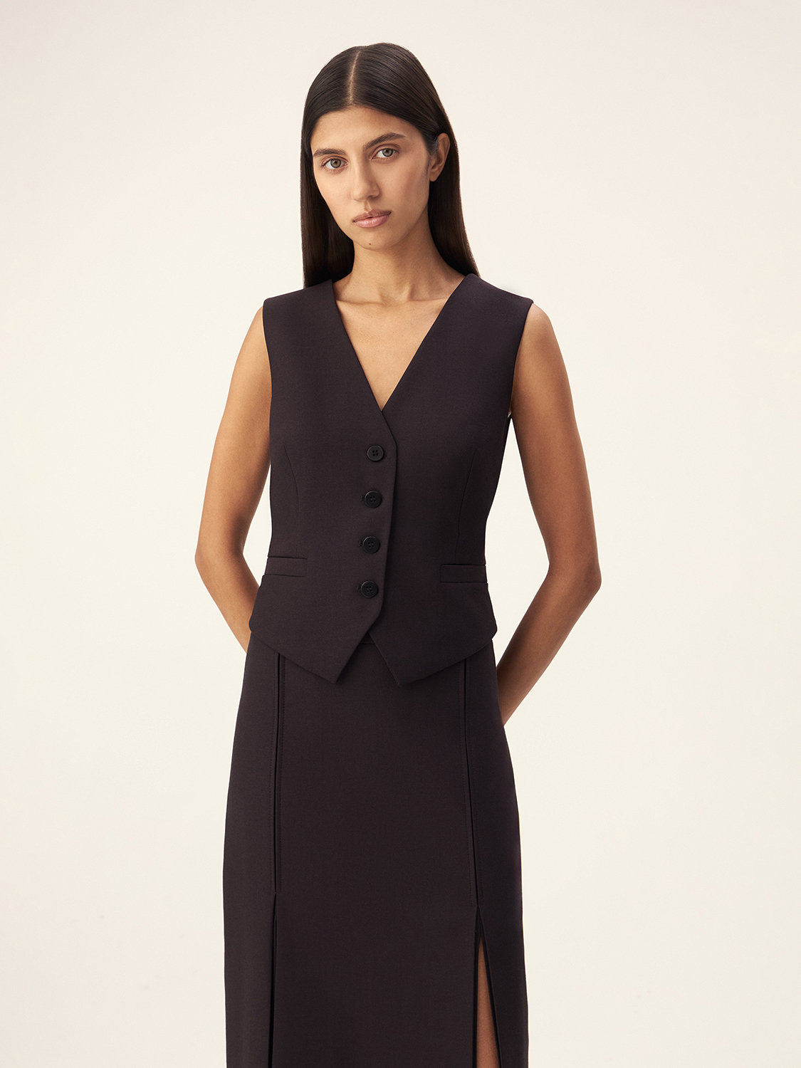 Костюмная жилетка с приталенным силуэтом и V-образным вырезом, который визуально удлиняет фигуру. Регулируемый ремешок на спине позволяет подогнать жилетку по фигуре для идеальной посадки. Благодаря лаконичному дизайну и продуманным деталям, модель легко вписывается в любой гардероб, добавляя нотку элегантности. Жилетка универсальна и легко комбинируется с рубашками, блузками или футболками, создавая разнообразные образы как для офиса, так и для повседневной жизни.