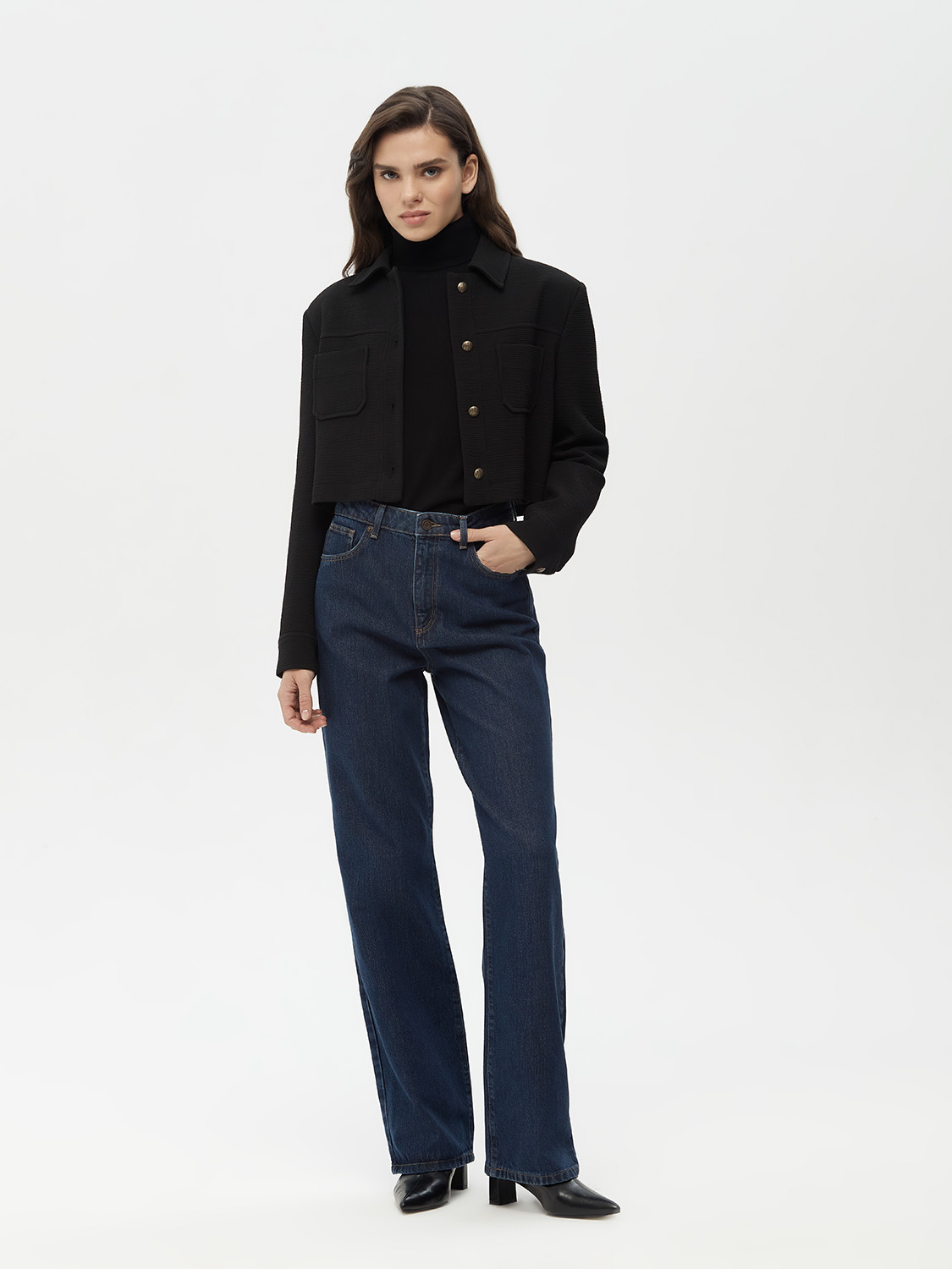 Эти джинсы прямого кроя — идеальный выбор для тех, кто ценит классический стиль и комфорт. Средняя посадка и прямой силуэт создают универсальный образ, который подходит для любого случая. Темно-синий оттенок подчеркивает их элегантность и делает джинсы отличным вариантом как для повседневных, так и для более формальных образов. Высококачественный деним обеспечивает долговечность и комфорт при носке, а классические карманы и застежка на пуговице и молнии добавляют практичности. Носите эти джинсы с рубашками, свитерами или жакетами — они станут базовой вещью в вашем гардеробе, которую легко сочетать с разными элементами одежды. Параметры модели: рост 174 см, размер S.
