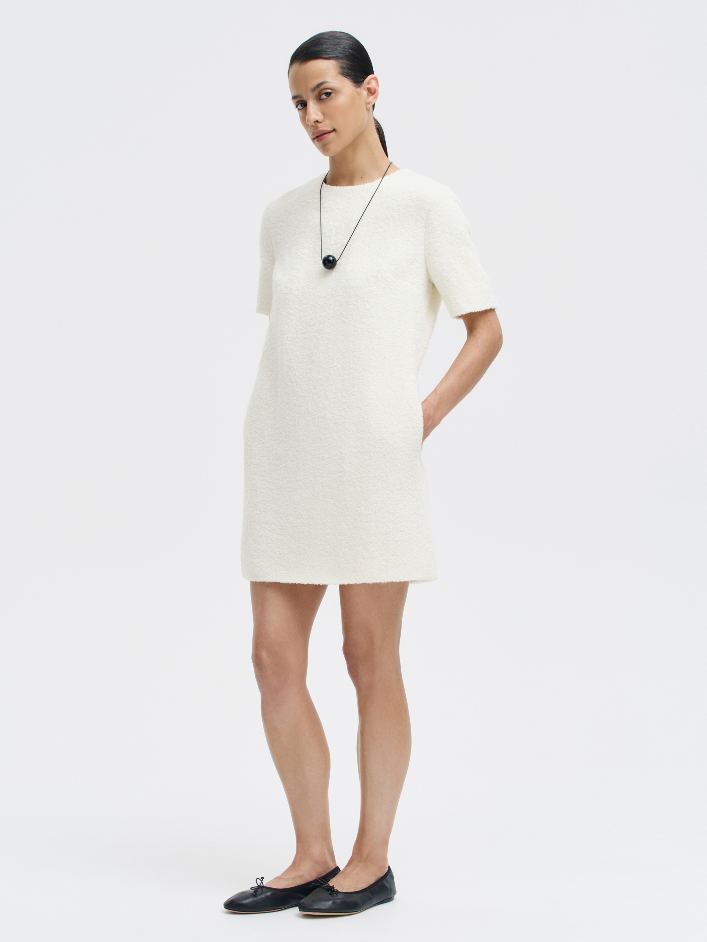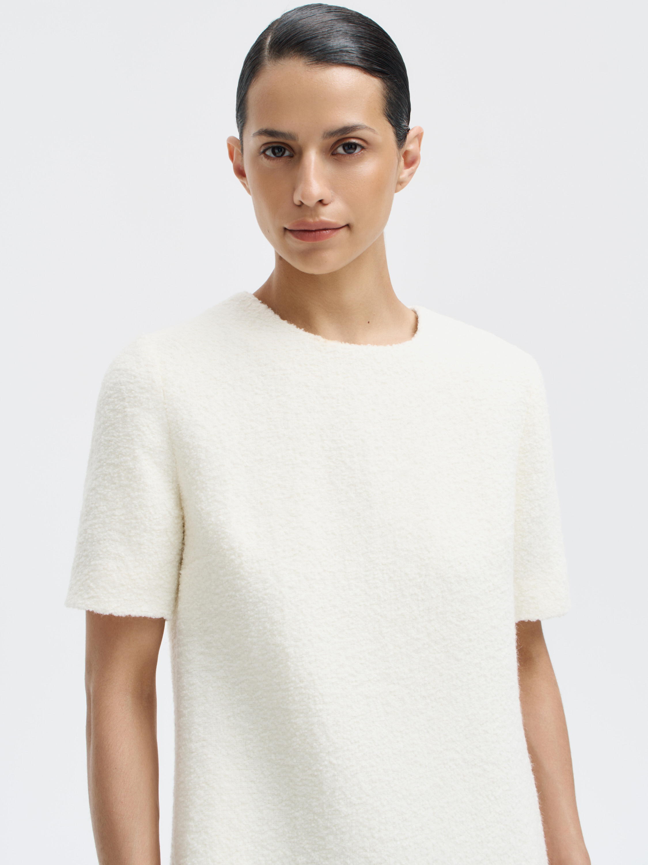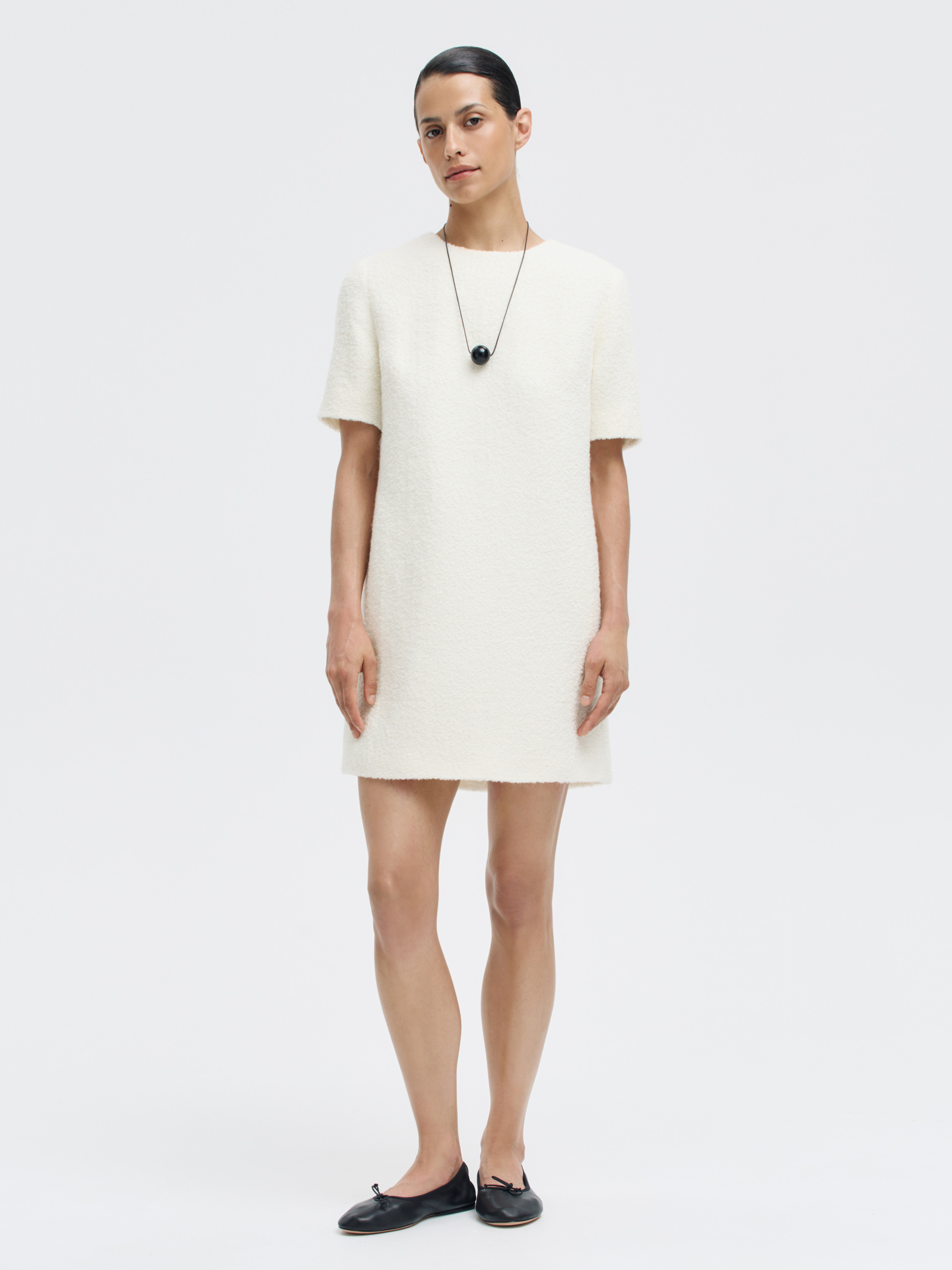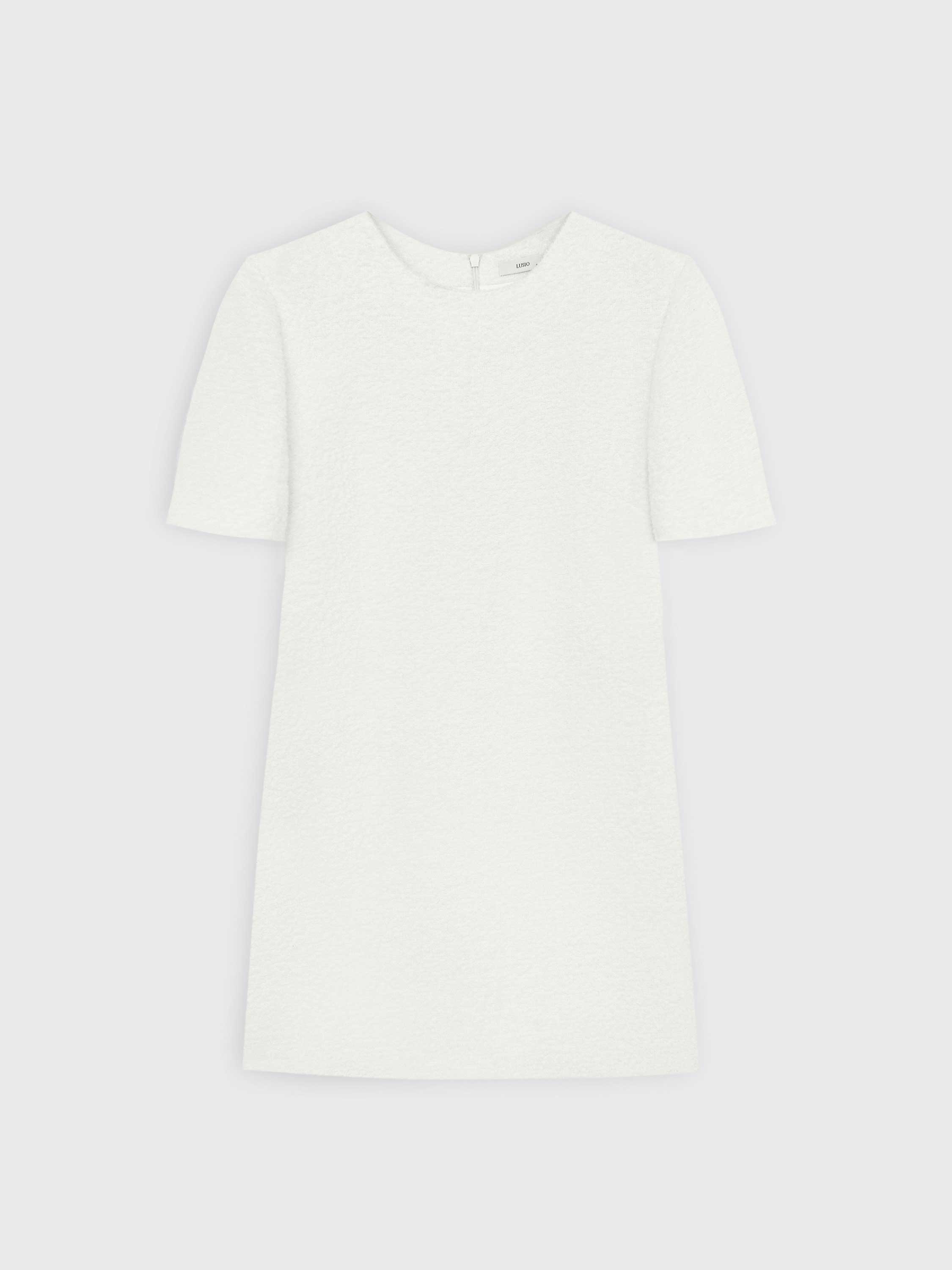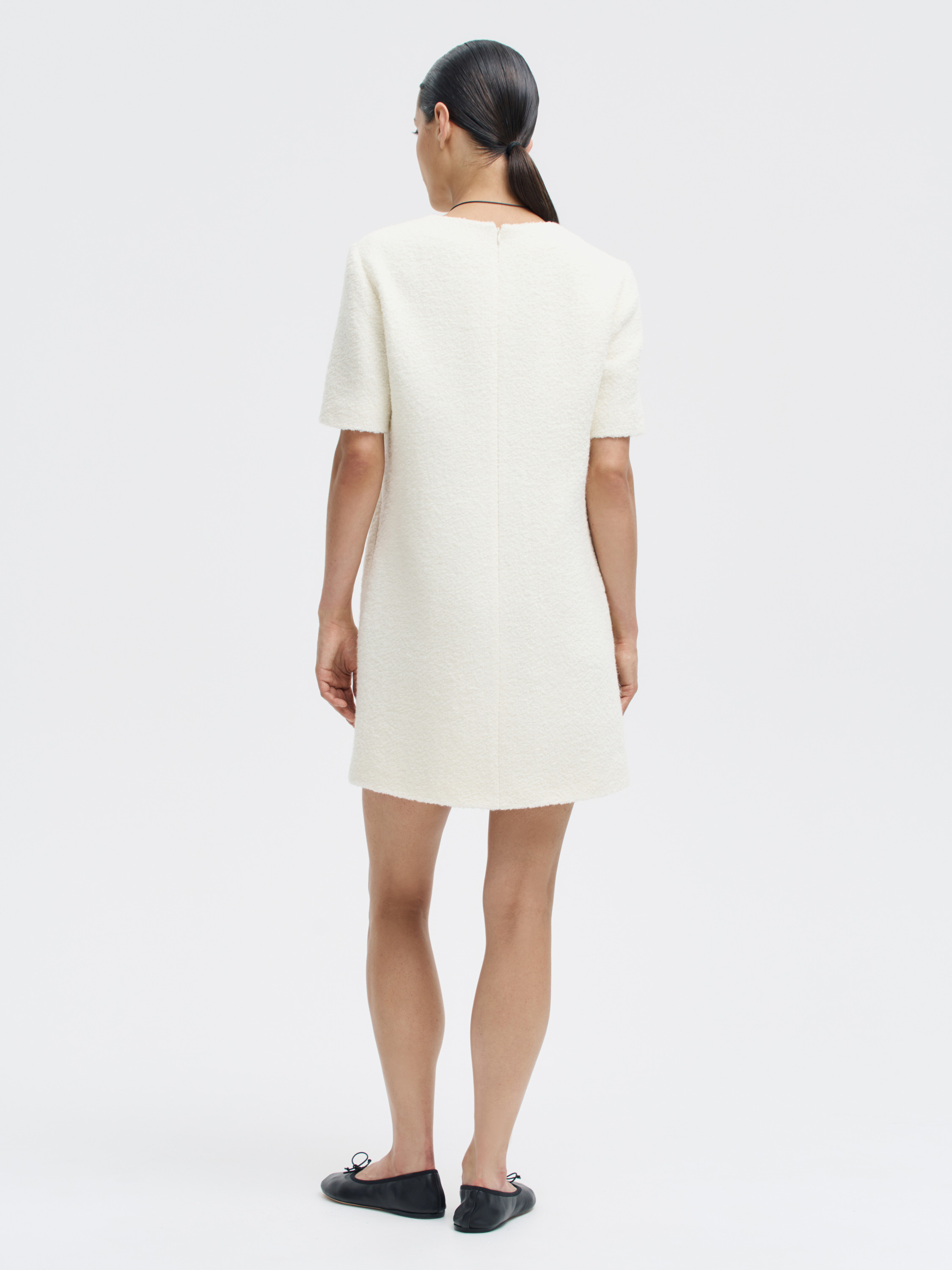Минималистичное платье прямого силуэта из плотного смесового полотна с добавлением шерсти и альпаки. Ткань с легкой зернистой фактурой, плотная и мягкая на ощупь, хорошо держит форму и не просвечивает. Короткие рукава, округлый вырез и чистая линия плеча подчеркивают сдержанный характер кроя. Посадка свободная, комфортная в движении, длина — выше колена. Потайная молния на спинке не нарушает цельности силуэта. Нейтральный оттенок делает вещь универсальной: платье вписывается в повседневный гардероб, органично сочетается с любой верхней одеждой, трикотажем и обувью от балеток до сапог.