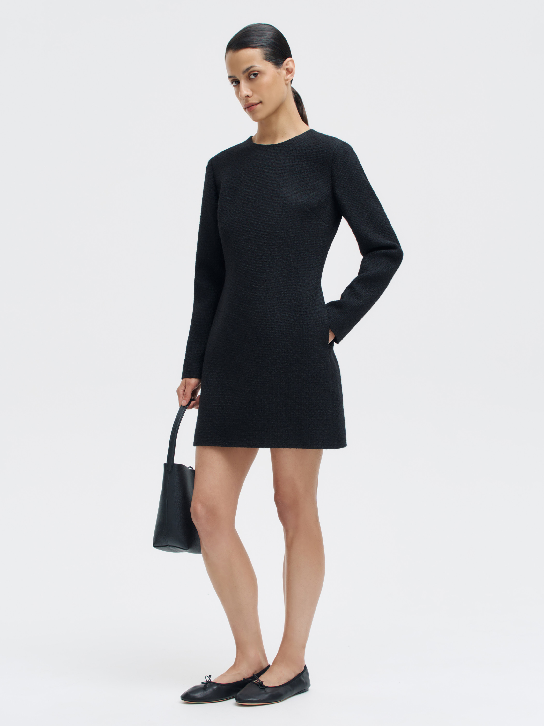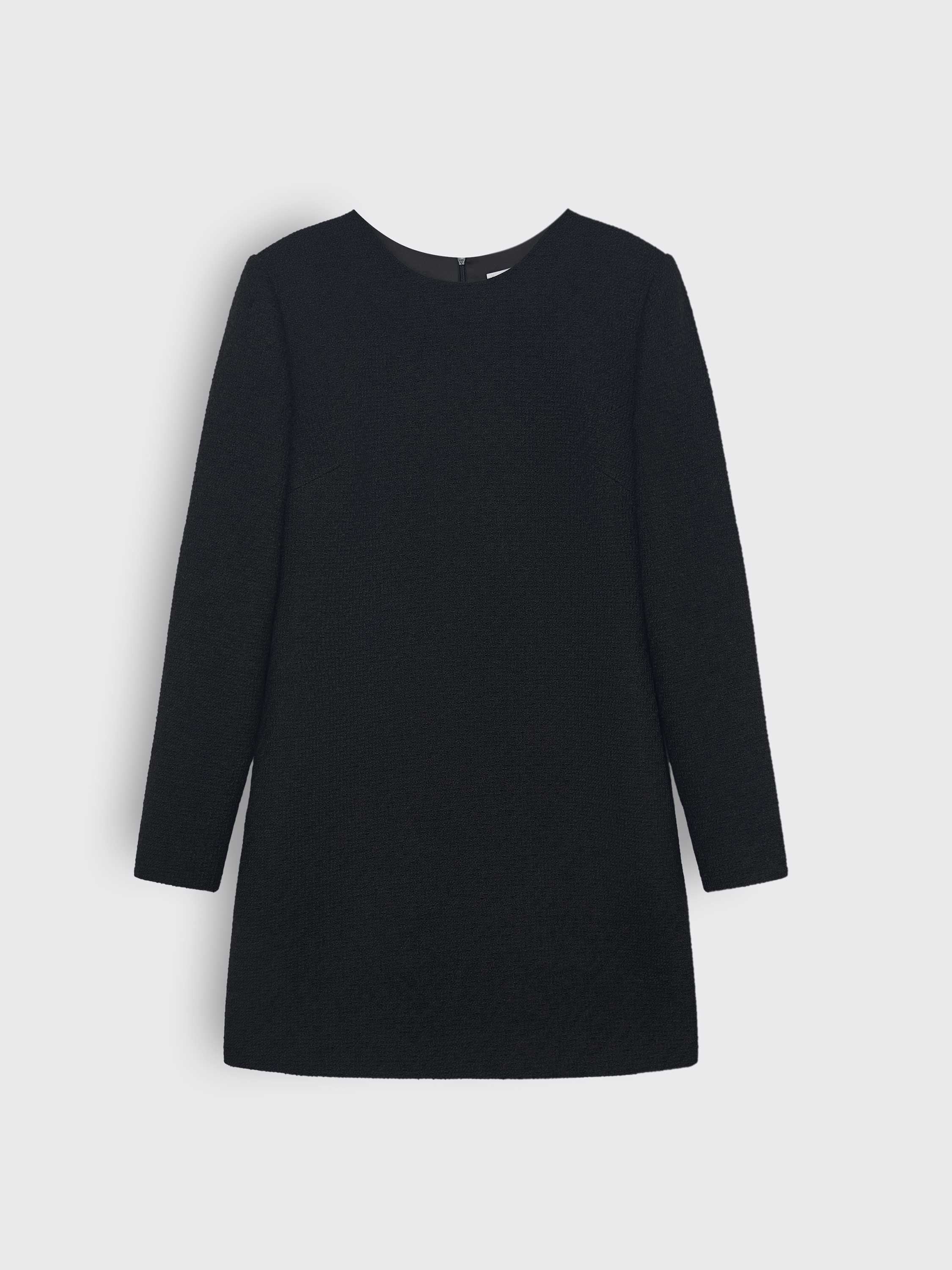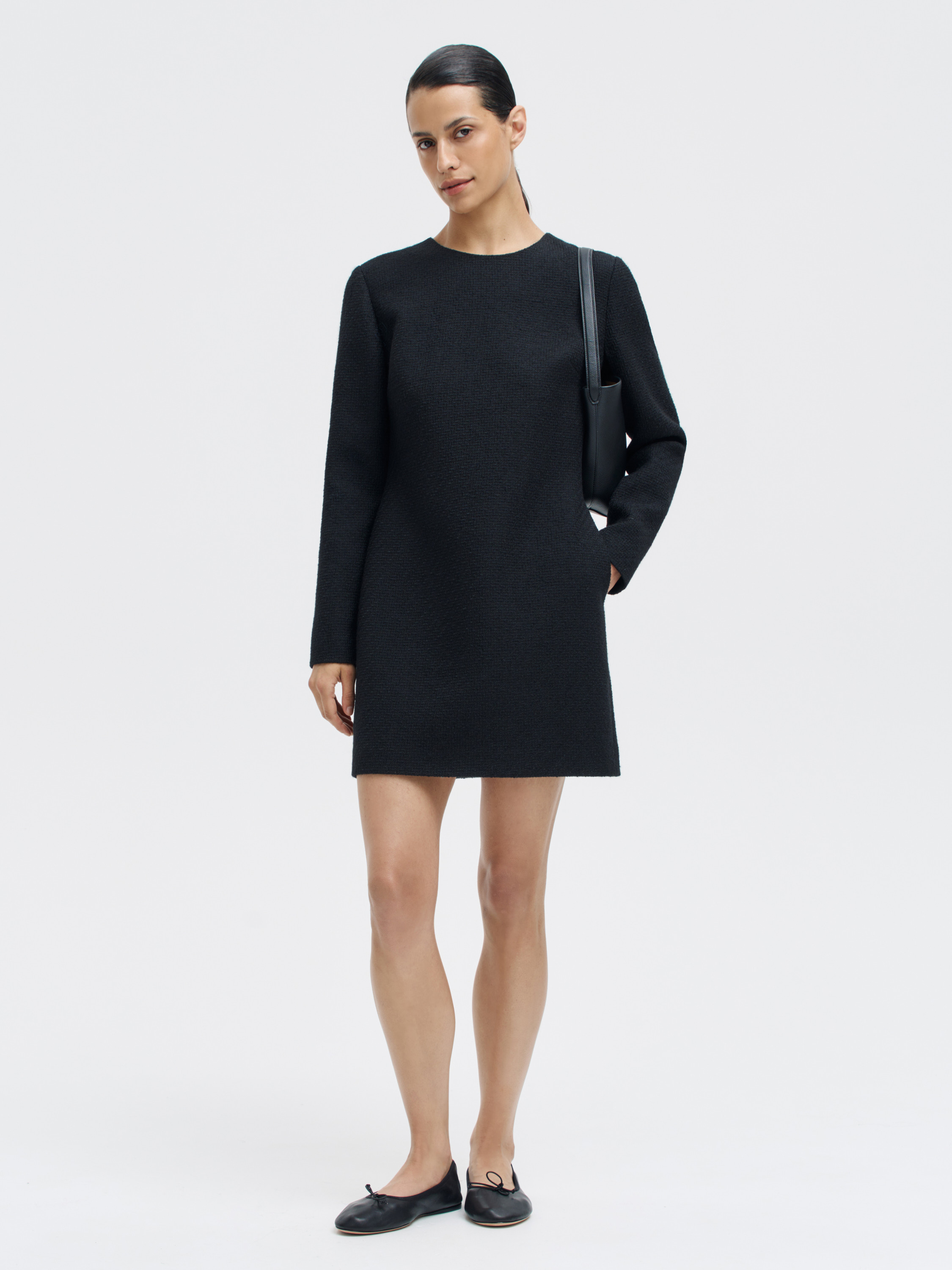 Платье приталенного силуэта из смесовой шерсти с плотной, но мягкой текстурой и едва заметным фактурным плетением. Материал держит форму, не теряя пластичности, благодаря чему модель комфортна в движении и сохраняет аккуратный силуэт в течение дня. Лаконичный крой с округлым вырезом и длинными рукавами подчеркивает чистоту линии и делает акцент на минимализме. Длина мини уравновешивает силуэт и придает образу современное звучание. Платье можно носить как самостоятельную вещь — с высокими сапогами или ботильонами, — или использовать как базовый слой под жакет, кардиган или пальто, создавая элегантные многослойные сочетания.