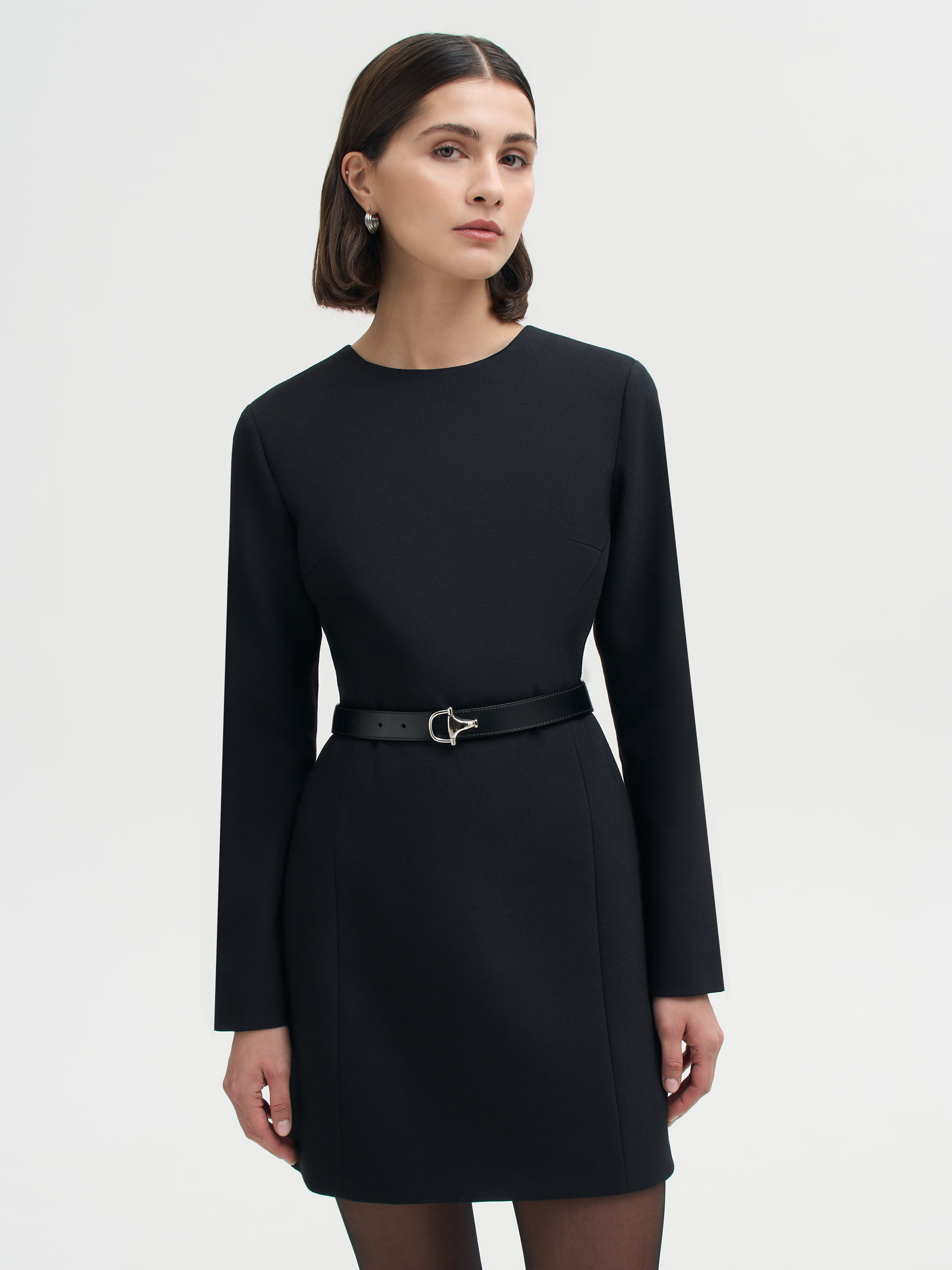 Платье мини из плотной шерстяной ткани — сдержанная и выверенная модель на каждый день. Лаконичный силуэт с длиной выше колена, округлой горловиной и длинными рукавами считывается строго и современно. Плотная, но мягкая ткань держит форму и подходит для прохладного сезона, оставаясь комфортной в носке. В зависимости от стилизации работает как самостоятельная единица или как база в многослойных образах с жакетом, пальто, сапогами или ботинками.
