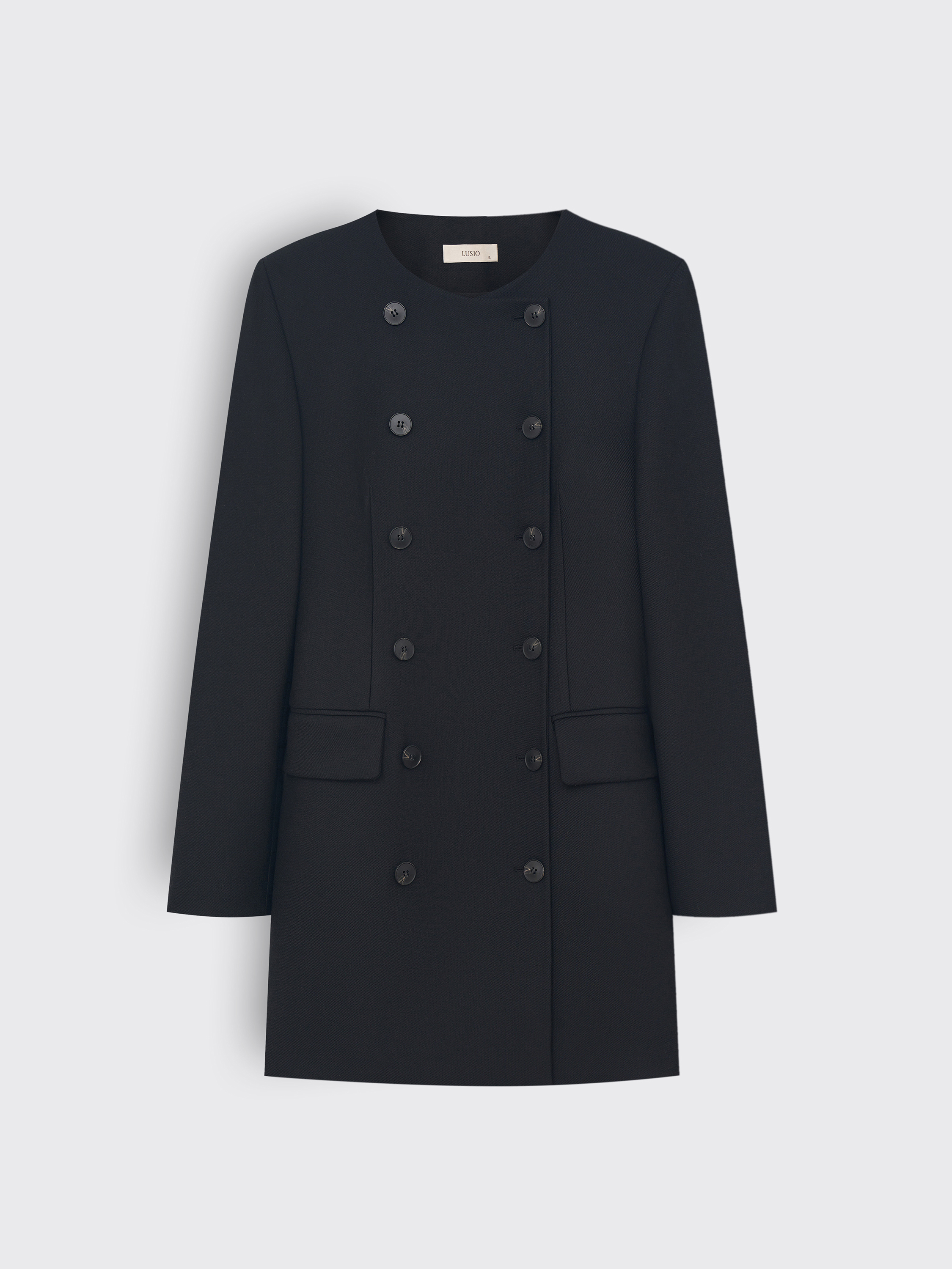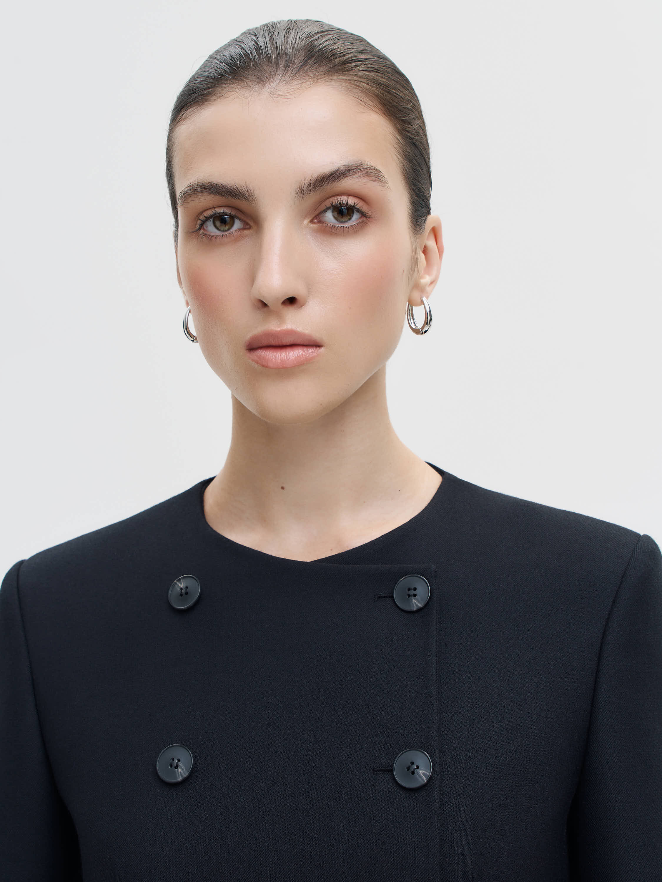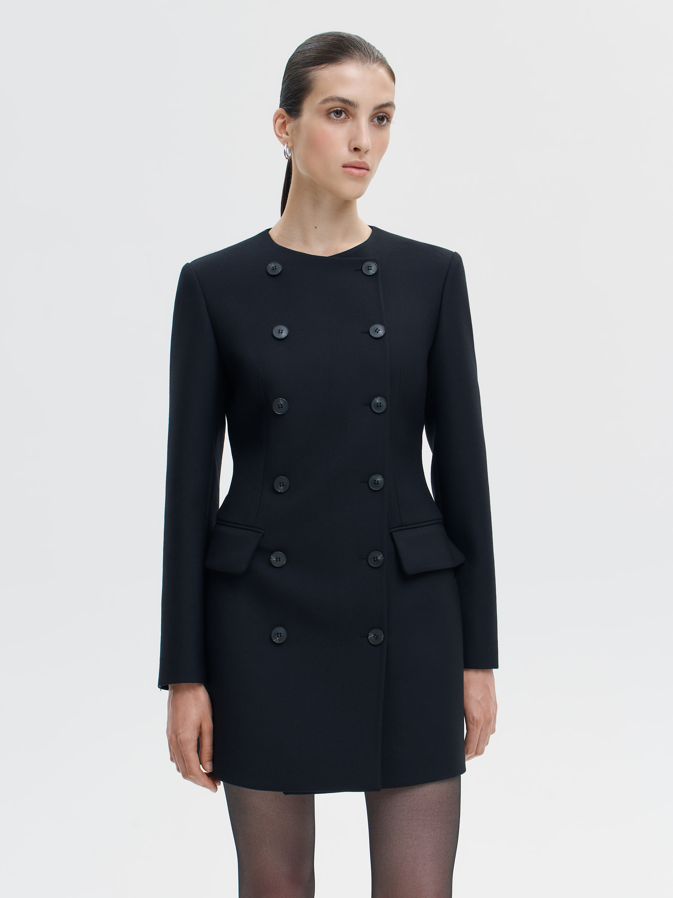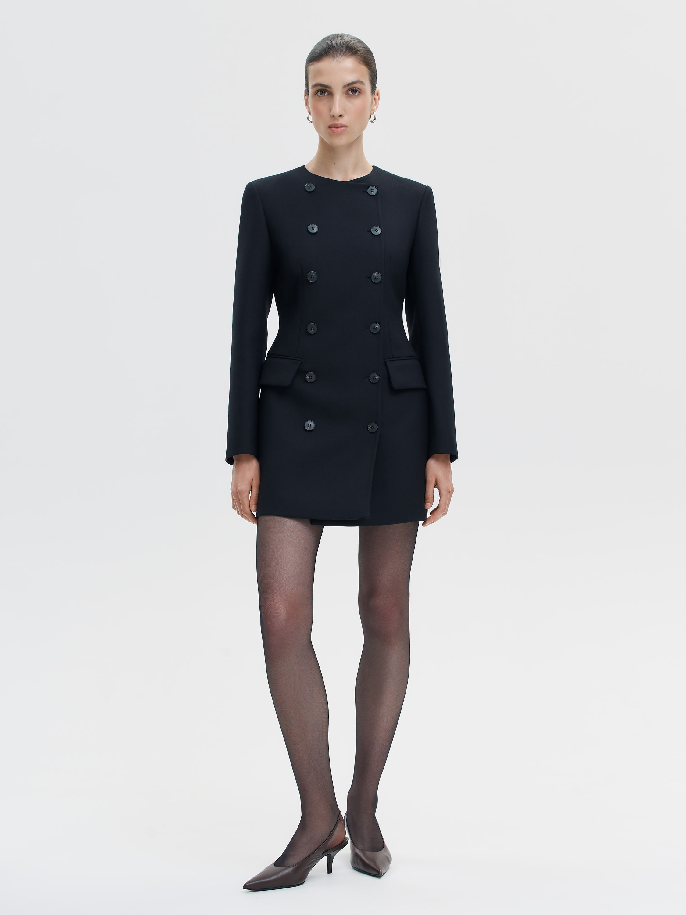 Минималистичное платье-пиджак прямого силуэта. Строгий круглый вырез, двубортная застежка и четкая линия плеч — основа выверенного образа без лишнего декора. Плотная костюмная ткань с добавлением шерсти держит форму, подчеркивая архитектуру кроя. Можно носить как самостоятельный акцент или в сочетании с брюками, в зависимости от настроения и контекста.