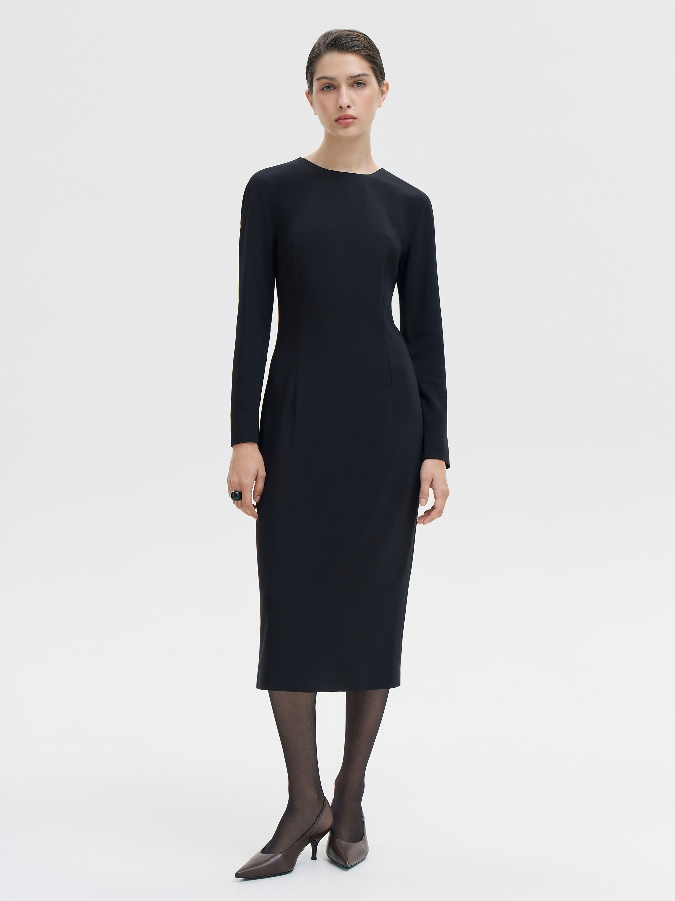 Платье миди с лаконичным круглым вырезом и длинными рукавами. Плотная костюмная ткань с высоким содержанием района мягко ложится по фигуре, органично подчеркивая силуэт. Приталенный крой подчеркнут вытачками и центральным швом, а потайная молния сзади сохраняет чистоту линии спины. Длина чуть ниже колена — оптимальна для демисезона и офисного гардероба.